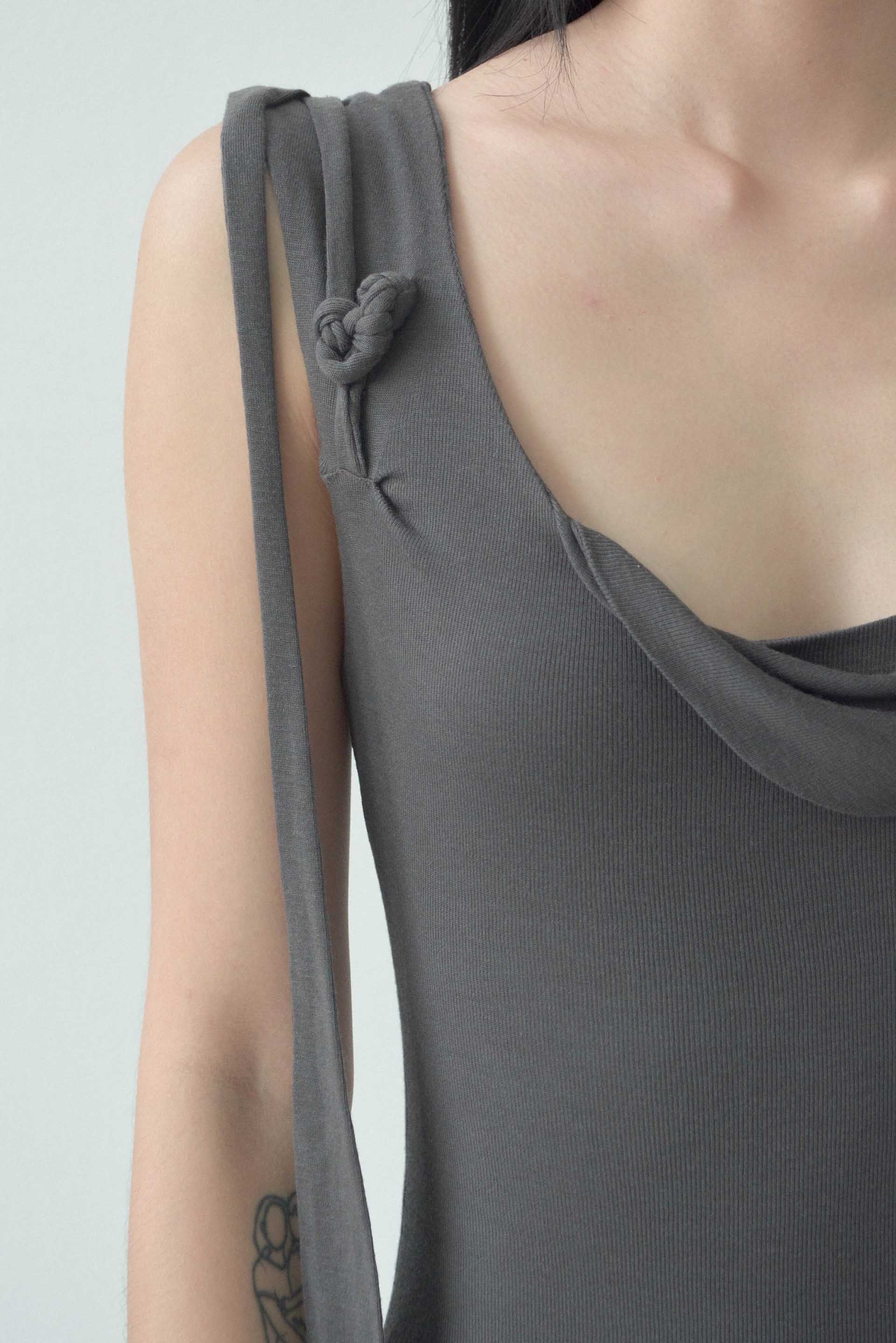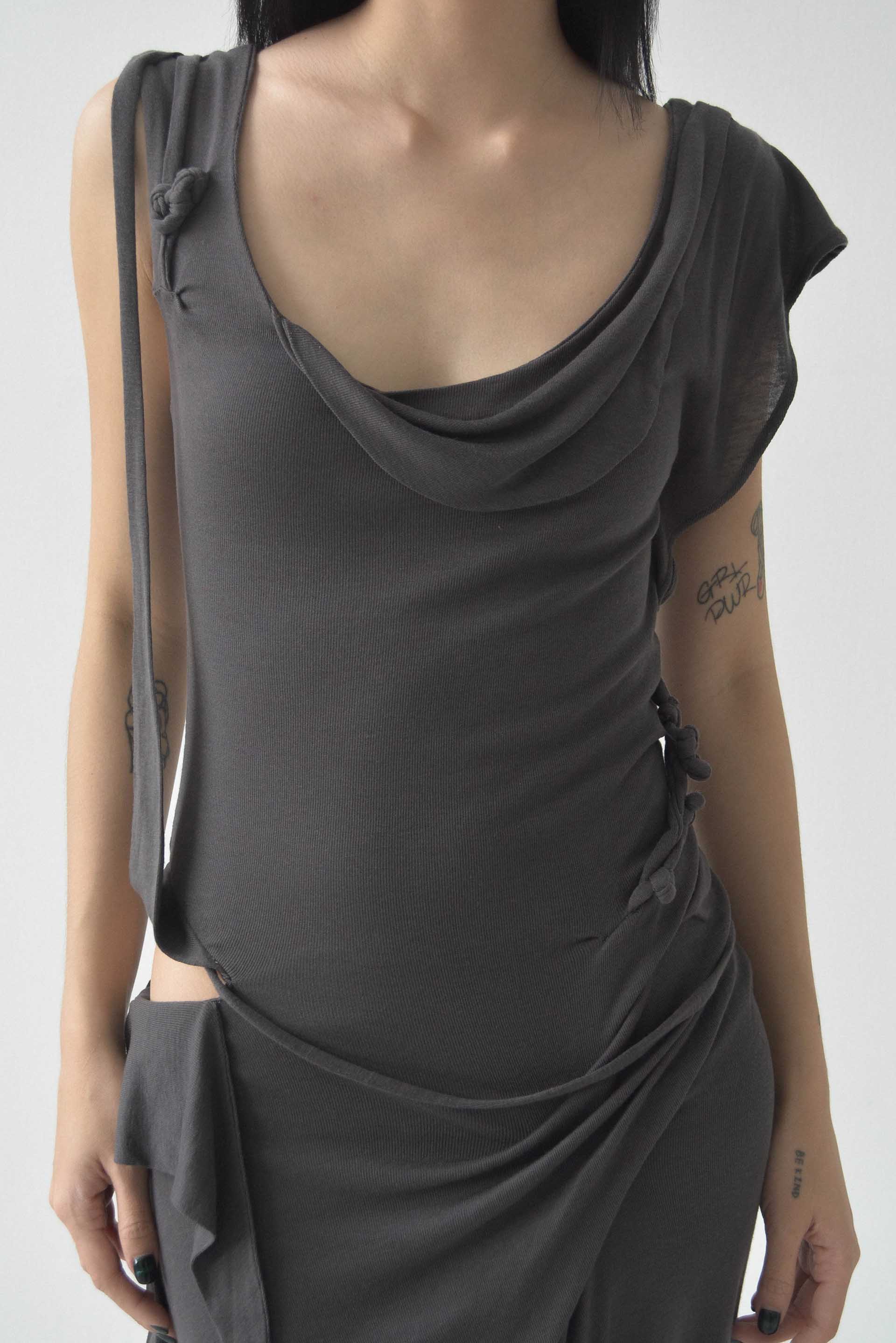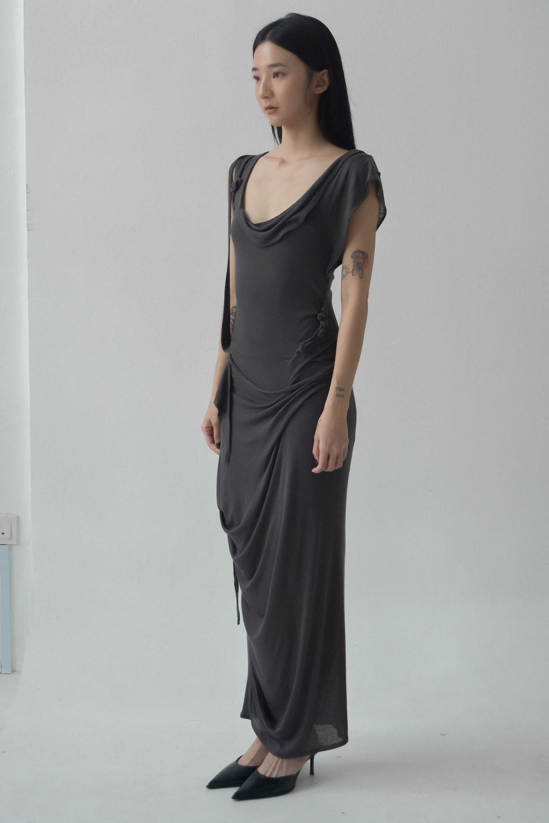 The Morph Grey Dress is a fitted jersey design featuring asymmetrical draping, cut-out, braided accents, and hanging strap details.
