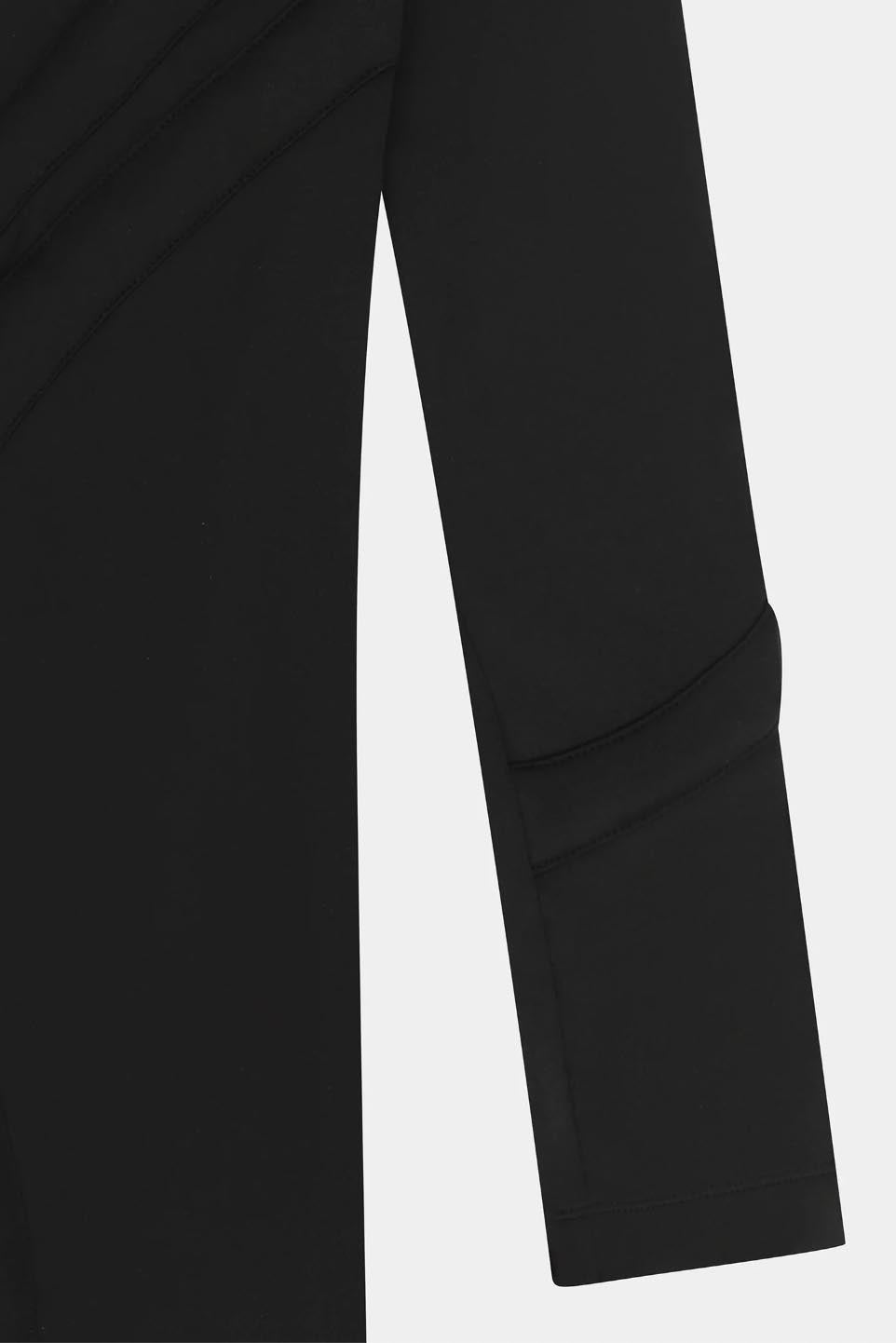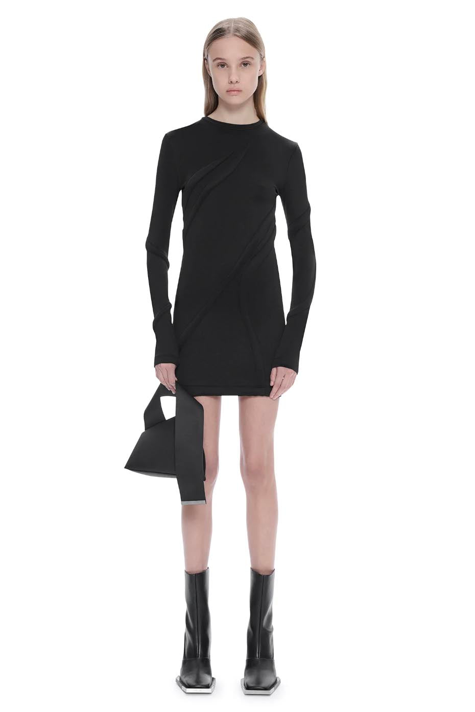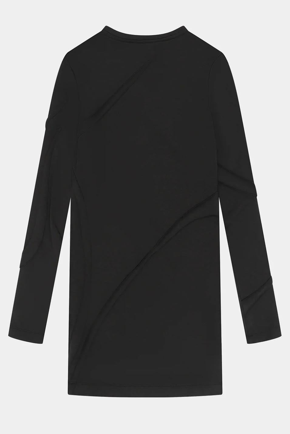 Body hugging dress with organic padding details & long sleeves. Slim fit. Lightweight jersey. Asymmetric padding detailing on body and sleeves. Organic shapes