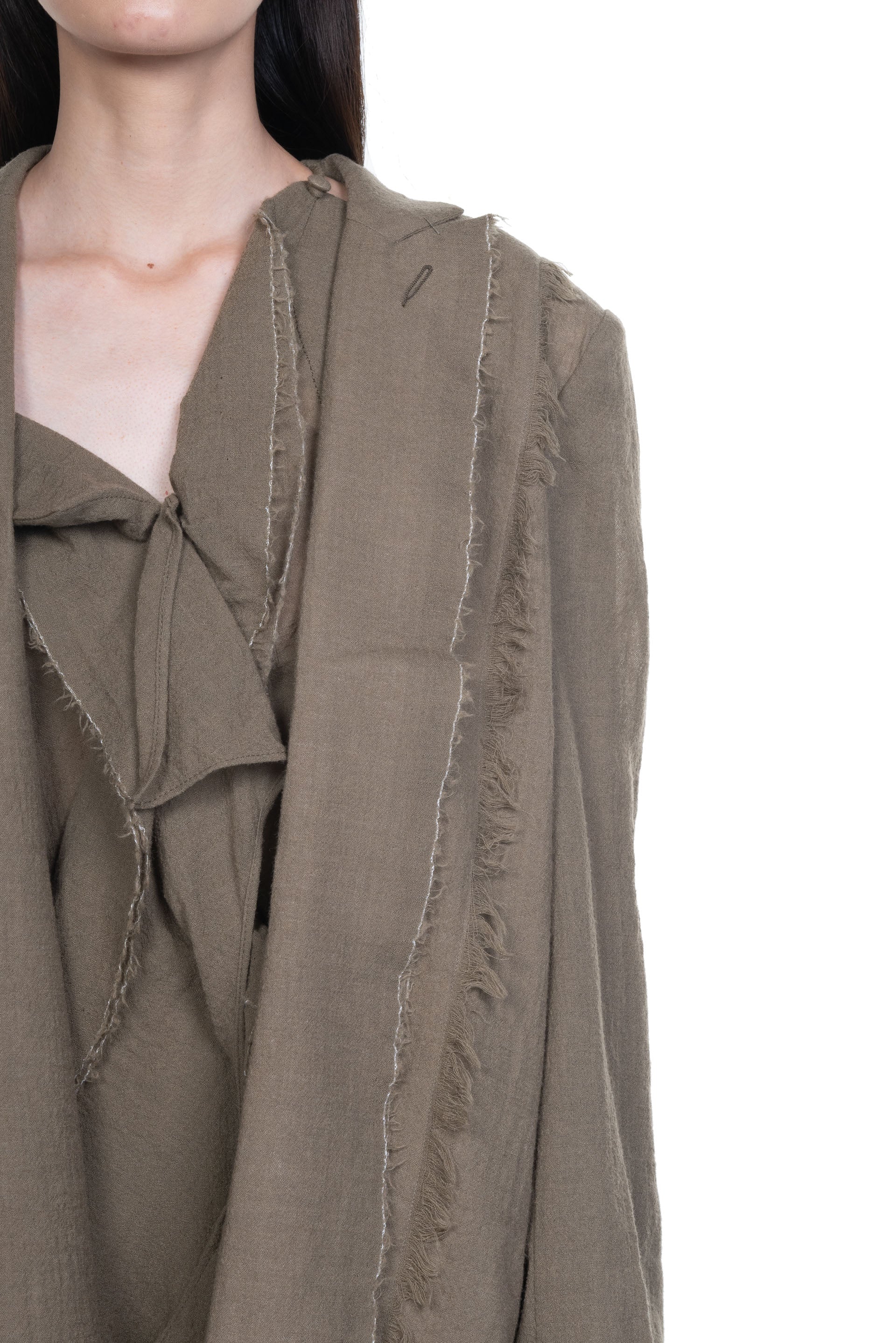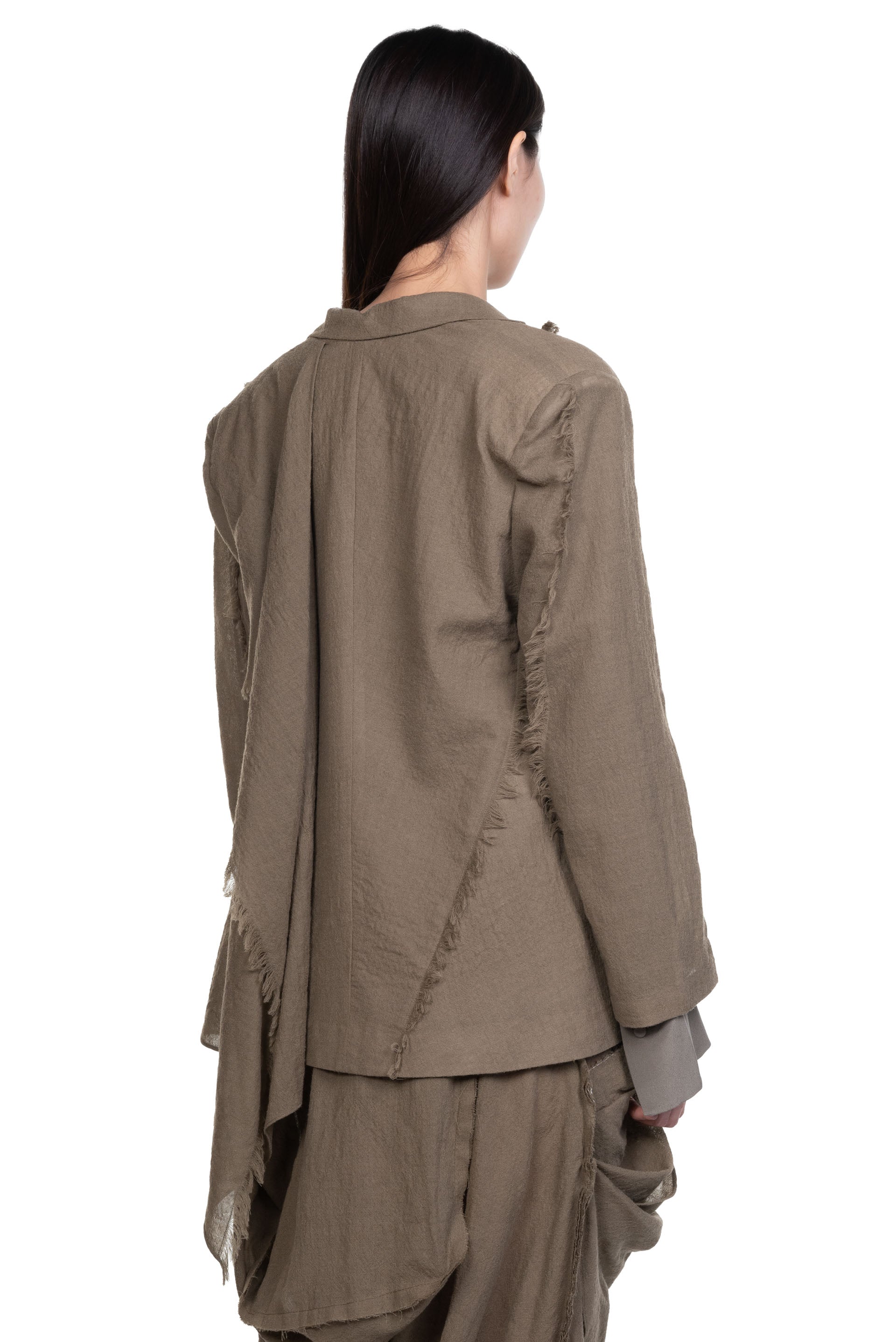 Yehuafan Asymmetric blazer in Mustard colour. Long sleeves. Deconstructed. Button closure at front. Soft lightweight fabric. Flap at chest. Distressed details throughout. Two side pockets.