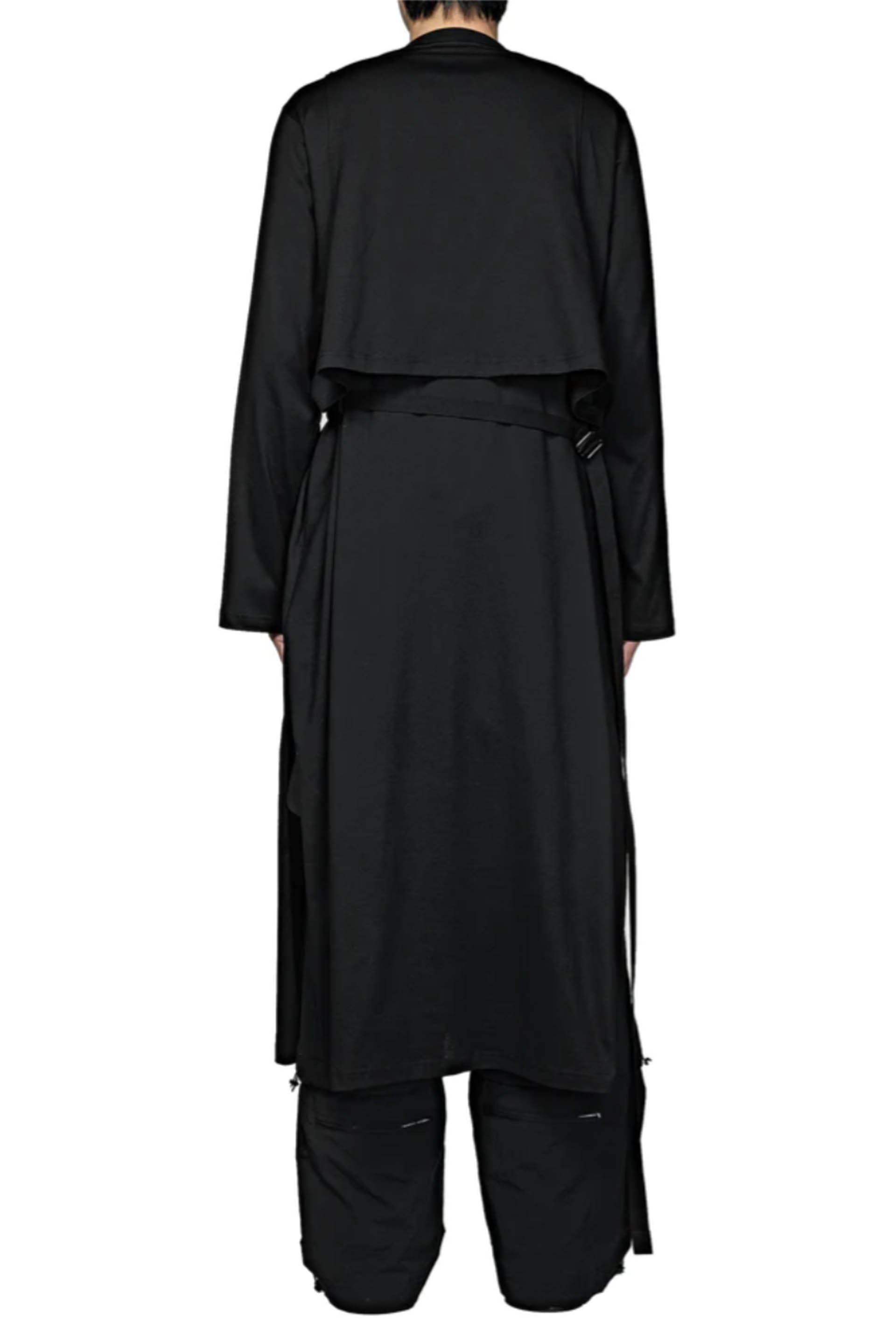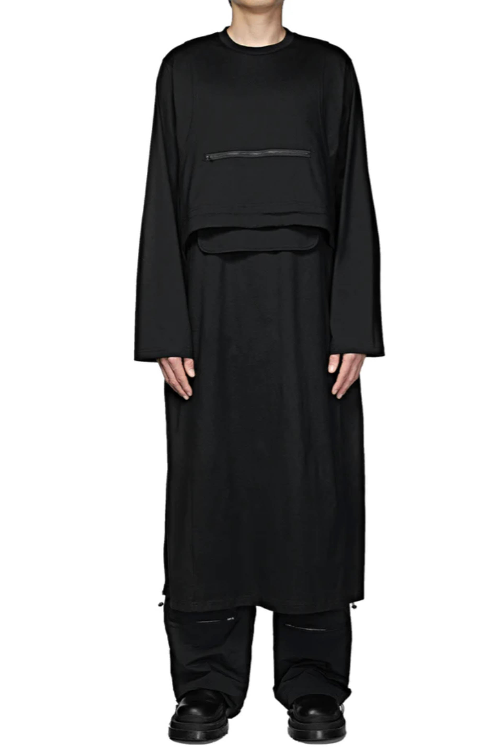Long sleeve over-length cotton t-shirt in black with top layering featuring a revealed pocket at front with a zipper opening. Crew collar. Elongated side slits with an adjustable belt detailing with tonal buckle. Regular fit. Light weight. Comfortable and breathable.