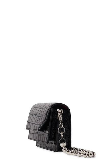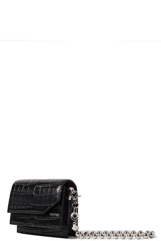 Hanwen Naomi Black Croc Mini Bag. Buffed calfskin shoulder bag. Silver-tone logo stamp at face. fold-over flap with magnetic fastening. 3 interior compartments with card slot. Tonal leather lining in camel.