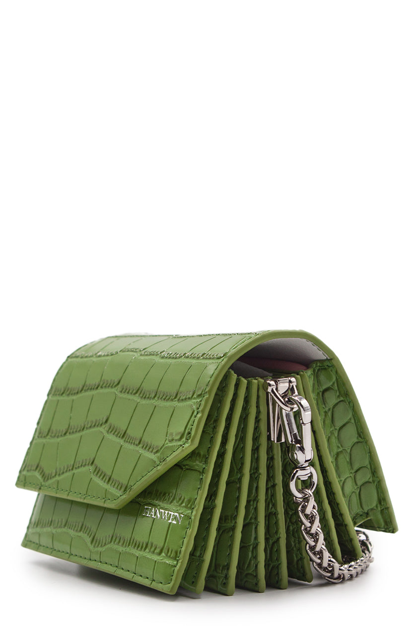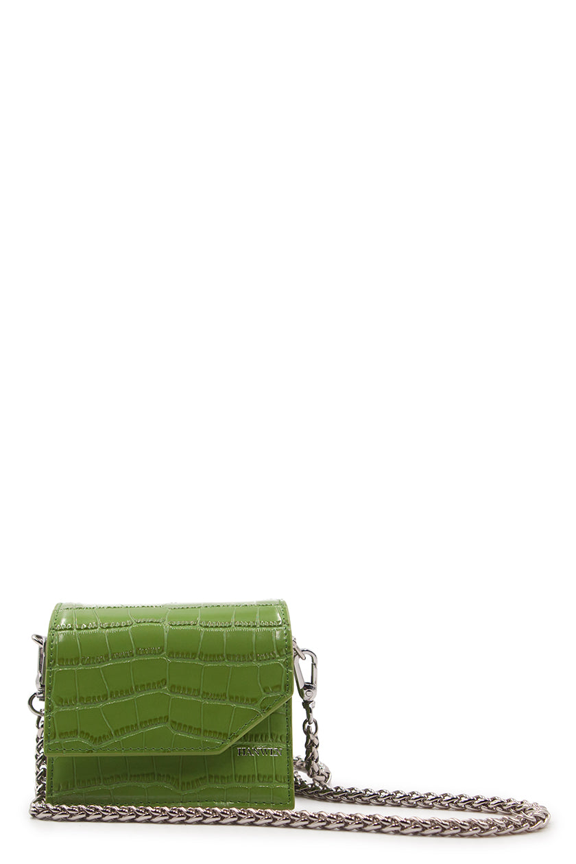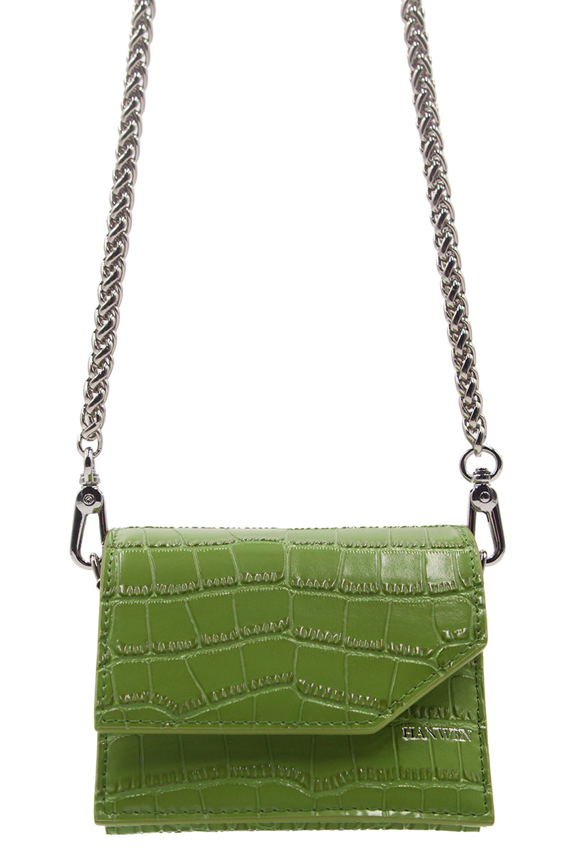 Glossy Olive crocodile. Embossed calfskin cardholder. 7 interior card slots and 1 interior compartment for cash/coins. Fold-over flap with magnetic closure. Leather lining in lemon. Silver-tone logo stamp on front. One detachable silver-tone rope-chain for cross-body carry. Chain attaches with swivel snap hooks.
