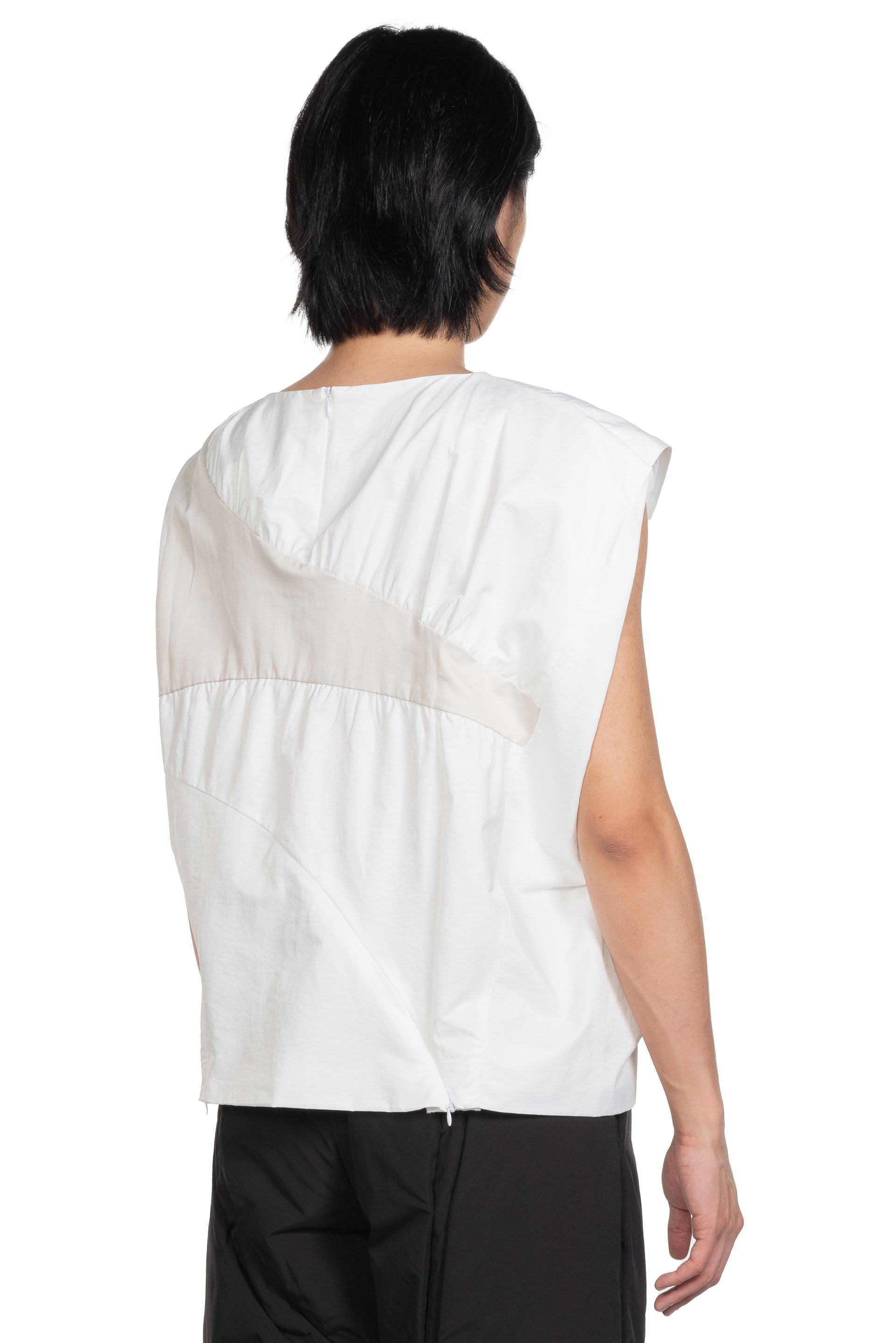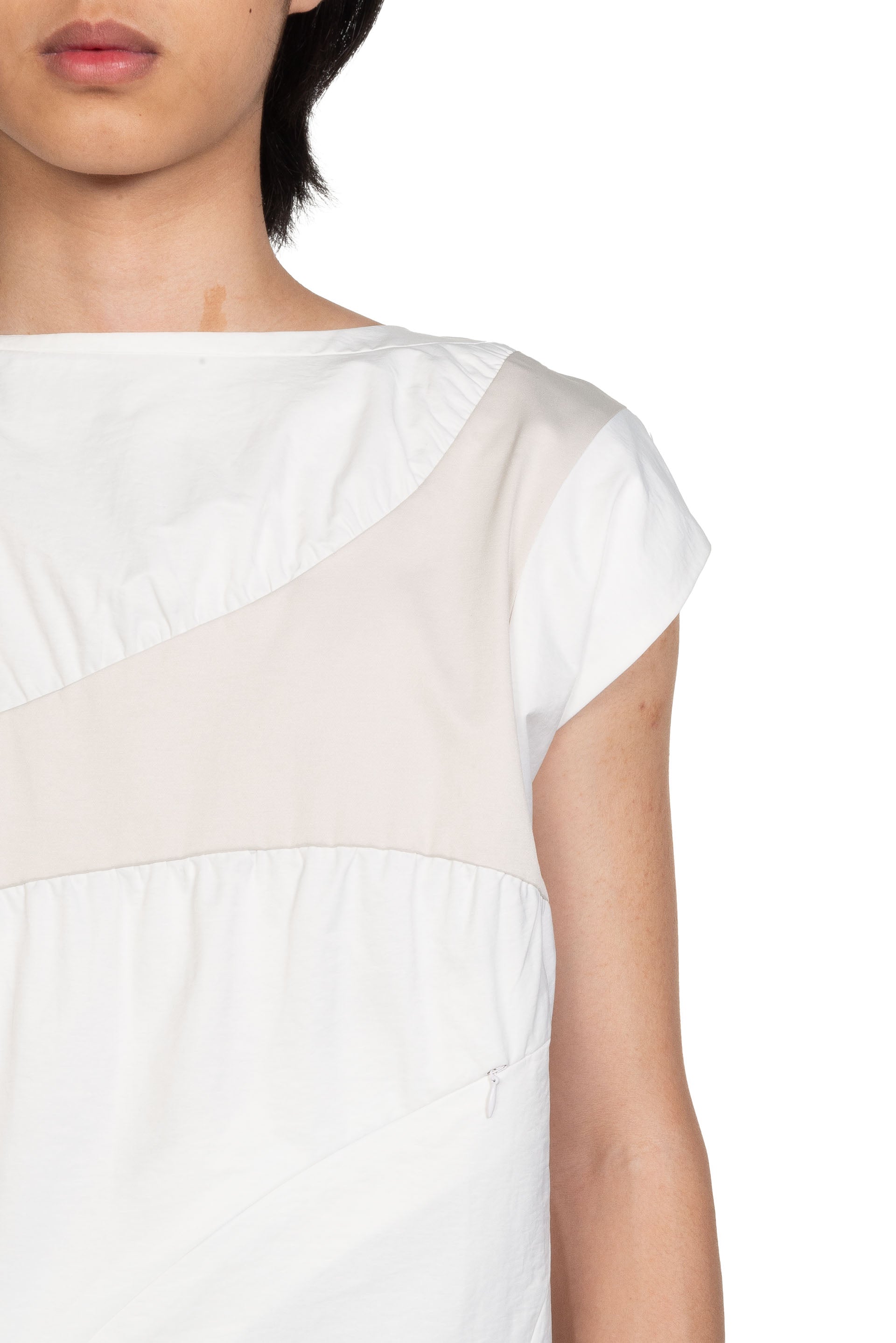 Cotton poplin T-shirt. Cotton-blend twill trim throughout. Panelled construction. Boat neck. Zip closure at back collar. Zip expansion panels at hem