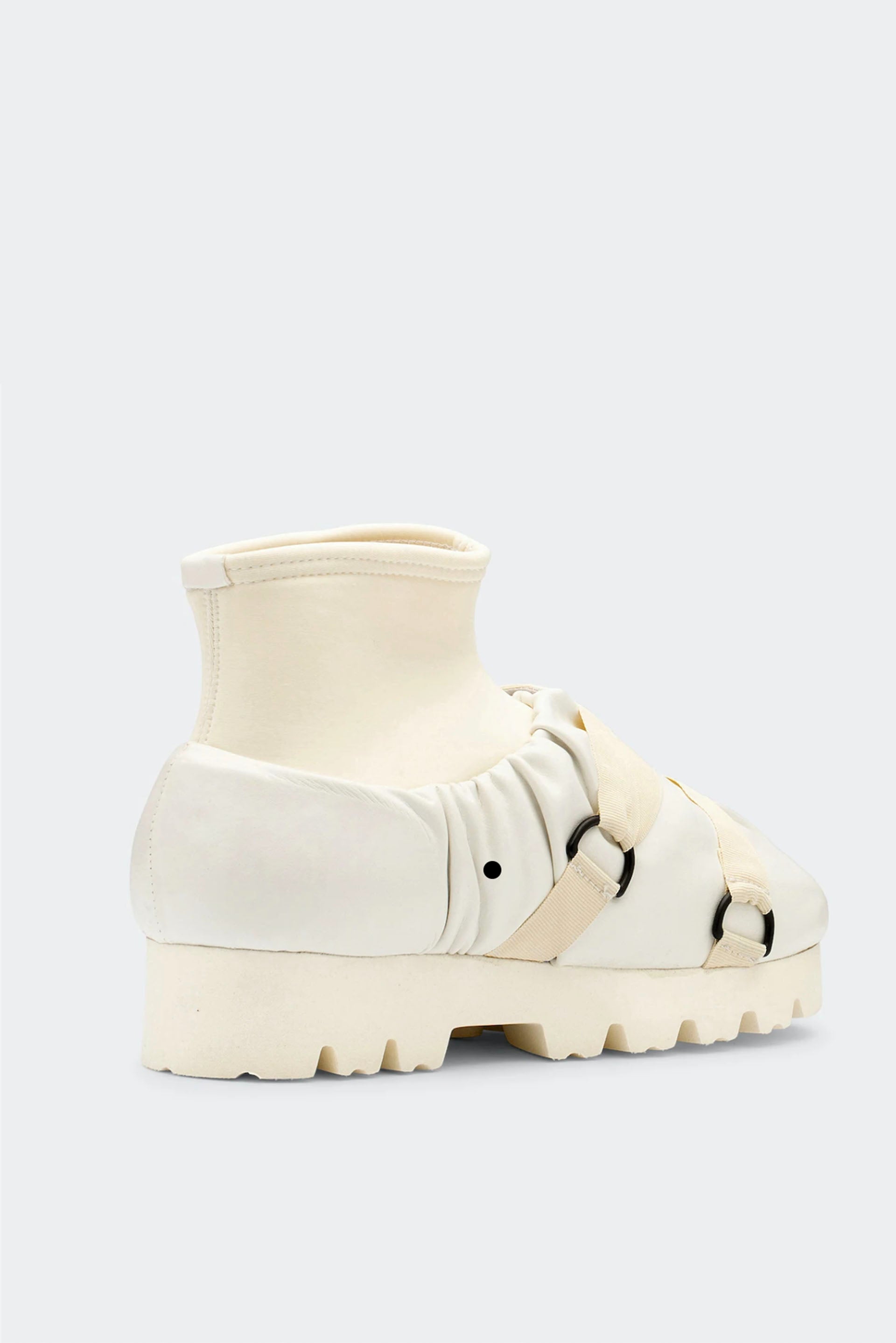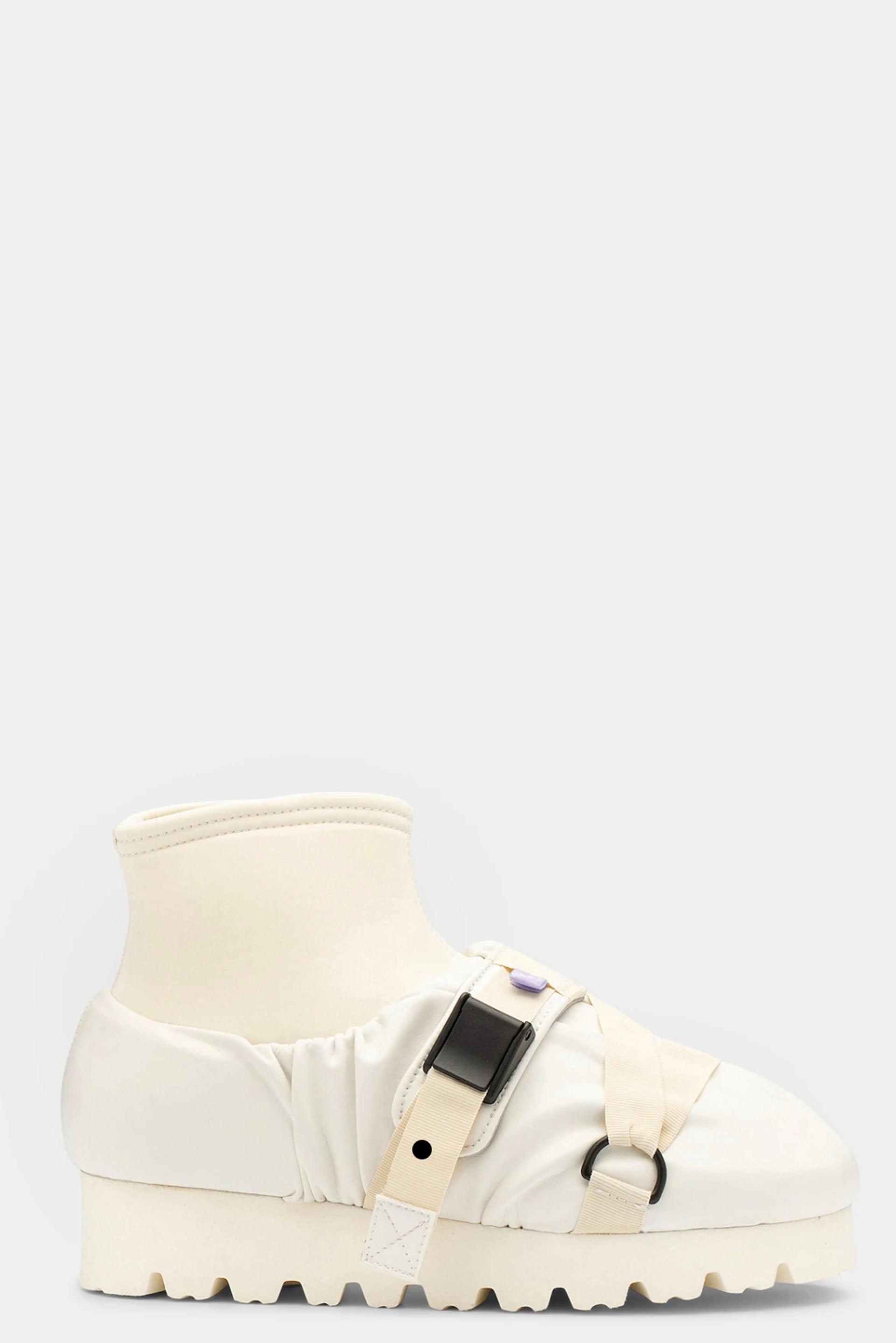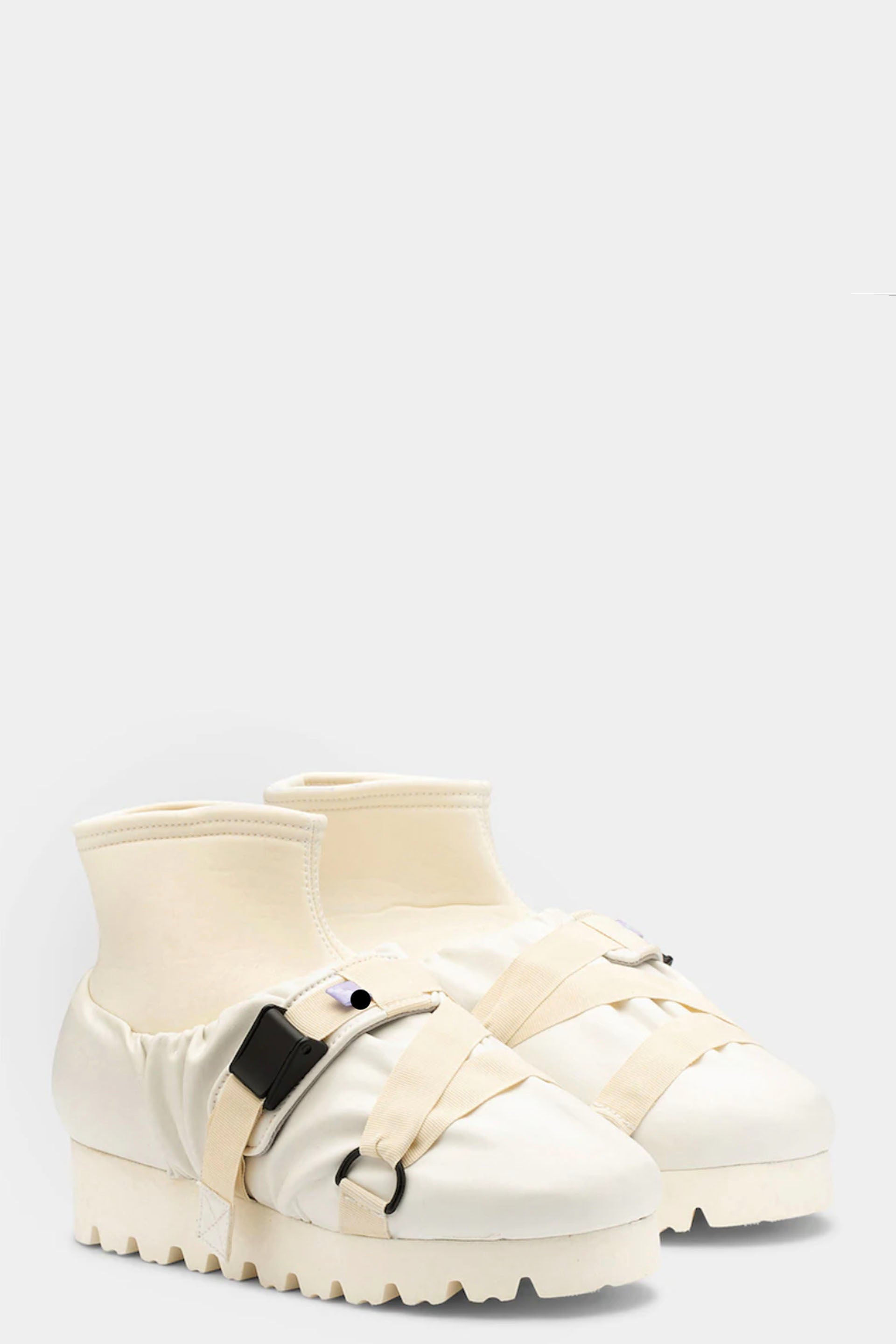 Unique and imaginative collections inspired by contemporary art, technology, and architecture. Named after the Japanese word for dream, YUME YUME makes futuristic footwear influenced by traditional Japanese silhouettes. They combine Japanese-inspired designs with a modern and futuristic approach to everyday footwear. YUME YUME aspires to create unique design pieces for all creative minds as seen with the Nawa Camp Mid Moon White. A vegan leather boot with a durable EVA outsole that gives the shoe a light feel. The neoprene sock and puffy upper creates a comfortable wear. Lightweight EVA outsole. Puffy warm upper. Perfect for traveling. Vegan materials. Anti-bacterial lining.