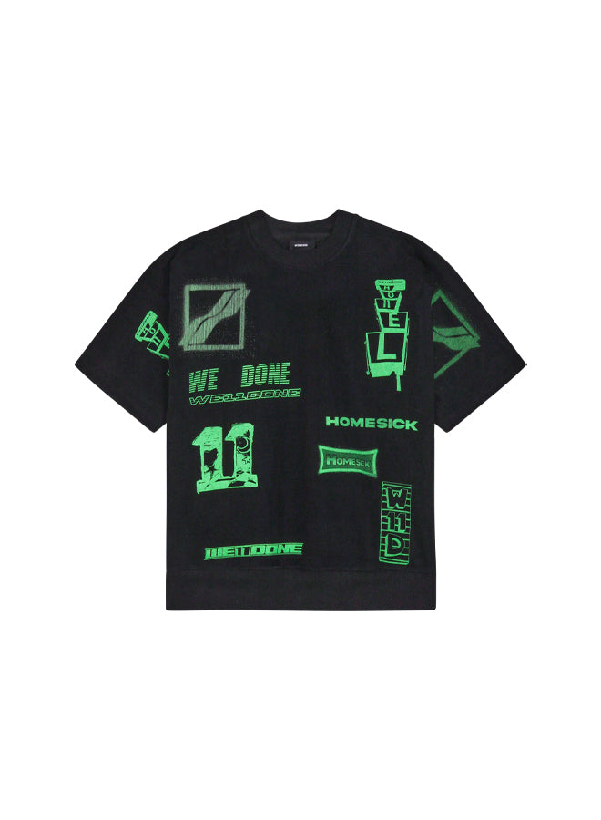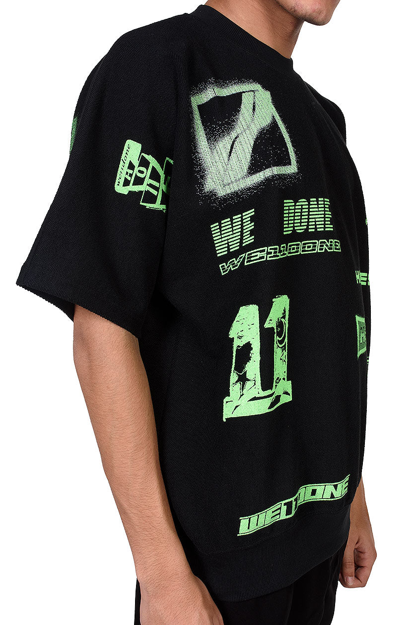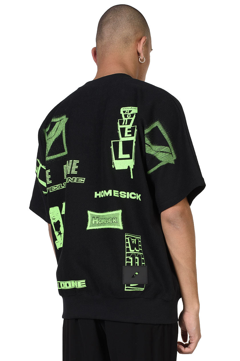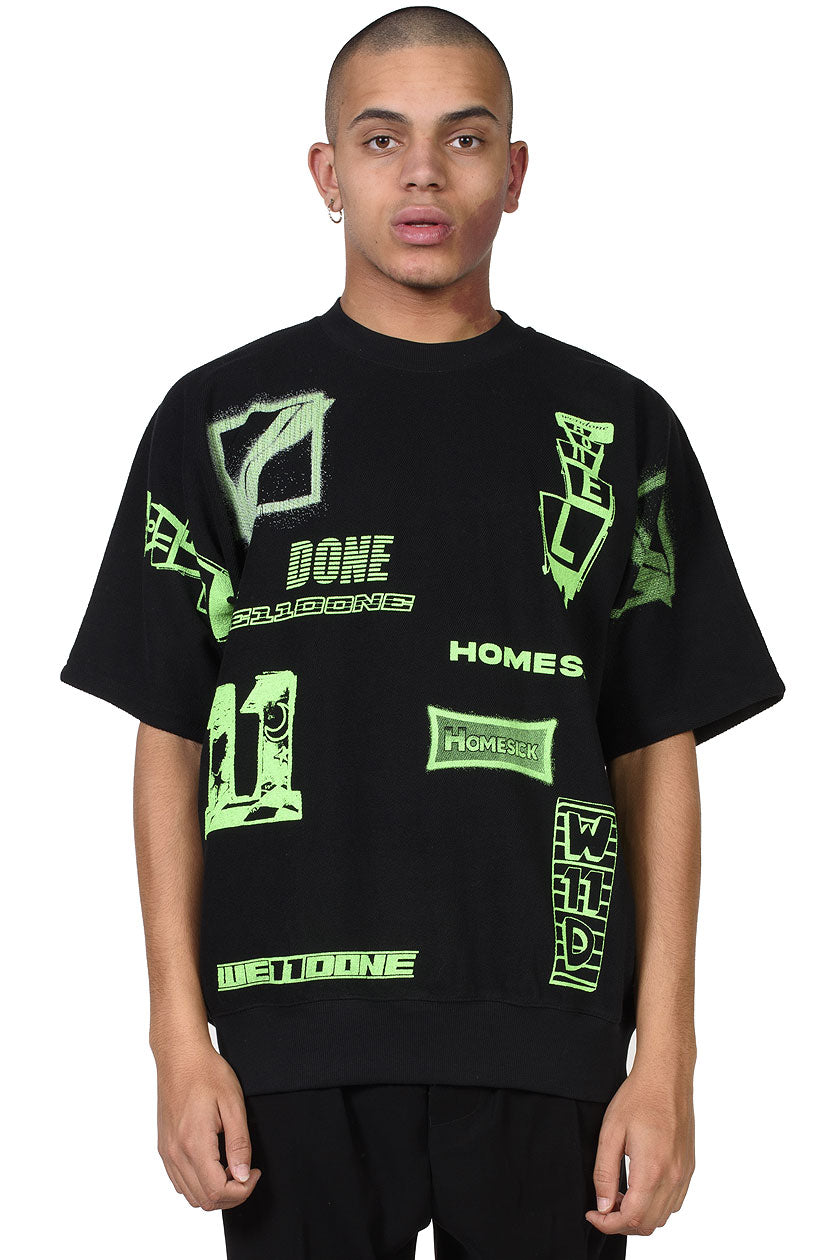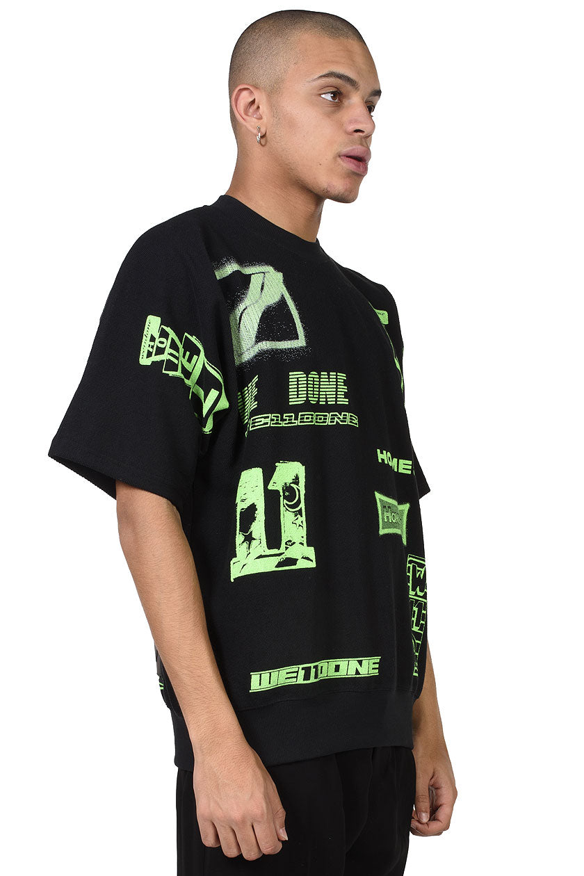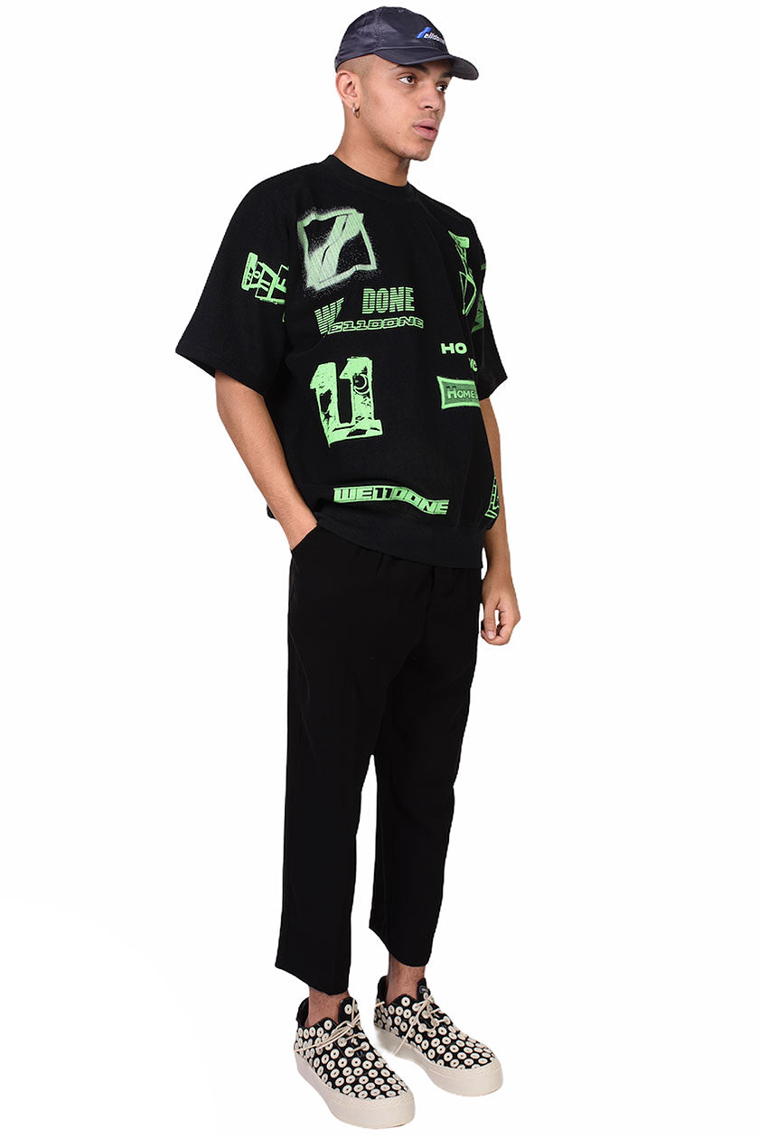 We11done merges late 1990s and early 2000s aesthetics creating a feeling of futurity. Functional, sportive, and sleek, We11done’s versatile designs refine classic elements into contemporary lifestyle pieces as seen with the Short sleeve reverse French terry T-shirt in black. Graphics printed in tones of neon green throughout. Rib knit crewneck collar and hem. Dropped shoulders. Tonal rubberised logo patch at back hem.