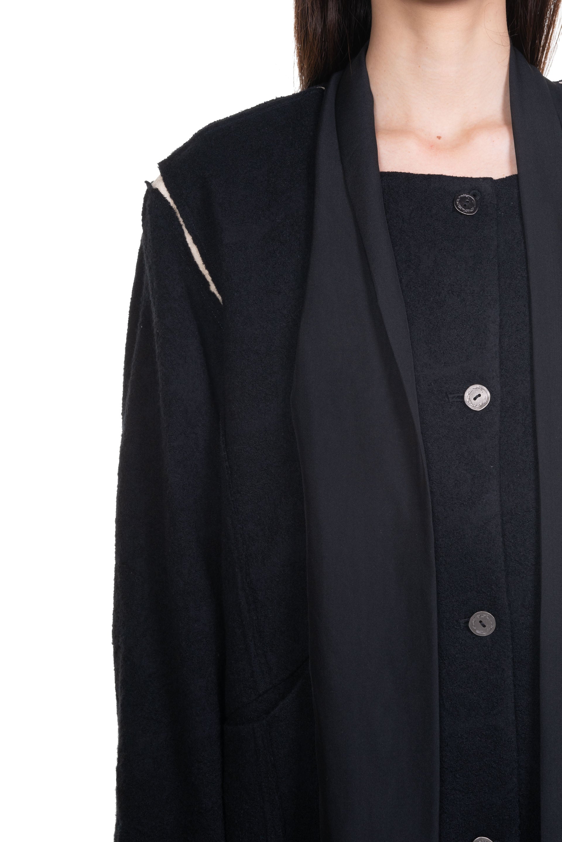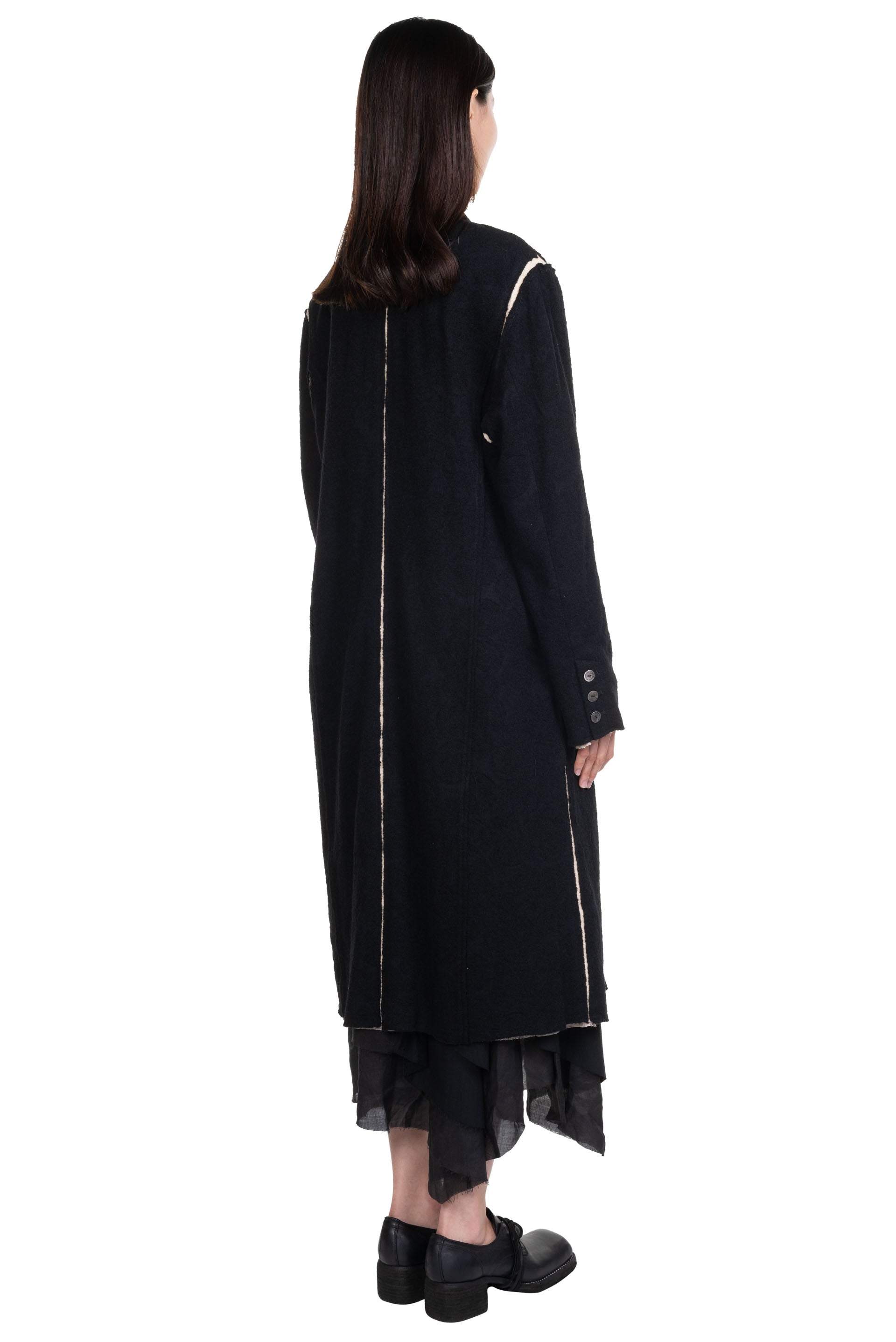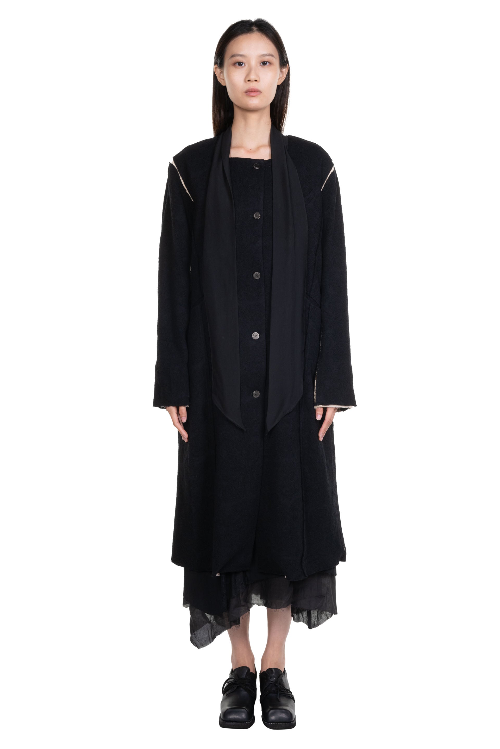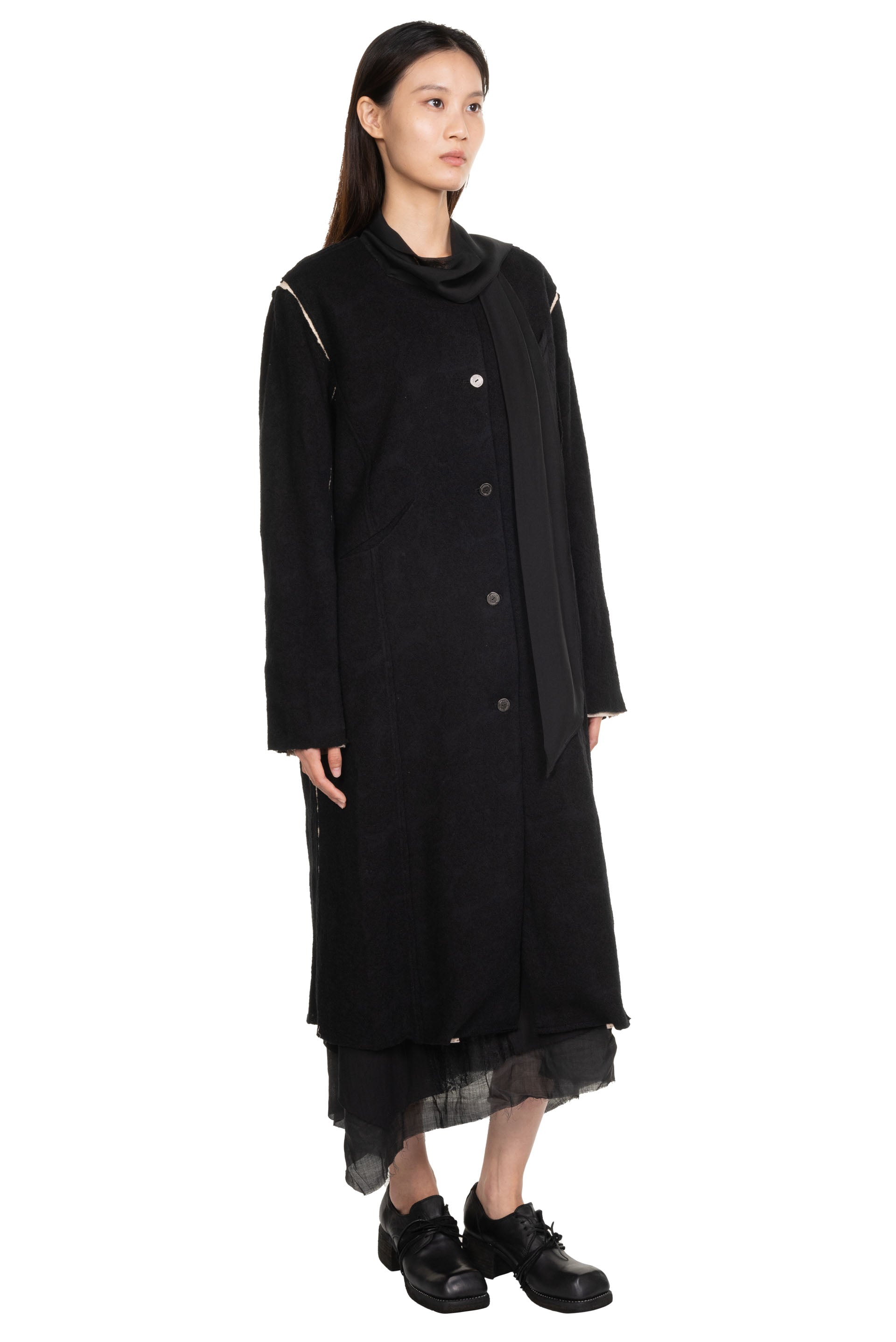 Black Nerd Coat from Professor e. Long sleeves. Button closure at front. Single breasted. Button at cuffs. Lined with signature linen lining. Scarf details at collar. Slicing details throughout with contrasting fabric. Two side pockets. Soft textural fabric.