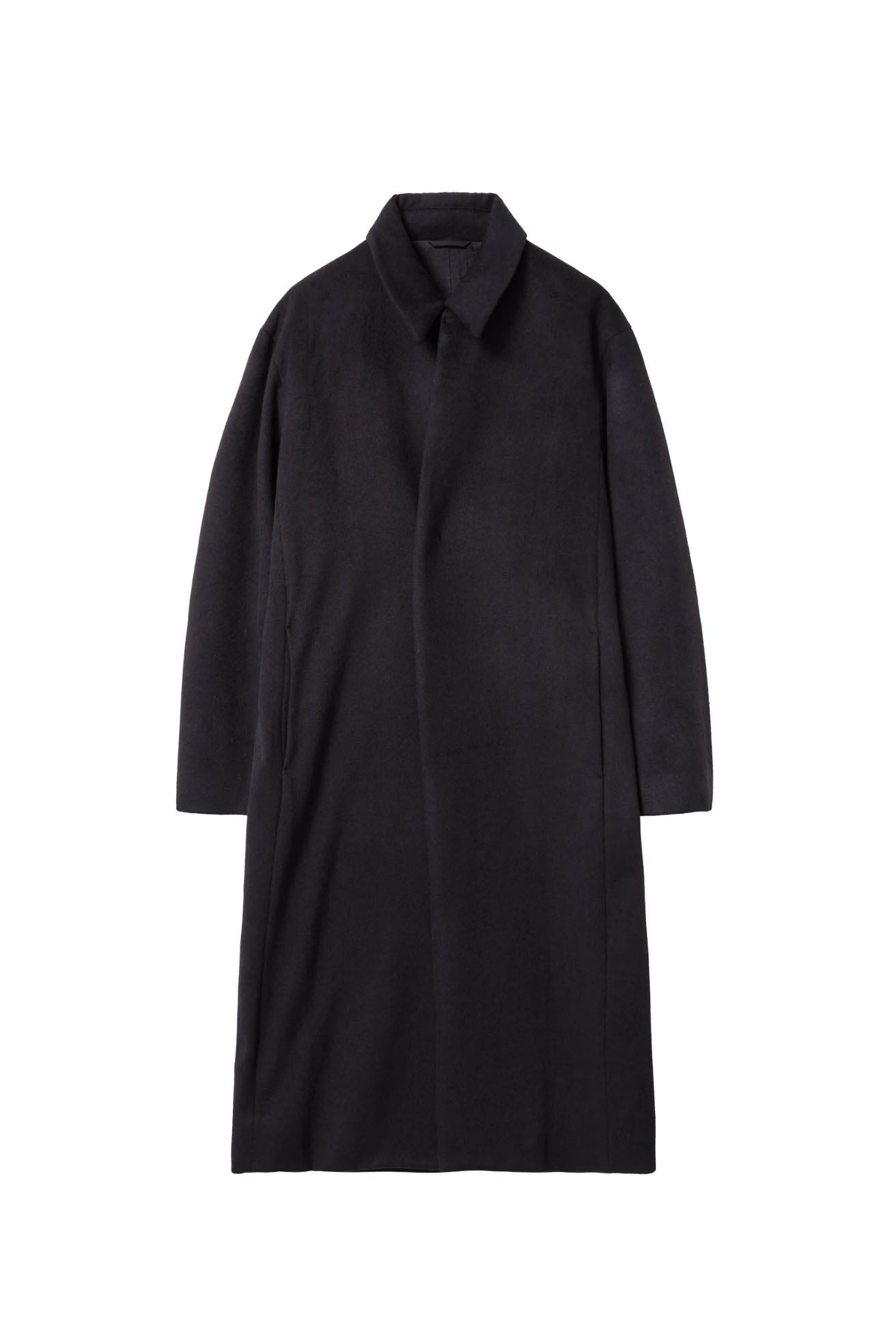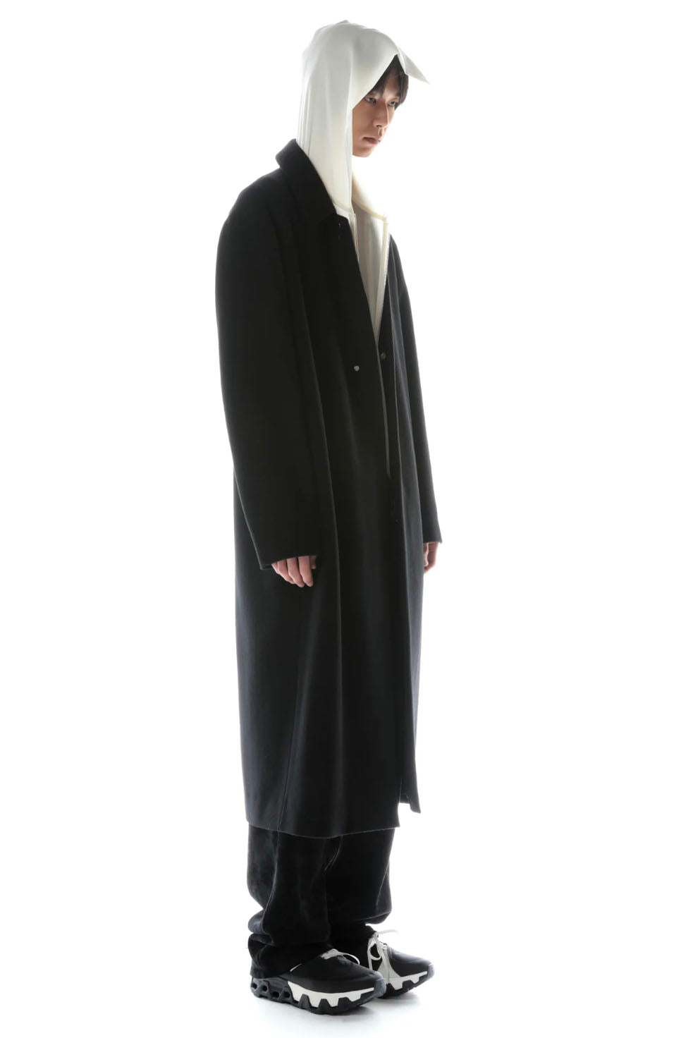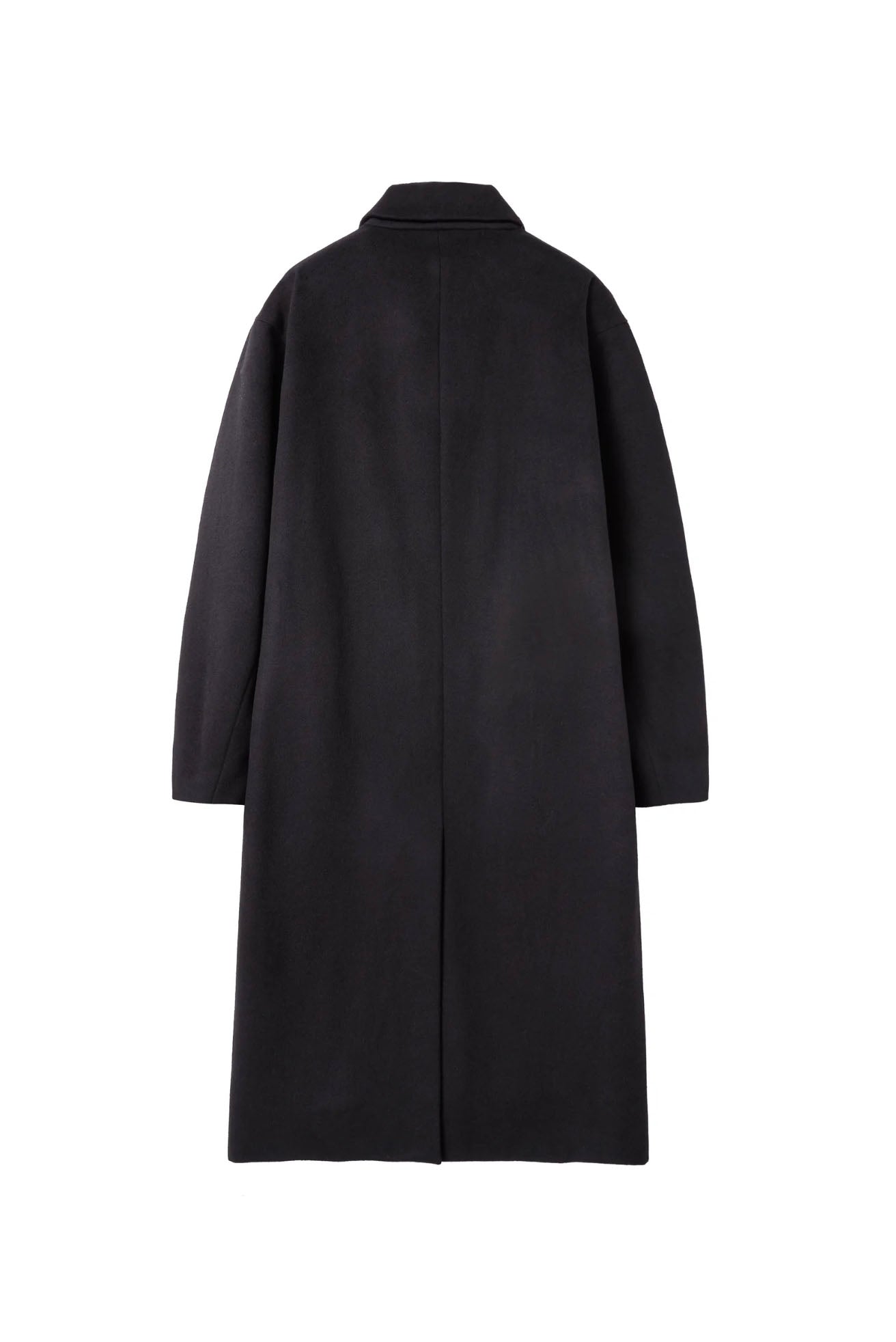PAF long black coat. Straight point collar. Snap button closure on neck. Adjustable waist silhouette with snap buttons. Two front hand pockets. Interior neck hanging loop. Single back vent. Semi-oversized fit. riri COBRAX® snap button.