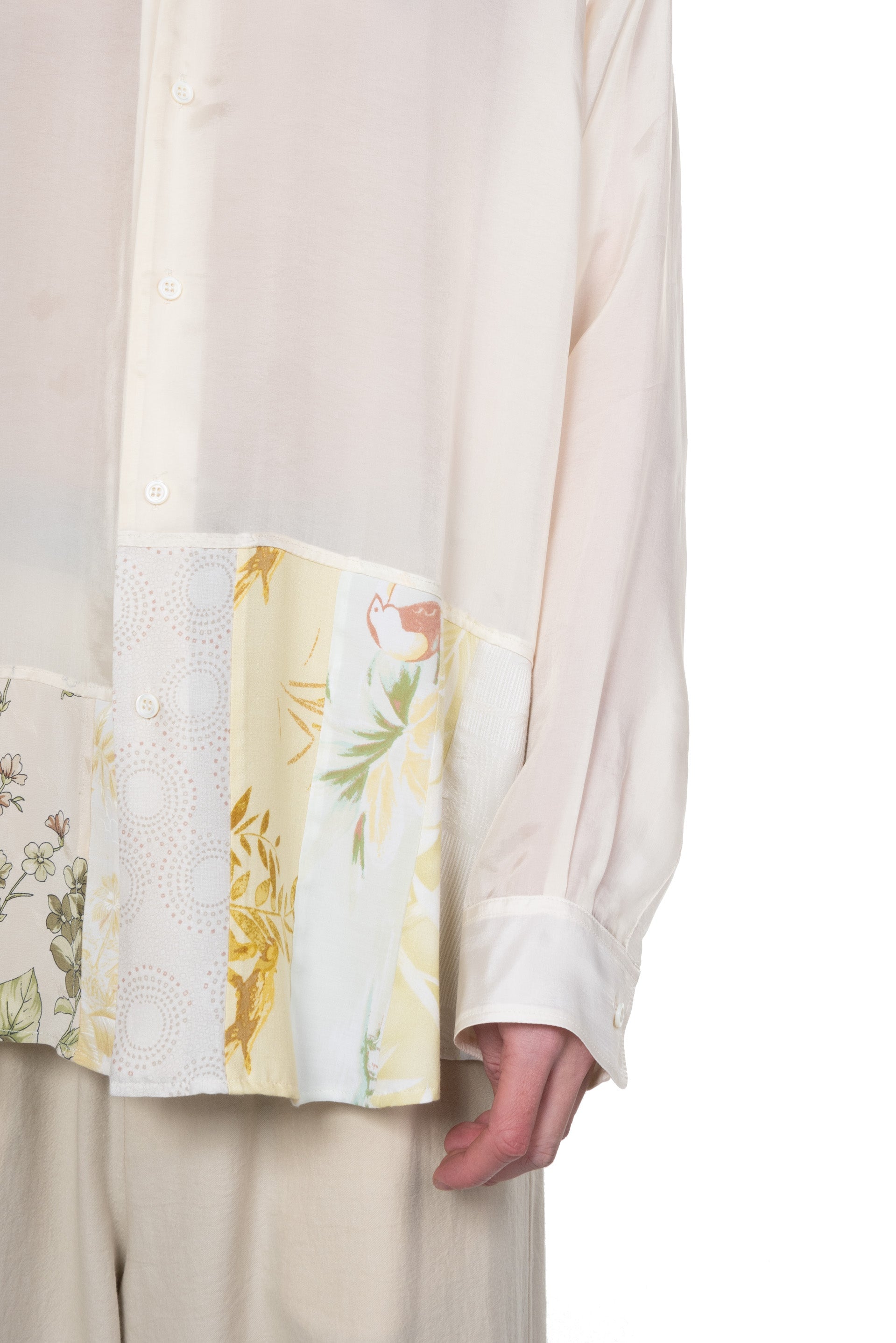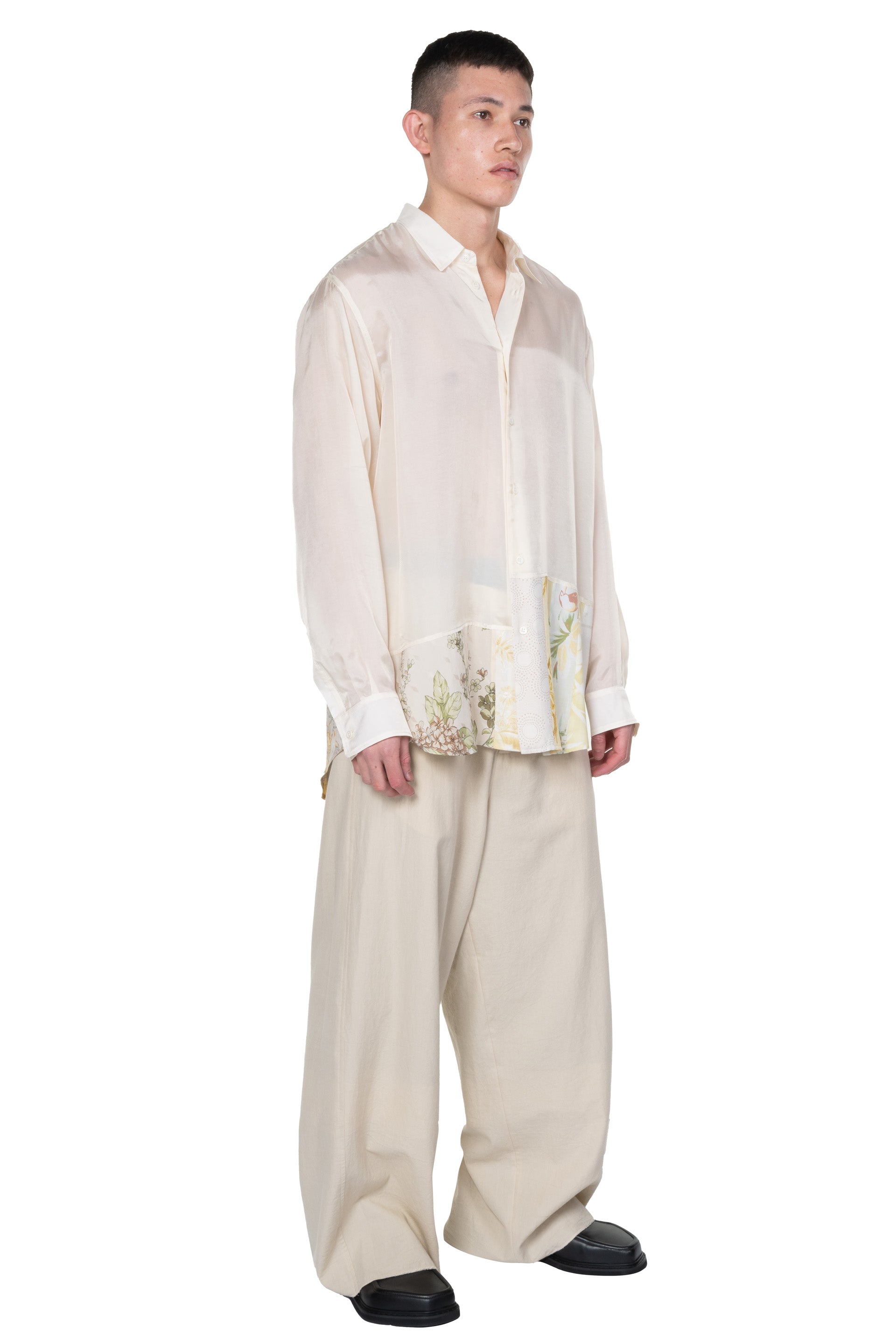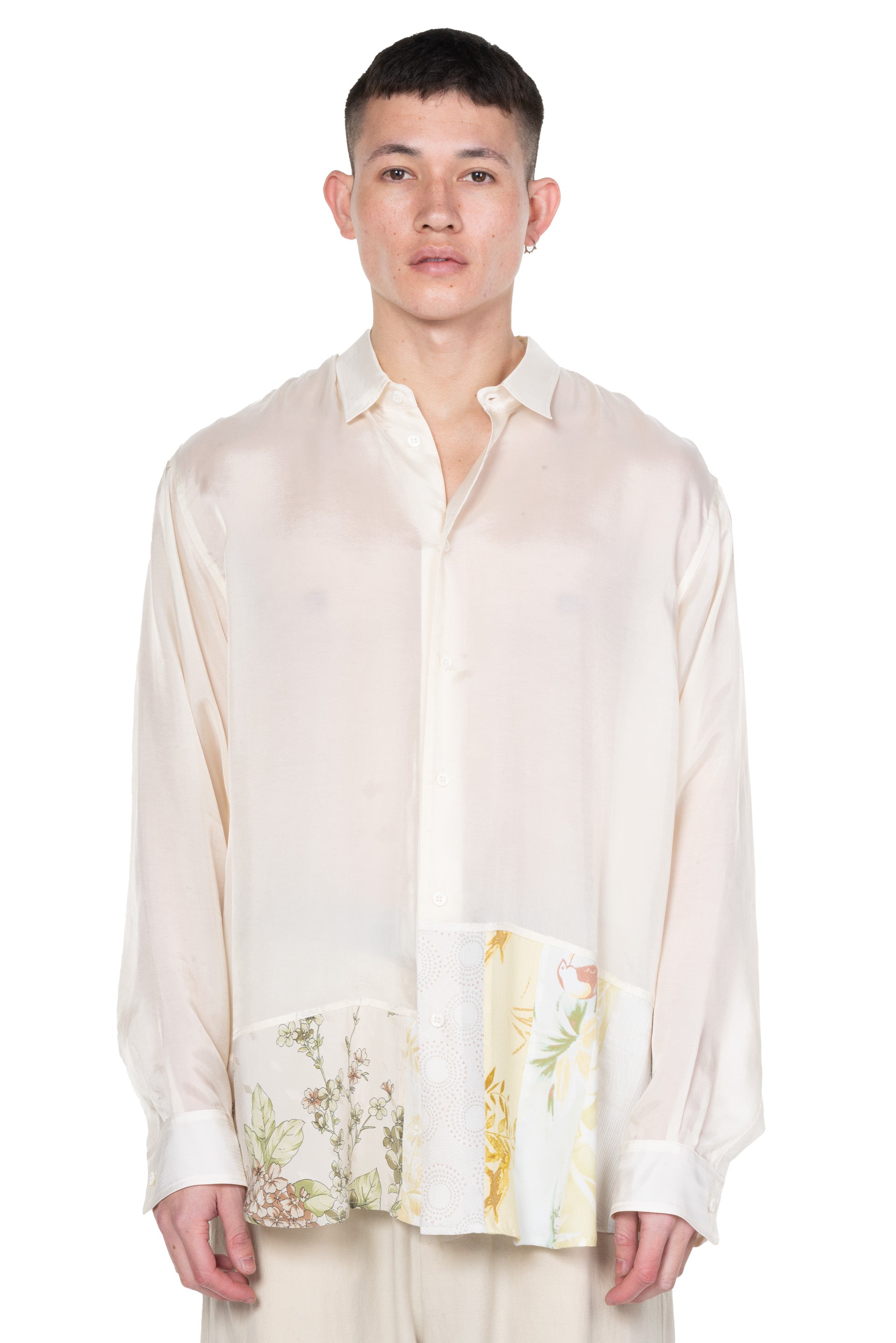 Long sleeves. Button closure at front. Button closure at cuffs. Made from Surplus fabric. Each piece is unique. Distressed details throughout. Oversized fit.