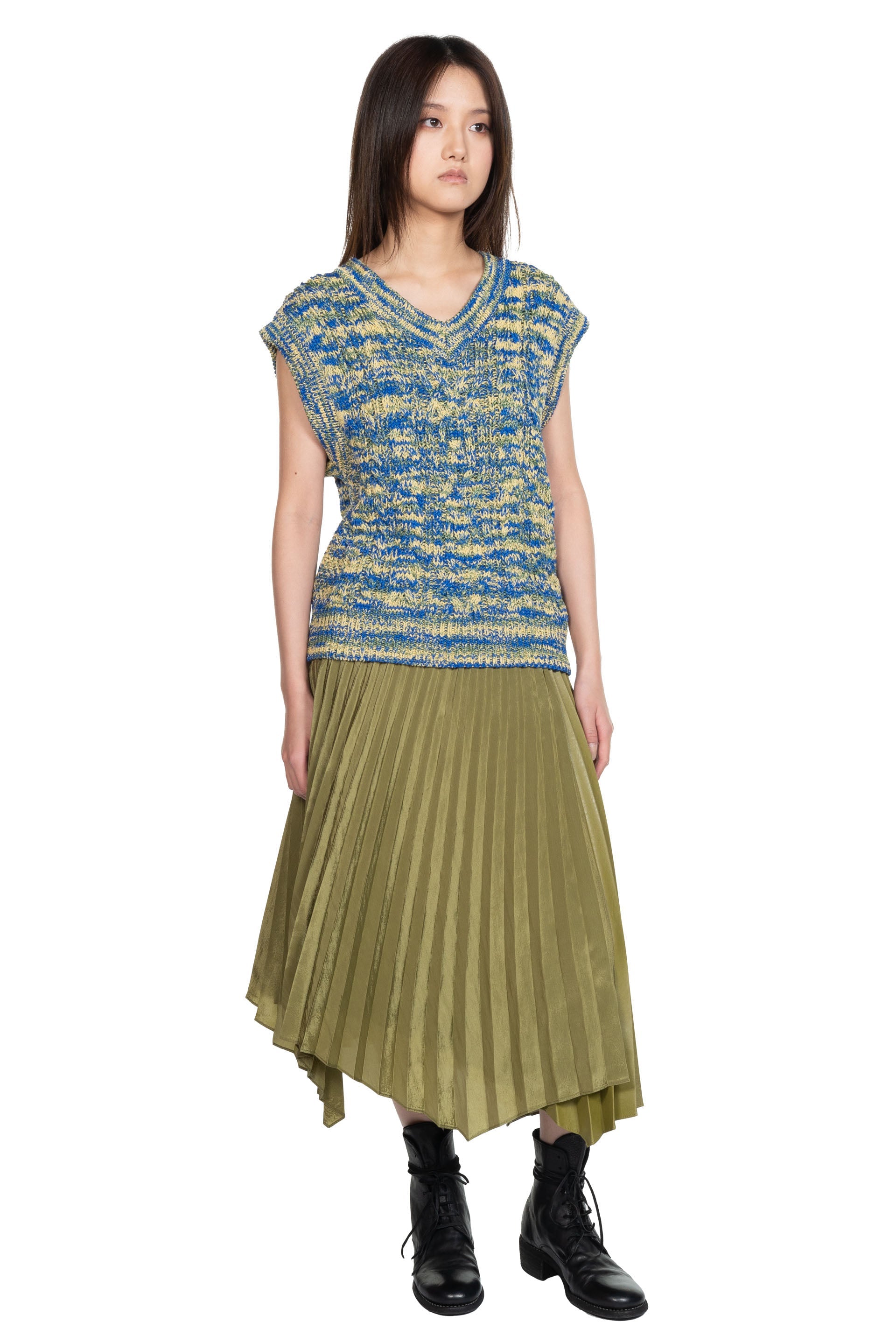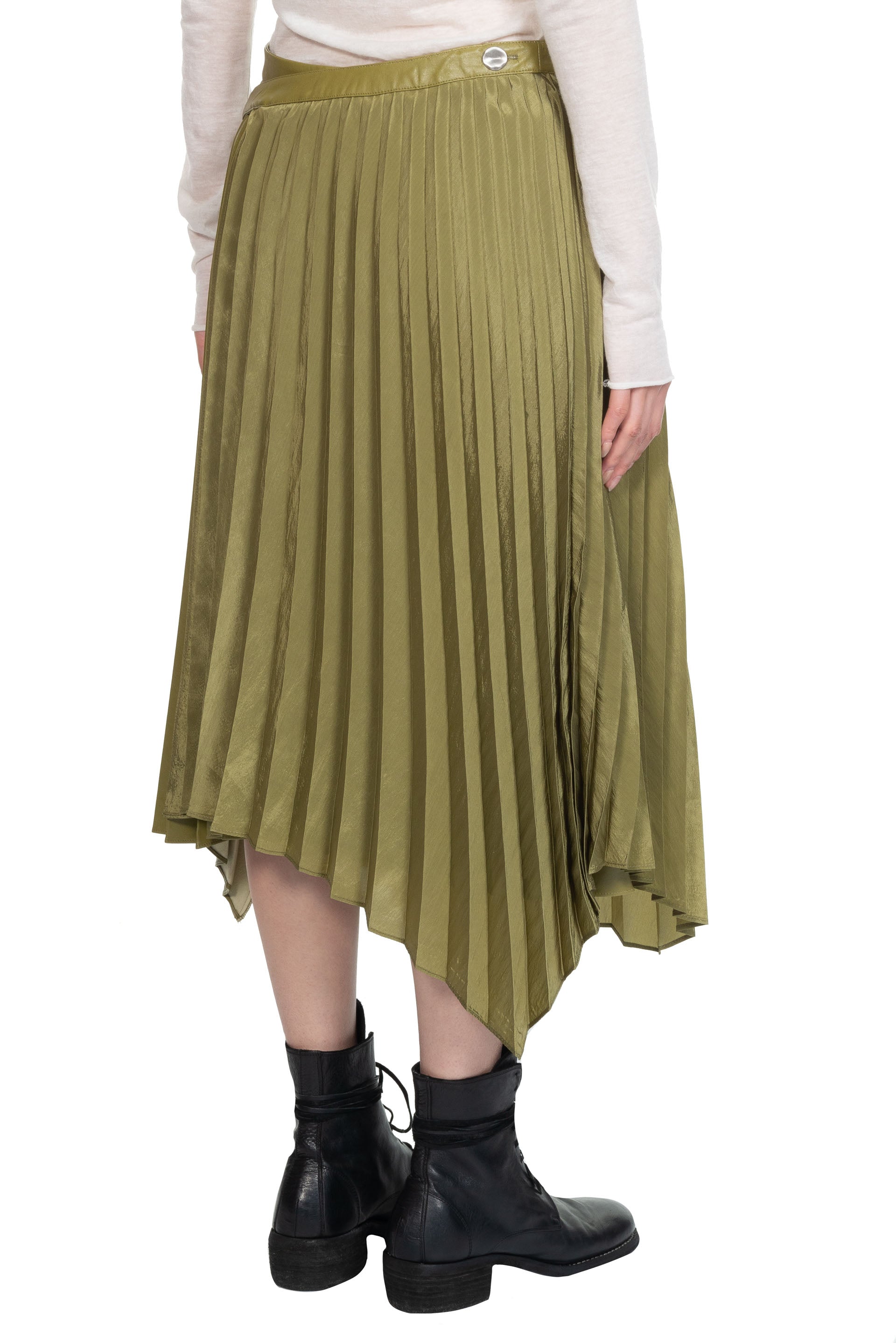 Pleated at front. Wrap around. Belt detail at waist. asymmetric. Leather trim at waist.