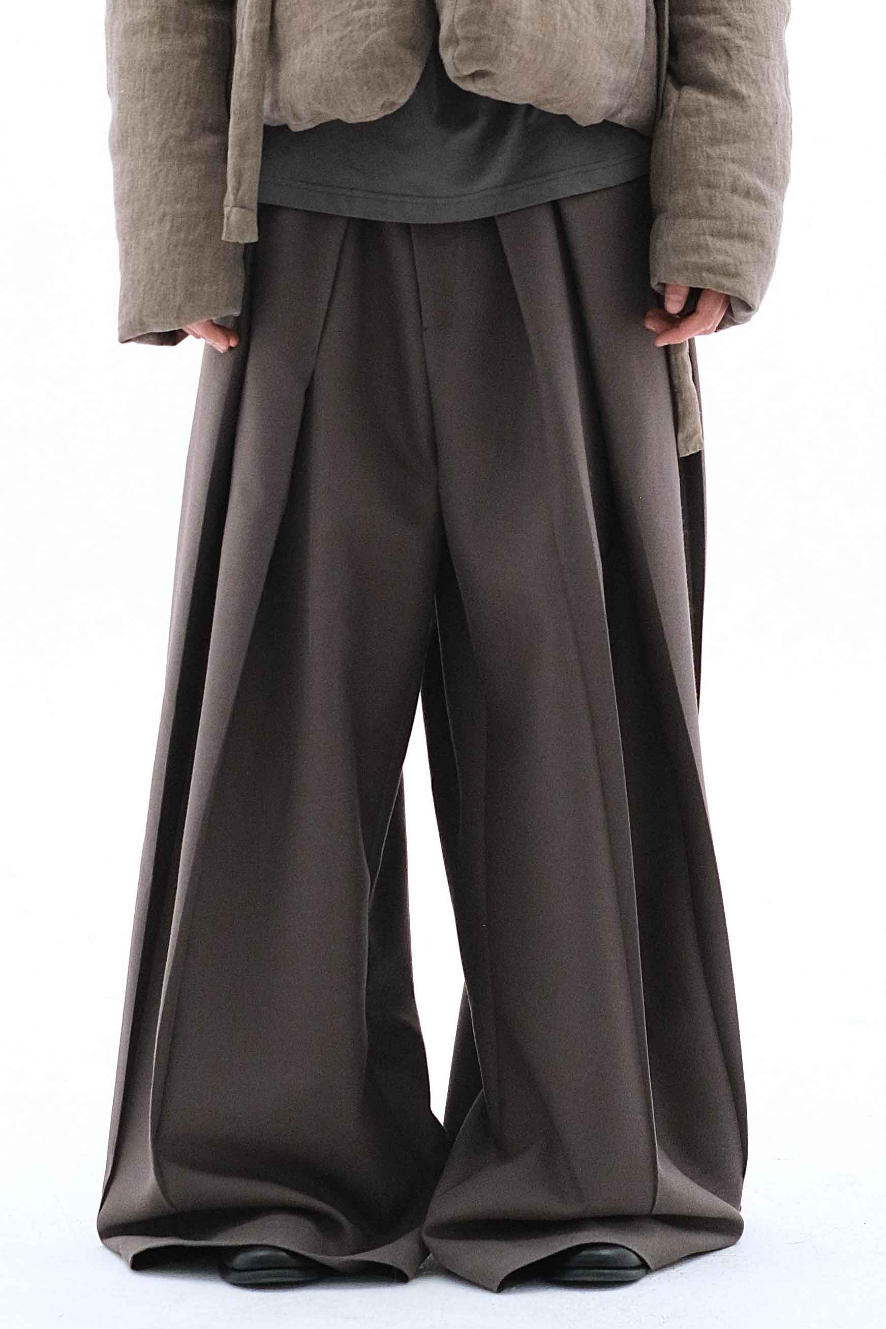 Attempt project 11 nine pleat pants. Button closure at waist. Two side pockets. Two back pockets. Four pleats design. Wide leg. Made from a strong, sinewy fabric. The trouser is finished with a fold at the waist creating a distinct shape. The folding of the waistband and the closing of the dart. Creates a three-dimensional interior space.