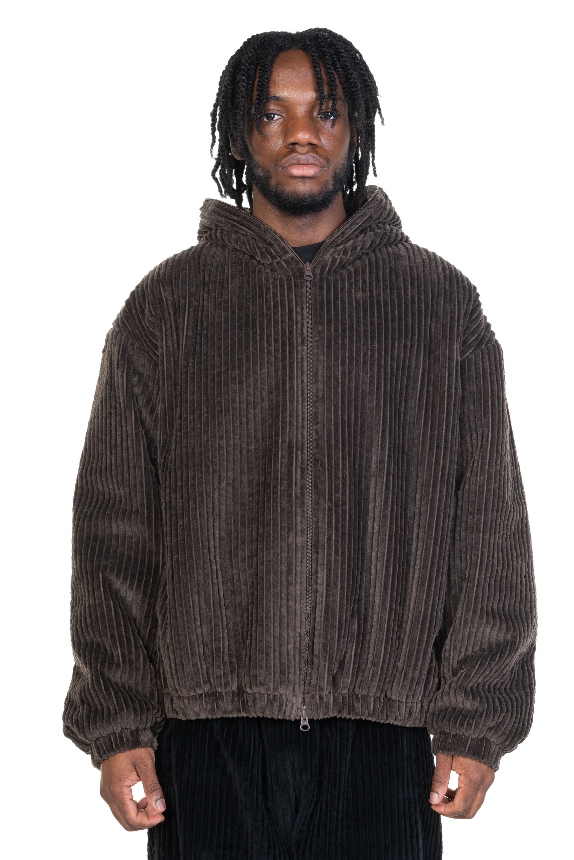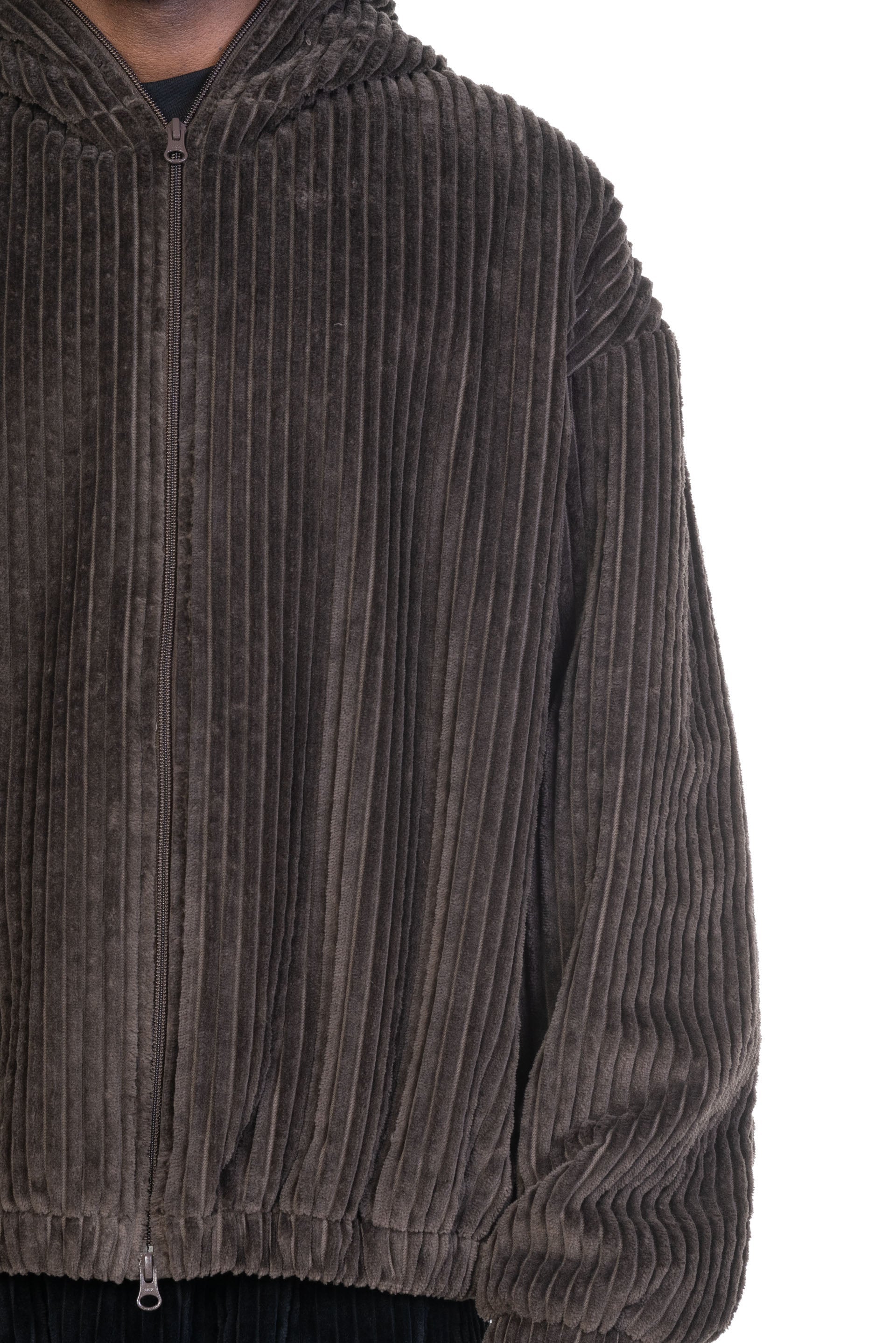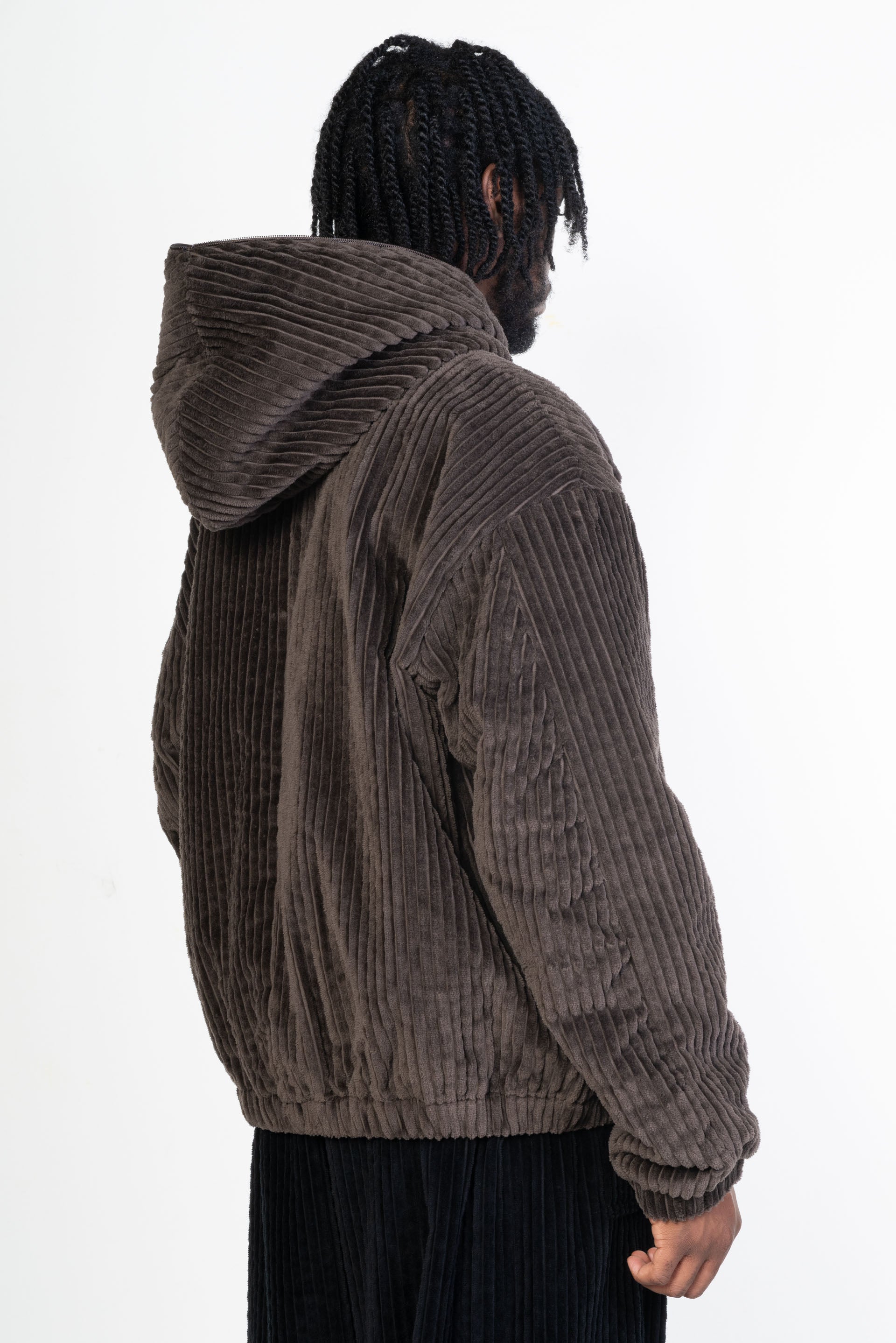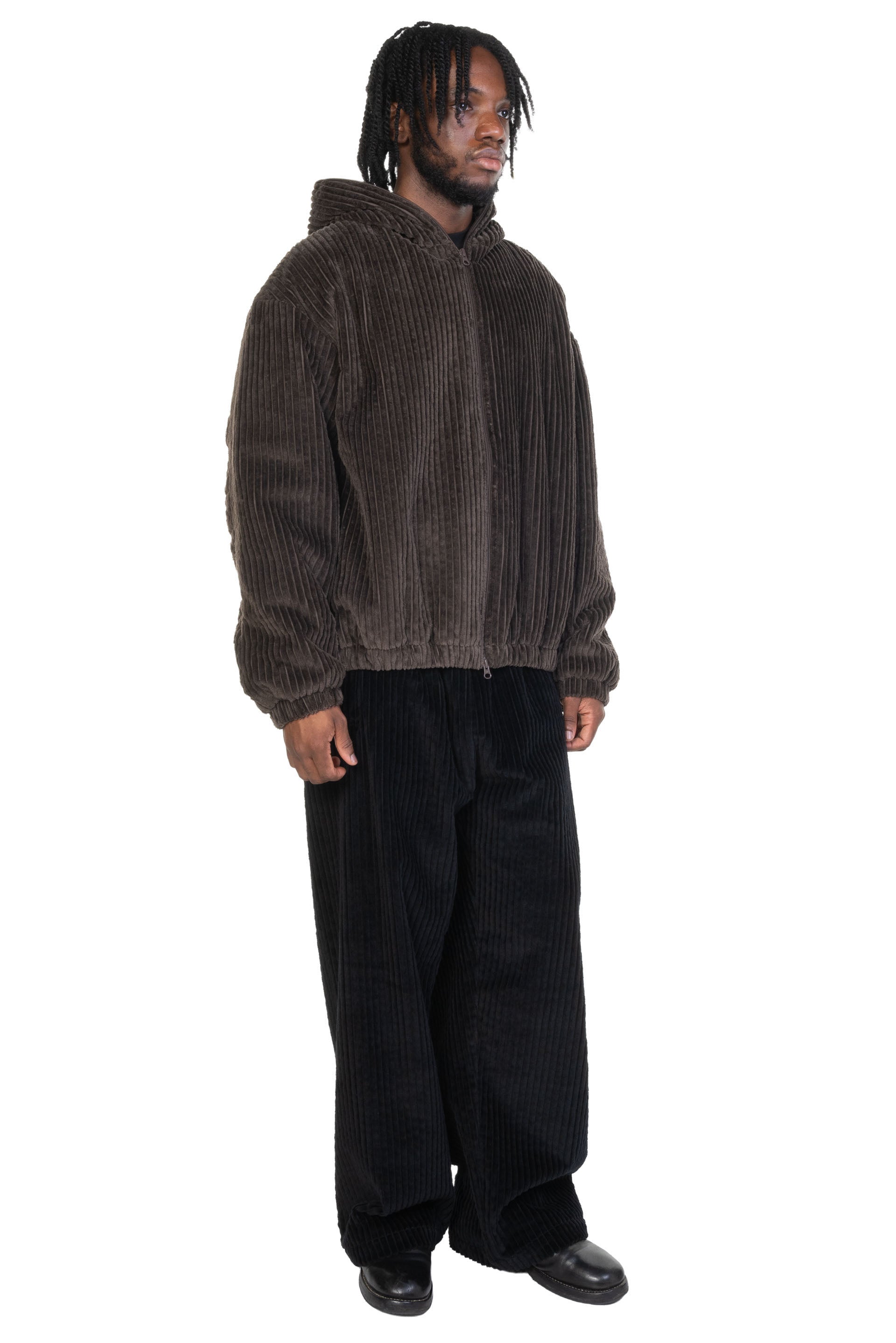 An oversized, boxy, zip-front puffer jacket cut from a plush three-wale cotton corduroy in a muted dark brown. Features a two-way YKK zipper, a full-zip hood, on-seam hand pockets at the waist, elastic cuffs, and an elastic hem. Dropped shoulders combine with the generous fit through the body and the plush structure afforded by the corduroy to create a strong curvaceous silhouette that is enhanced by blousing at the waist and cuffs. Constructed with a full lining in a tonal fine cotton plain weave and an insulating interlayer, providing winter warmth and a fully encased interior.