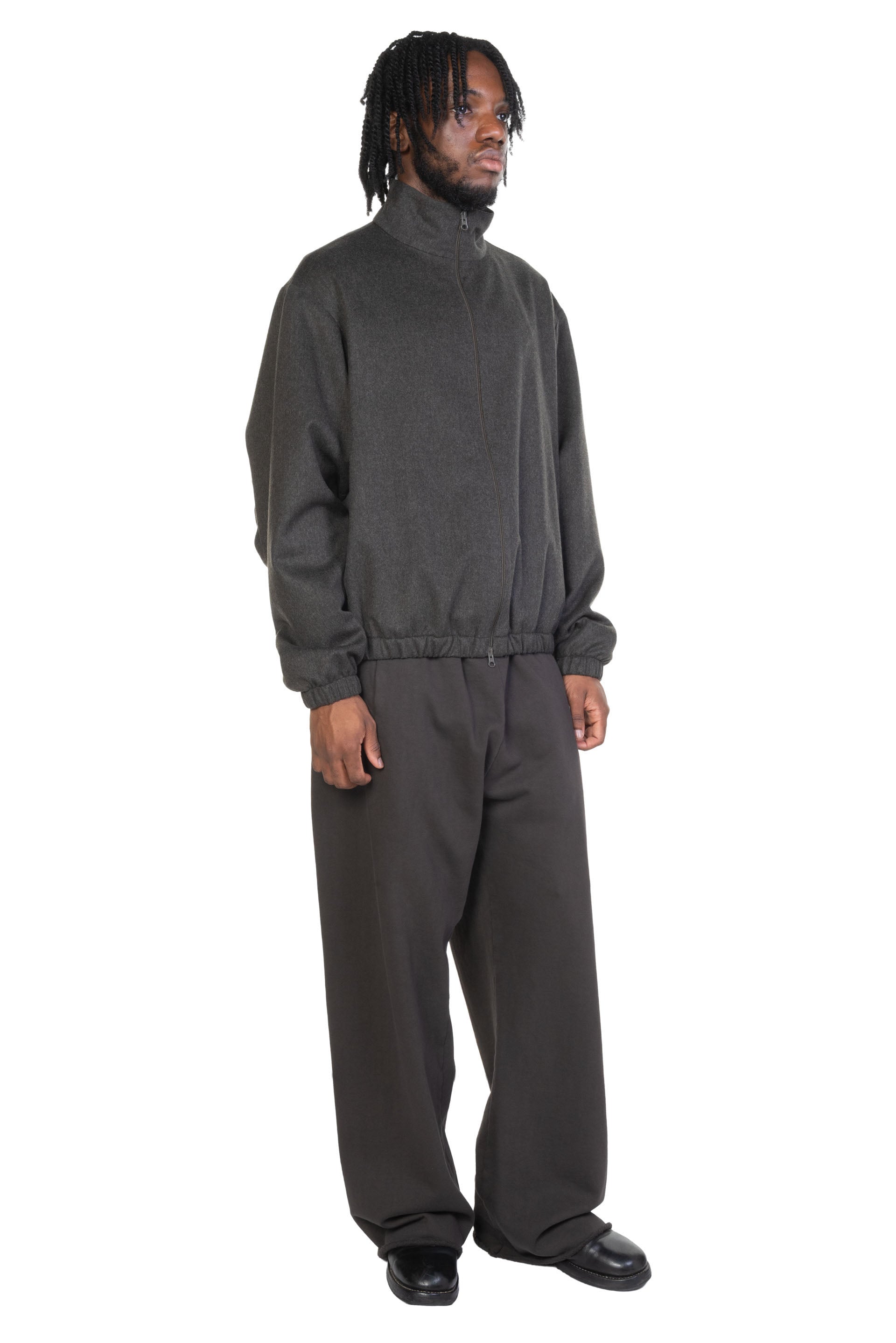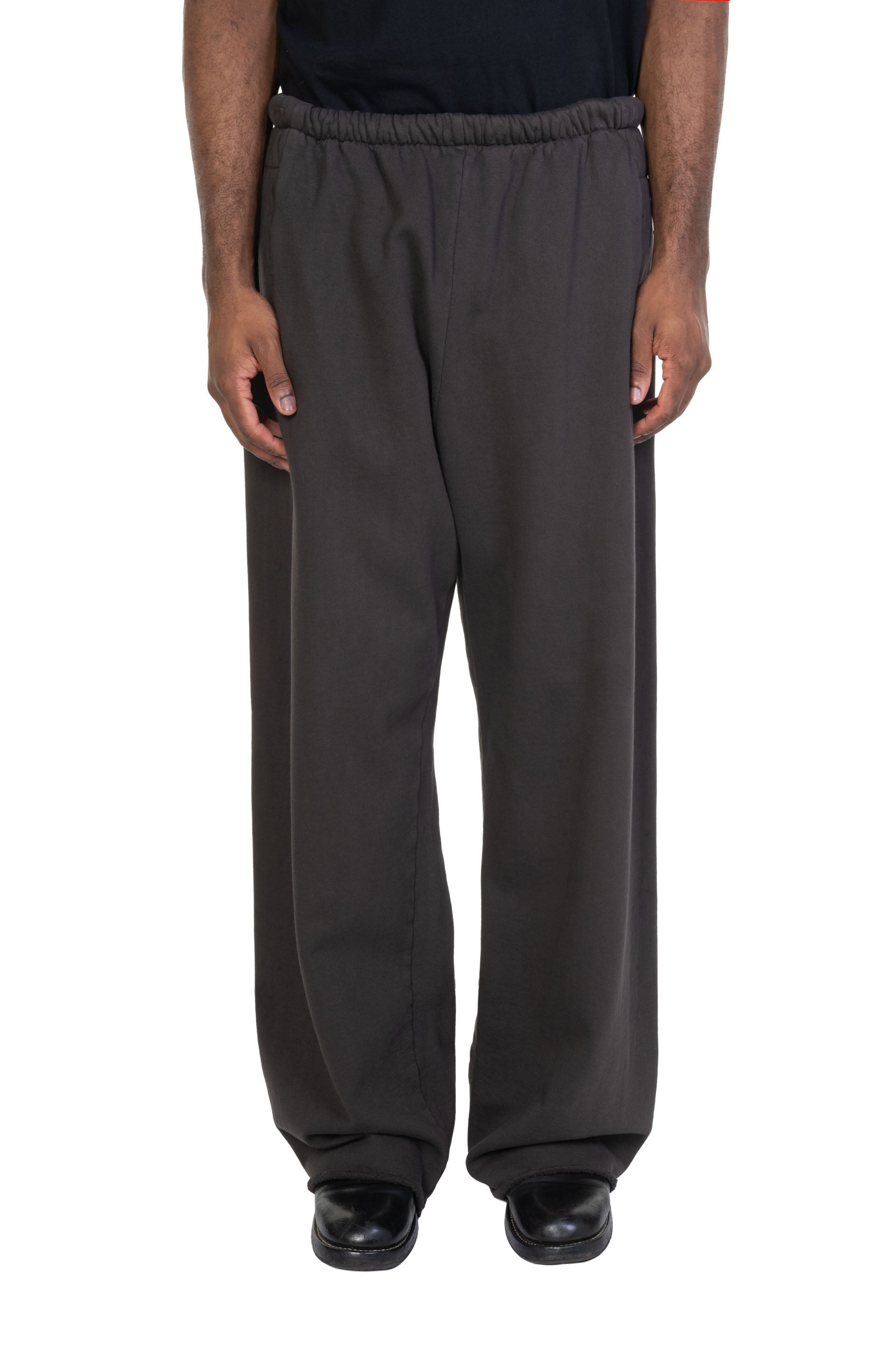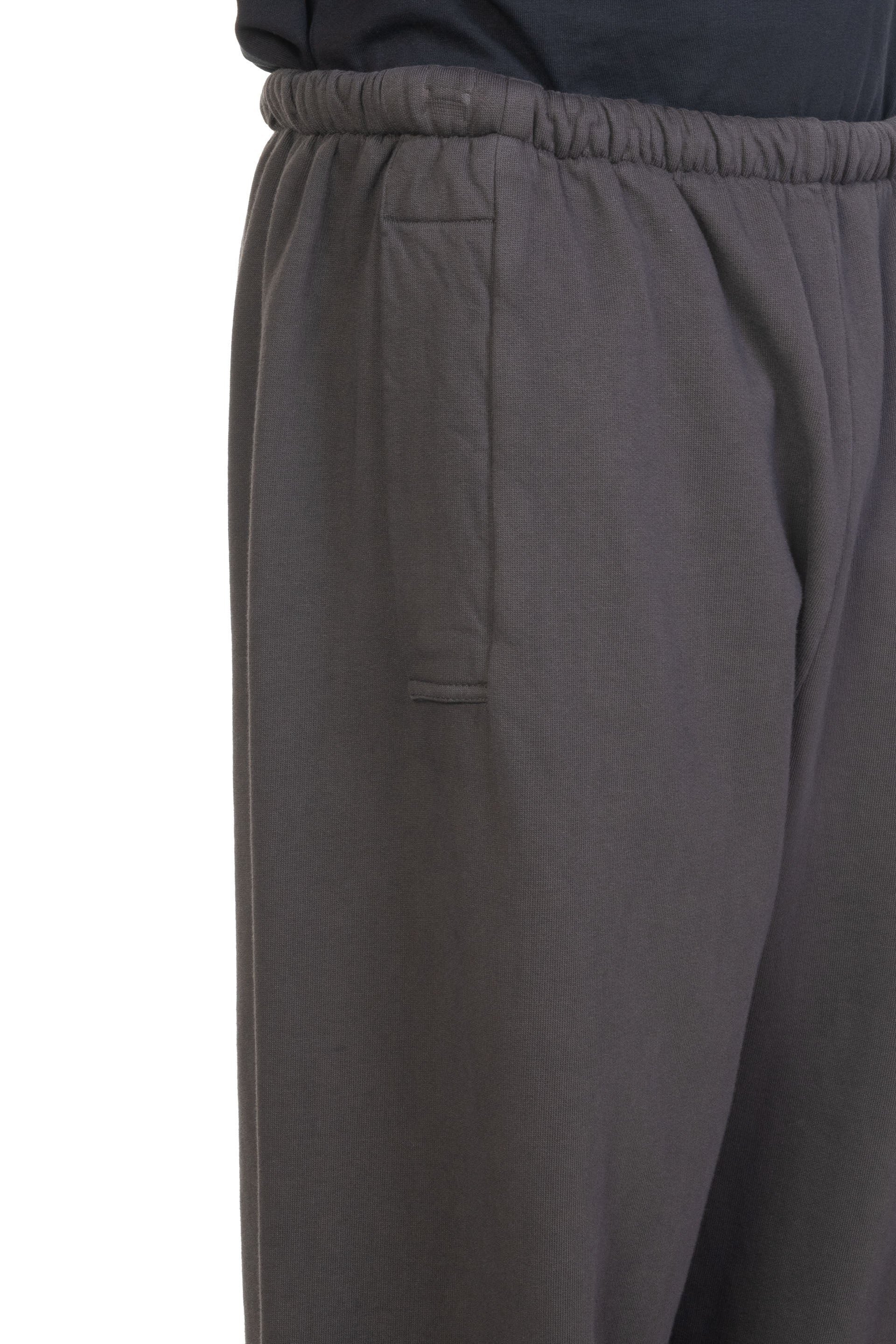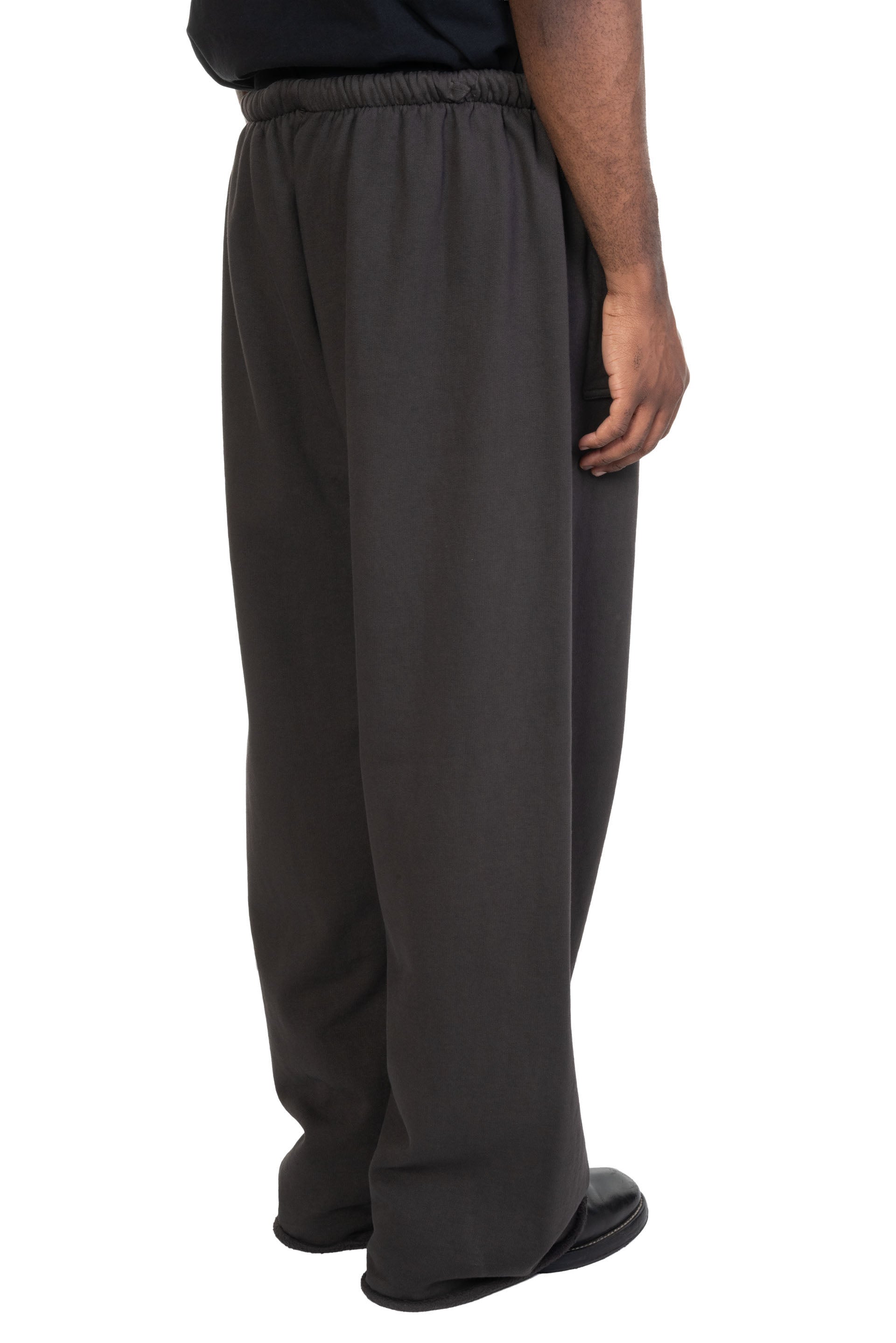 Gabriela Coll Garments Oversized, wide fitting, drawstring trousers cut from a heavy cotton fleece jersey in a garment dyed, muted deep brown. Feature a self drawstring, welted hand pockets at the waist with exaggerated oversized welt panels, and raw hems. Designed without a side seam, the silhouette is shaped by drawing the waist to the body, allowing the generous volume to hang freely from the hips and pool at the ankles. Reducing the total number of panels reduces overall seam bulk, making for a remarkably comfortable fit at the hips and waist.