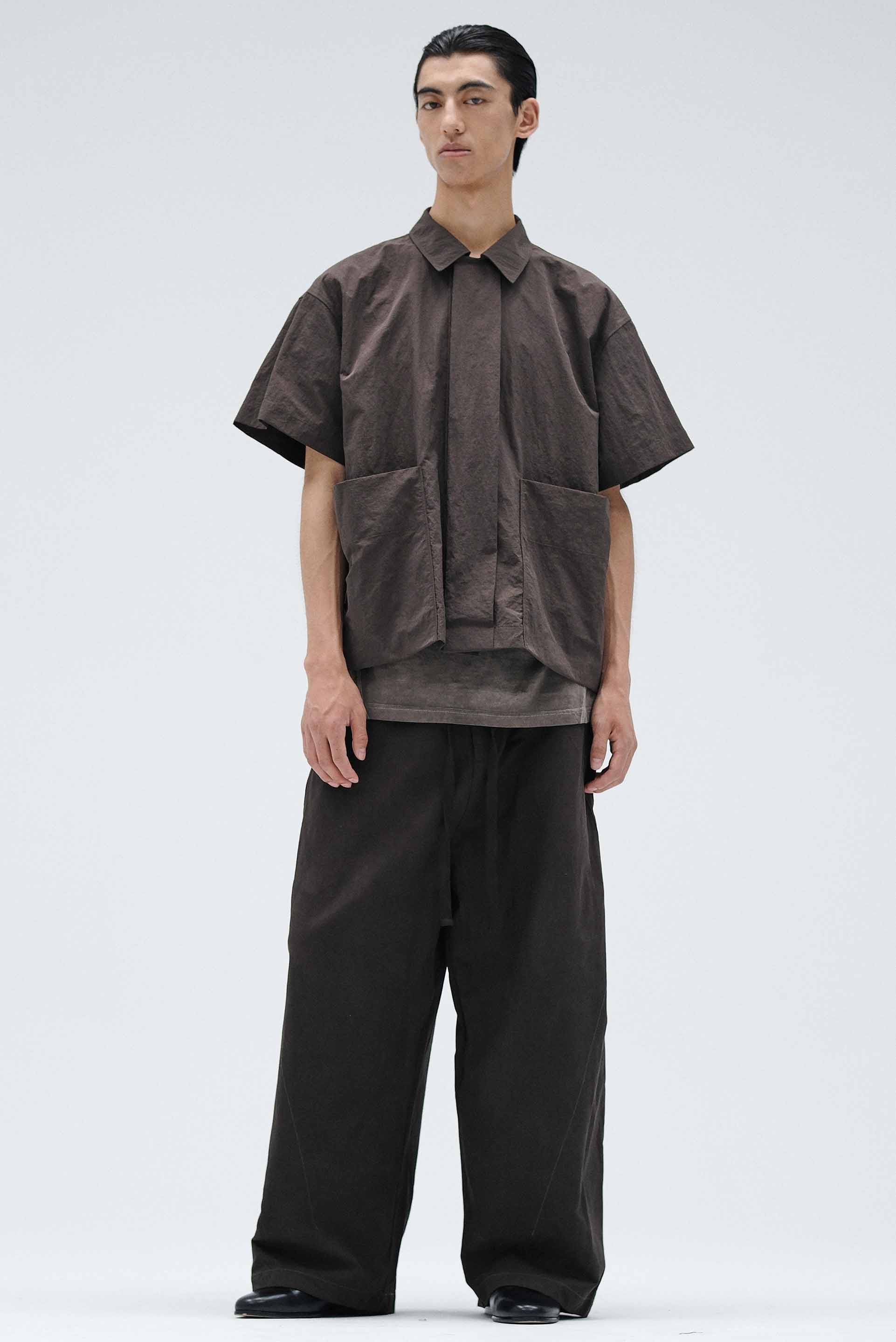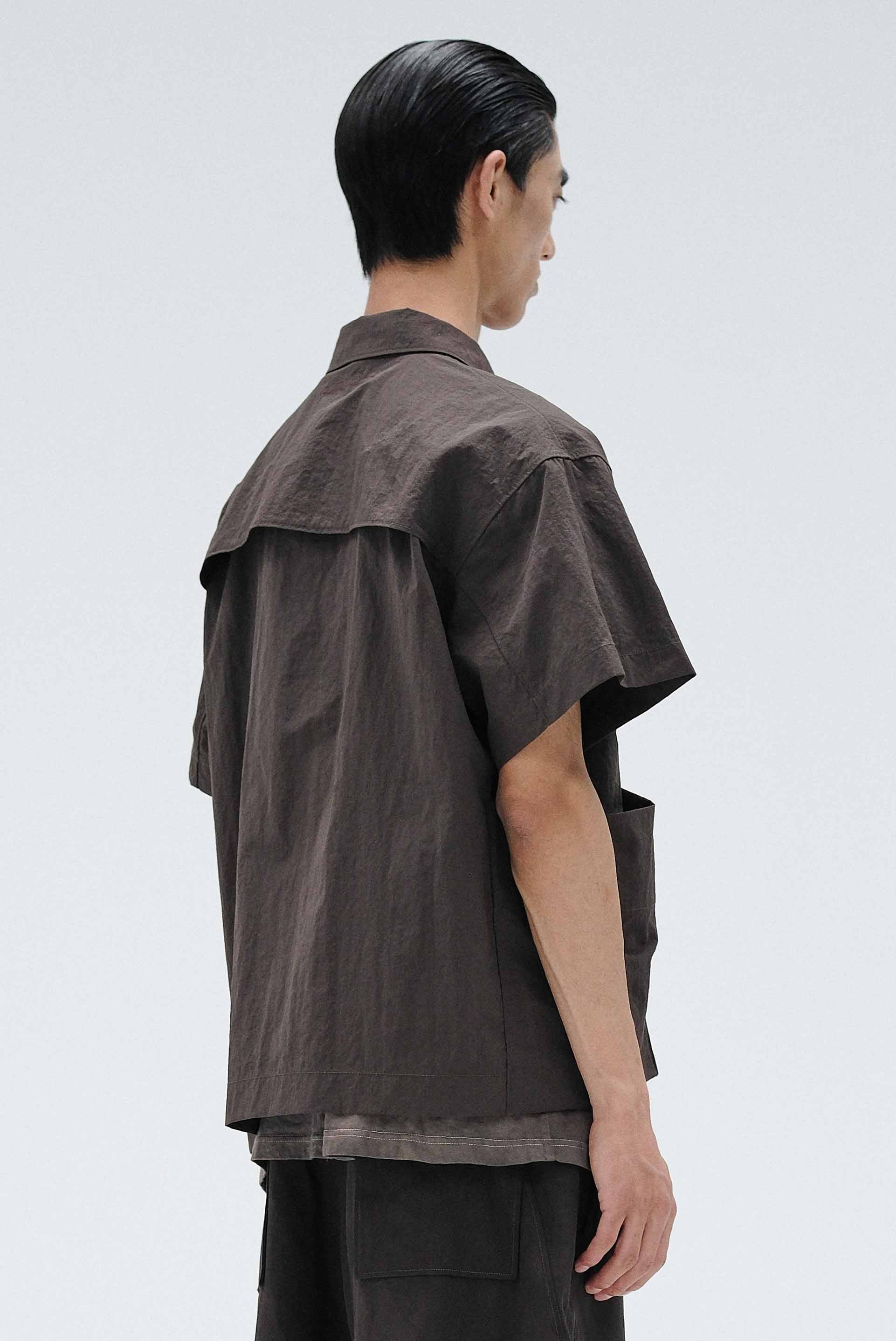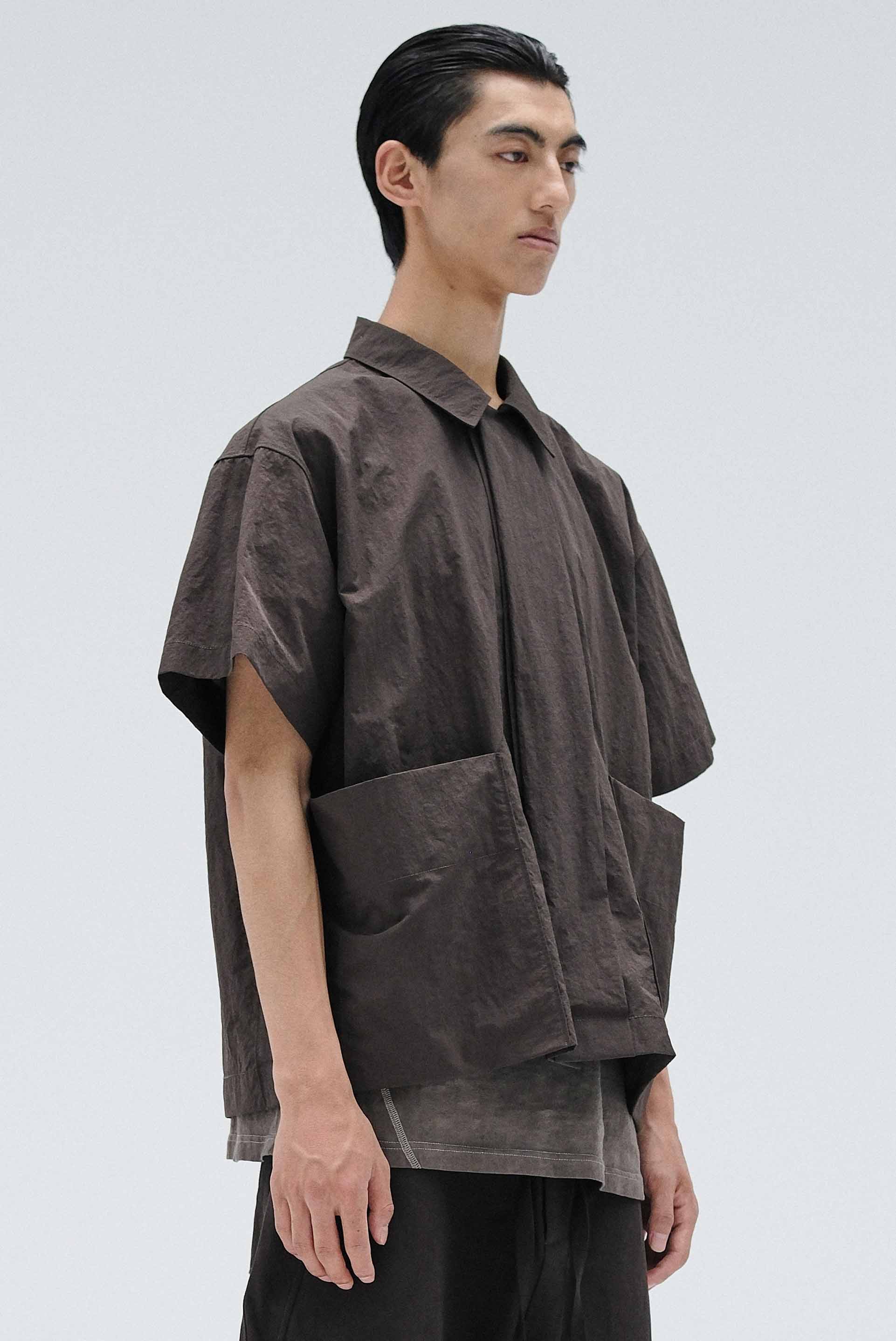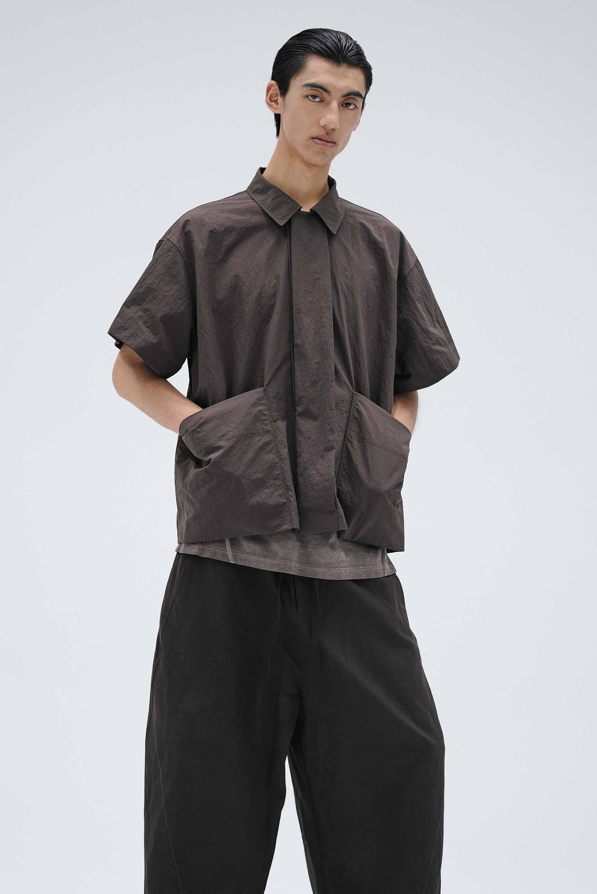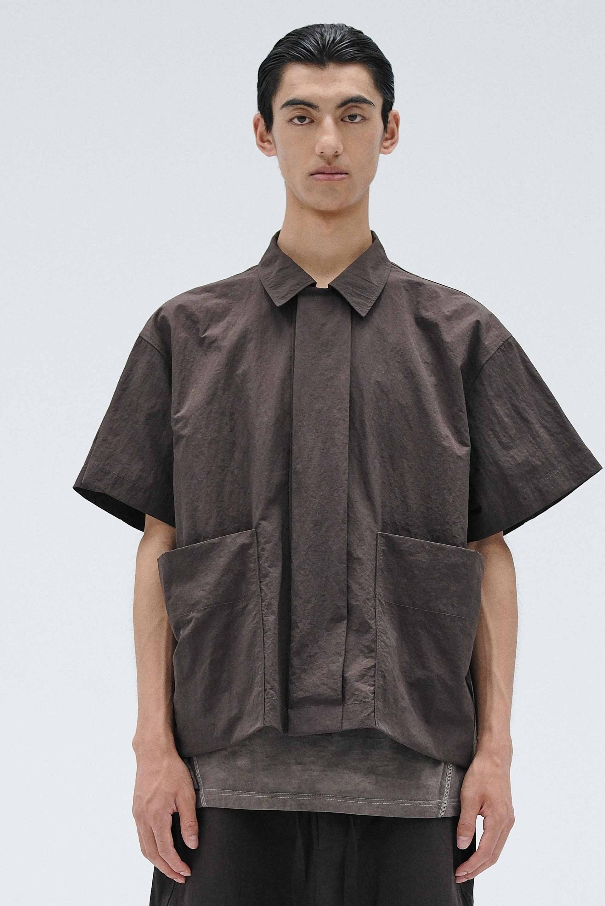 Attempt Nylon SS Shirt Brown. Short sleeves. Button closure at front. Soft paper like technical fabric. Boxy cut. Two pockets at front.