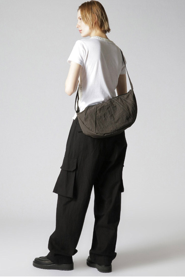 Random Stitch Pochette. Made of wrinkled nylon material with random double and single stitches combined with the fabric. Zip closure. Adjustable strap. Two interior compartments. Compact appearance. Easy Storage. Croissant like design.