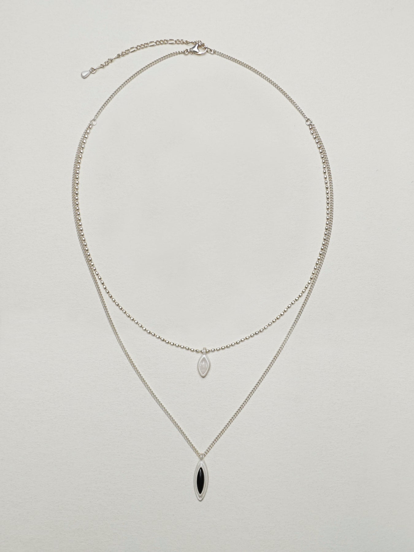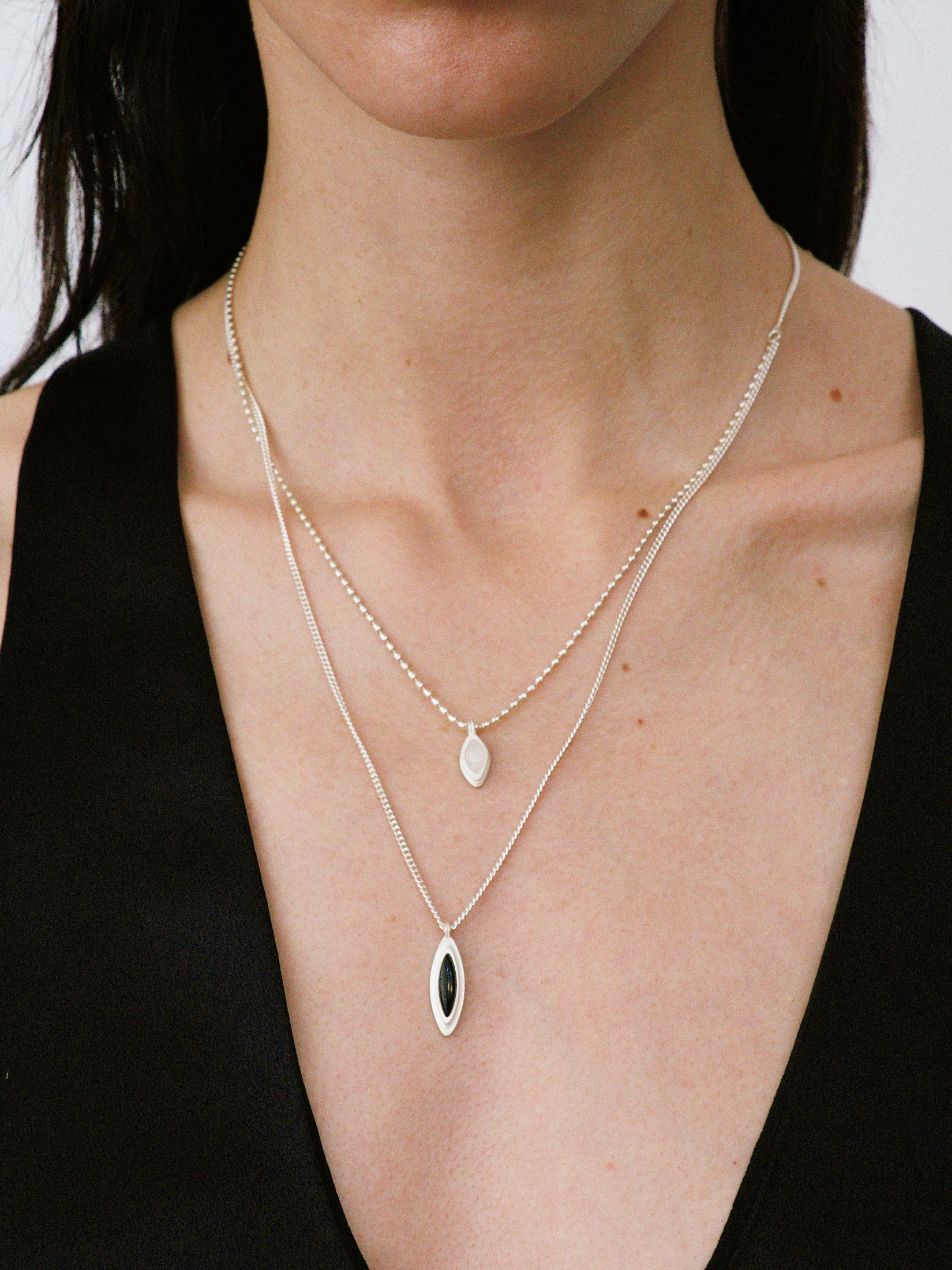 OLIO E ACETO is raw and authentic. It is about the companionship between people, and objects like the matte white surface becoming a blank canvas to be filled by the wearer as seen with the Obsidian Double Pendant Necklace.