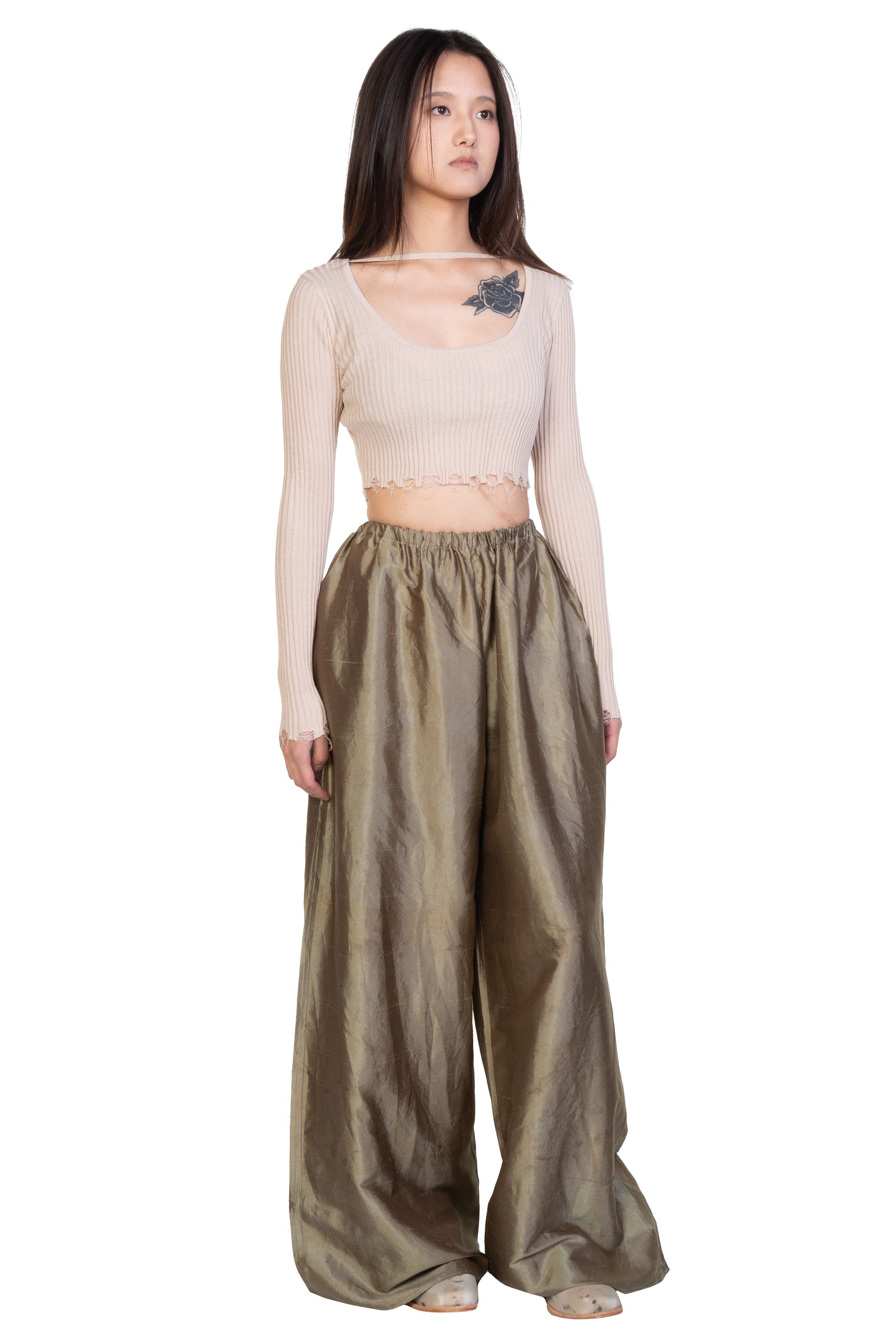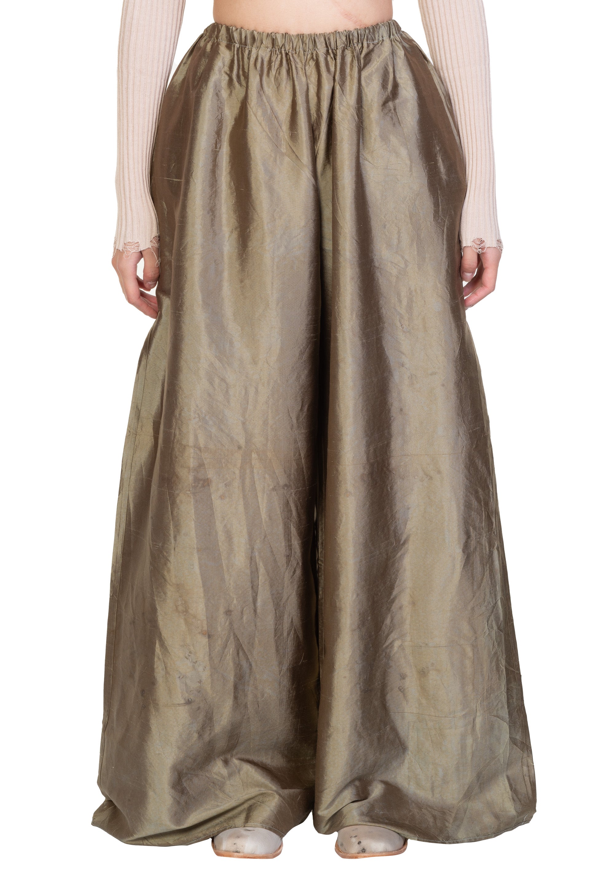 Yu Qun believes that everyone's character is multi-faceted and expressing spiritual independence. Fine hand-stitched threads, old mottled colours and patterns, and unconventional cuts are what Mute Dance has been exploring. The leaves and stems of fresh plants and berries, dried medicinal materials, old metals and so on are combined with the ancient and traditional dyeing technology to dye fabrics and paper as seen with the Olive Silk Dyed Trousers.