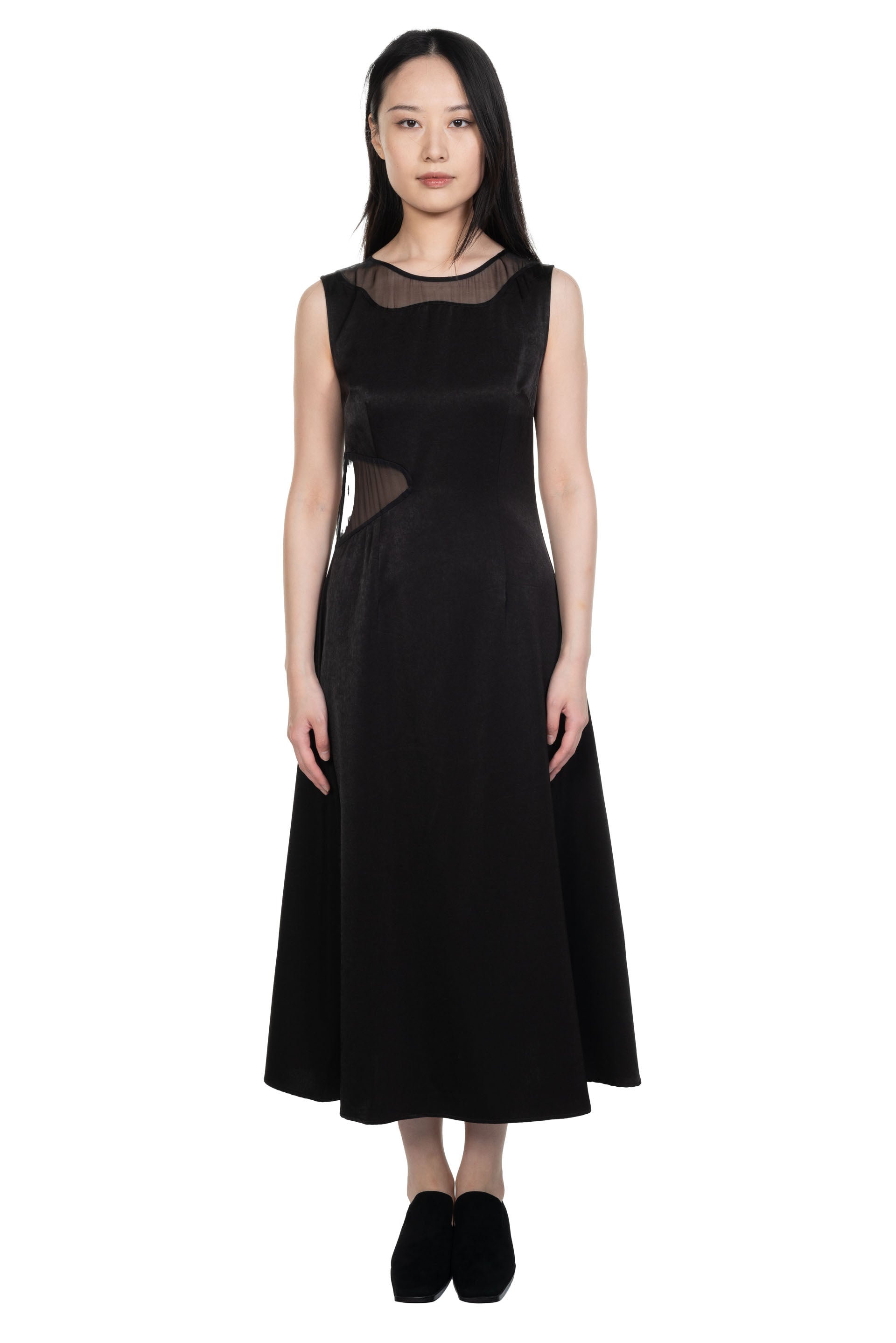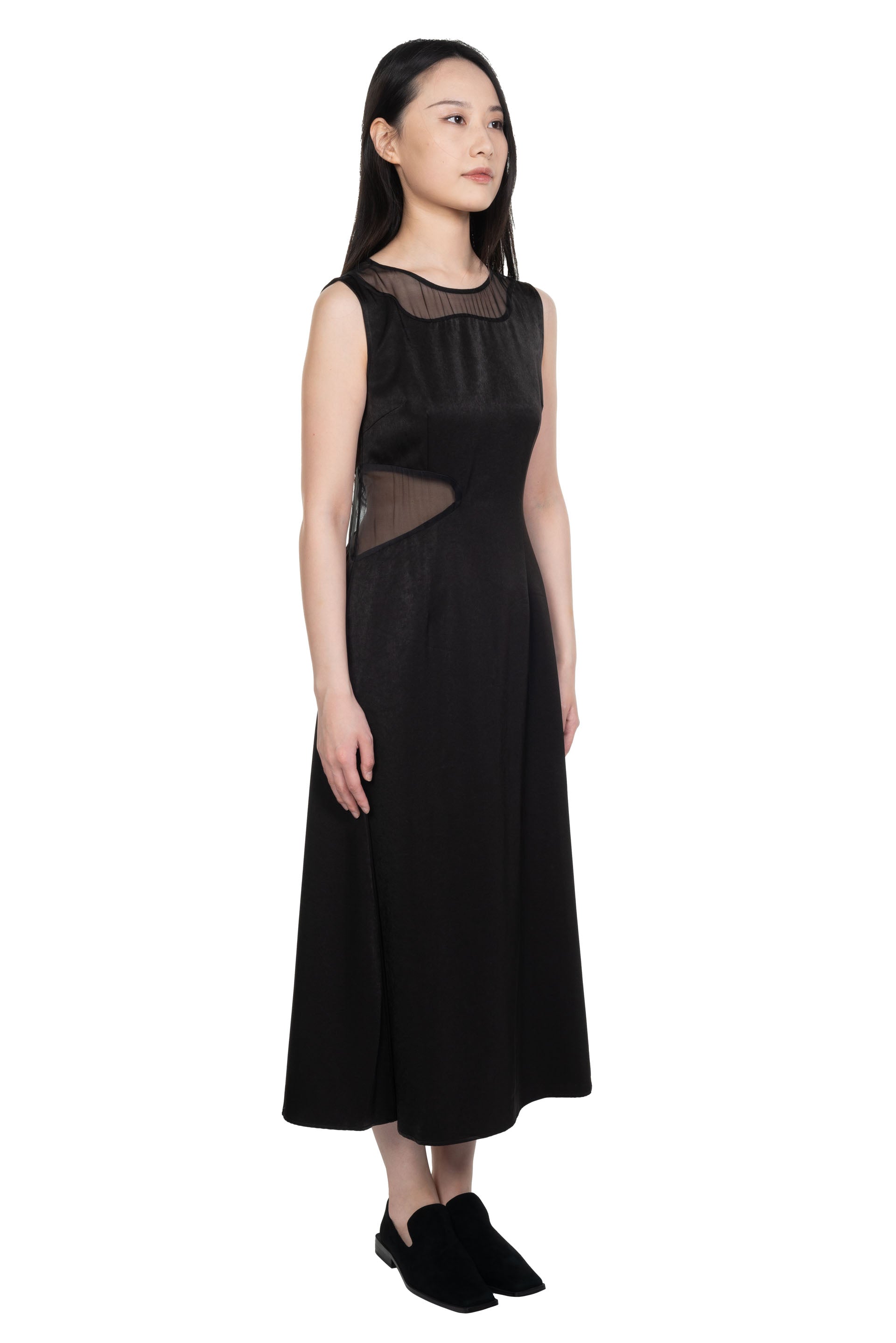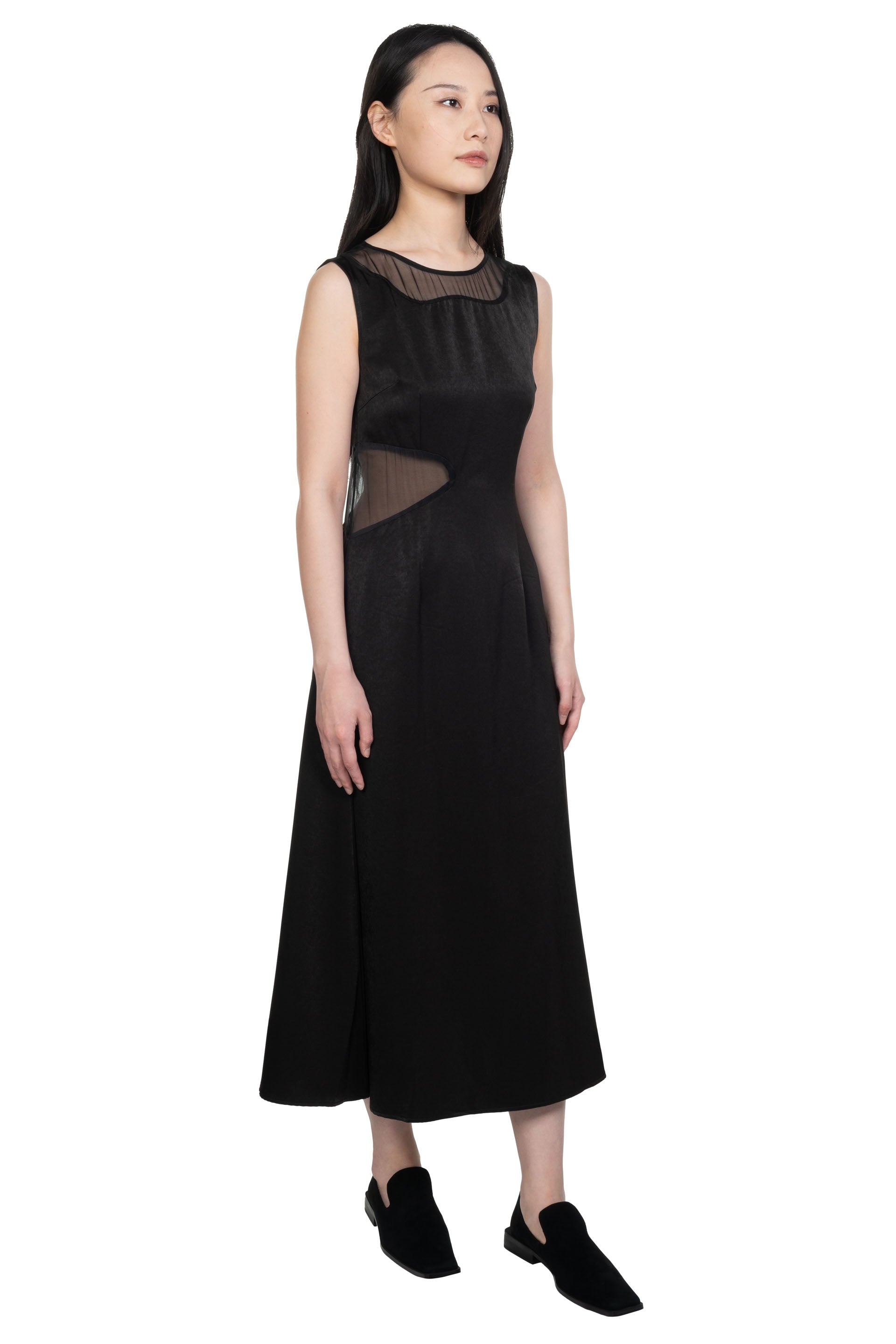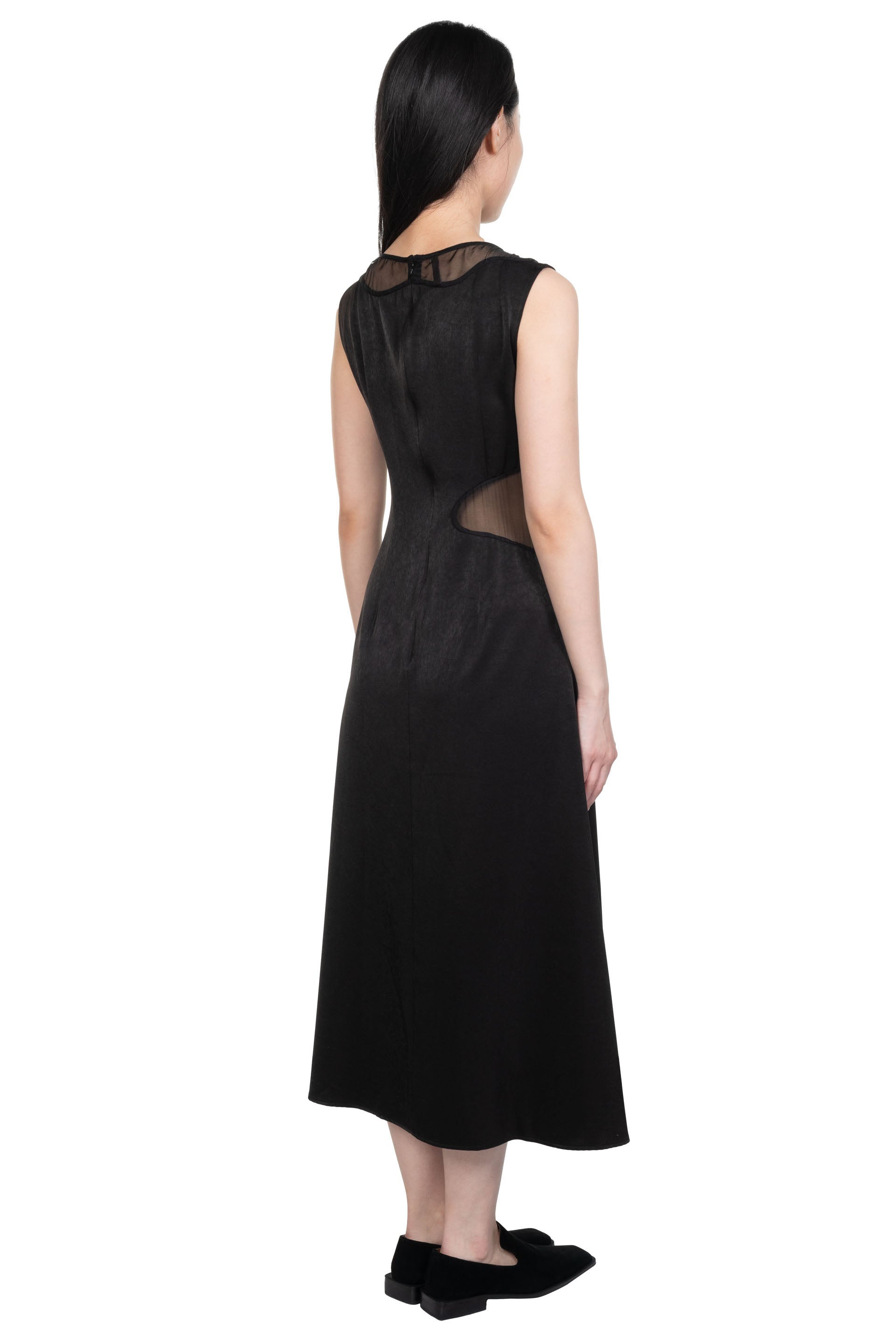 Sleeveless. Tank dress. Zip closure at side. Cut out detailing. See through details. Contrast fabric. Ankle length.