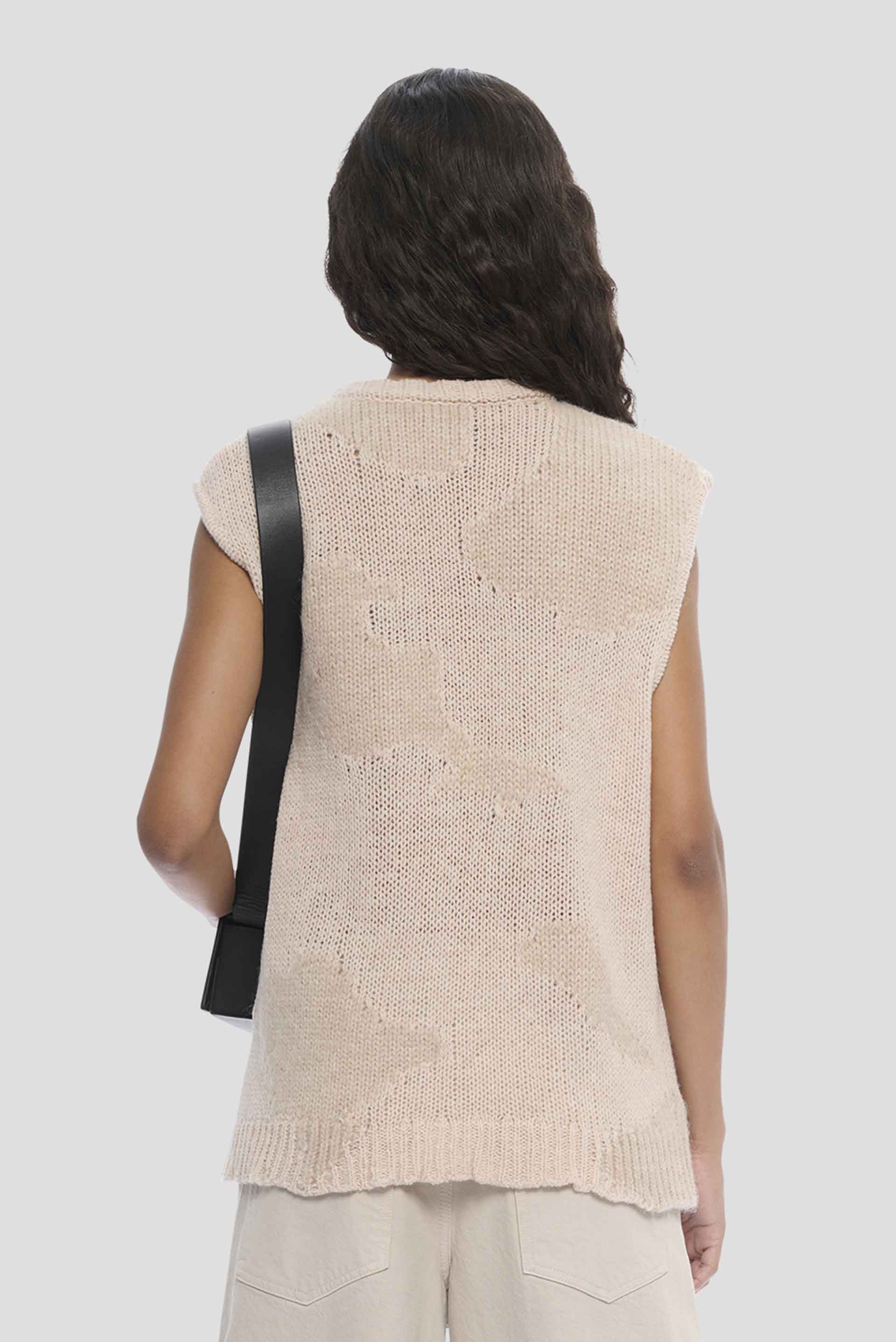 Heliot Emil Ophiolite Knit Vest Stone. Sleeveless. Round neck. Knit with seasonal pattern. Long fit. Soft texture.