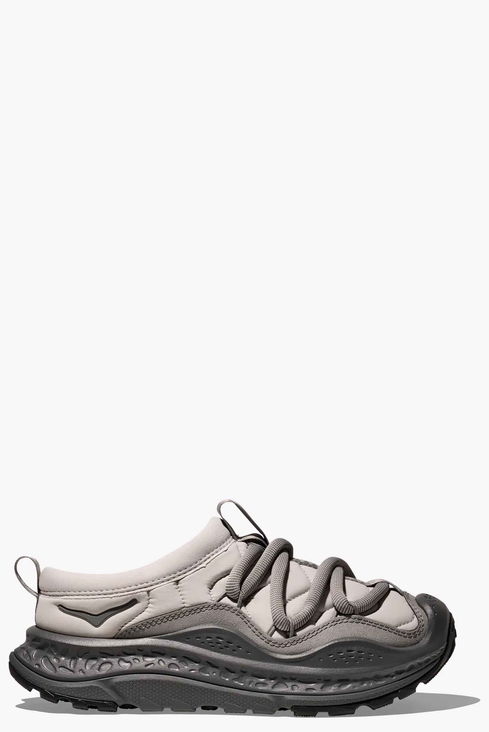 Hoka one one Ora Primo Stardust / Satellite Grey. Insulated puff upper. Knit collar. Zig-zag stitch detail. Round elastic lace system. Protective toe bumper. 30% recycled rubber outsole