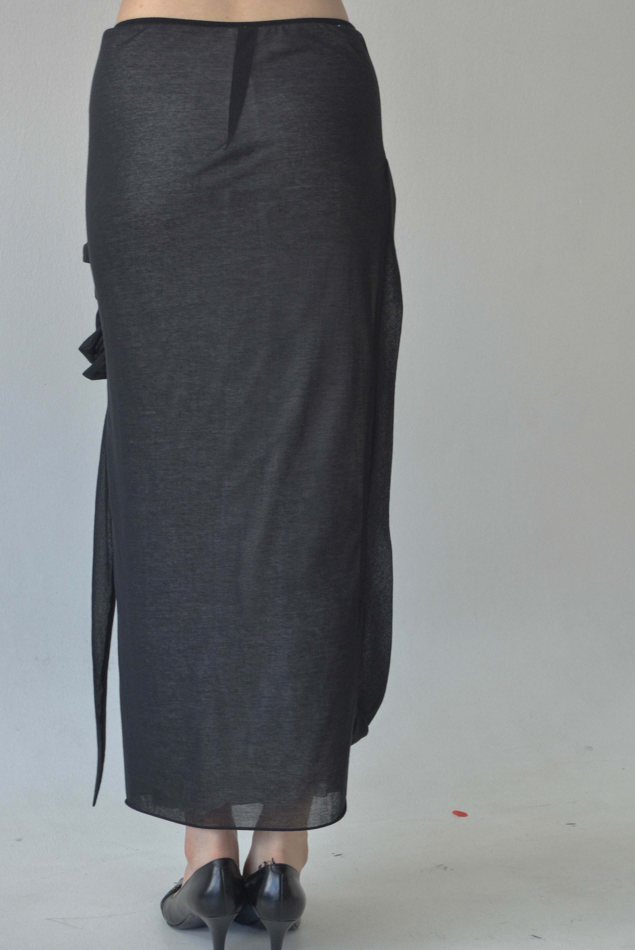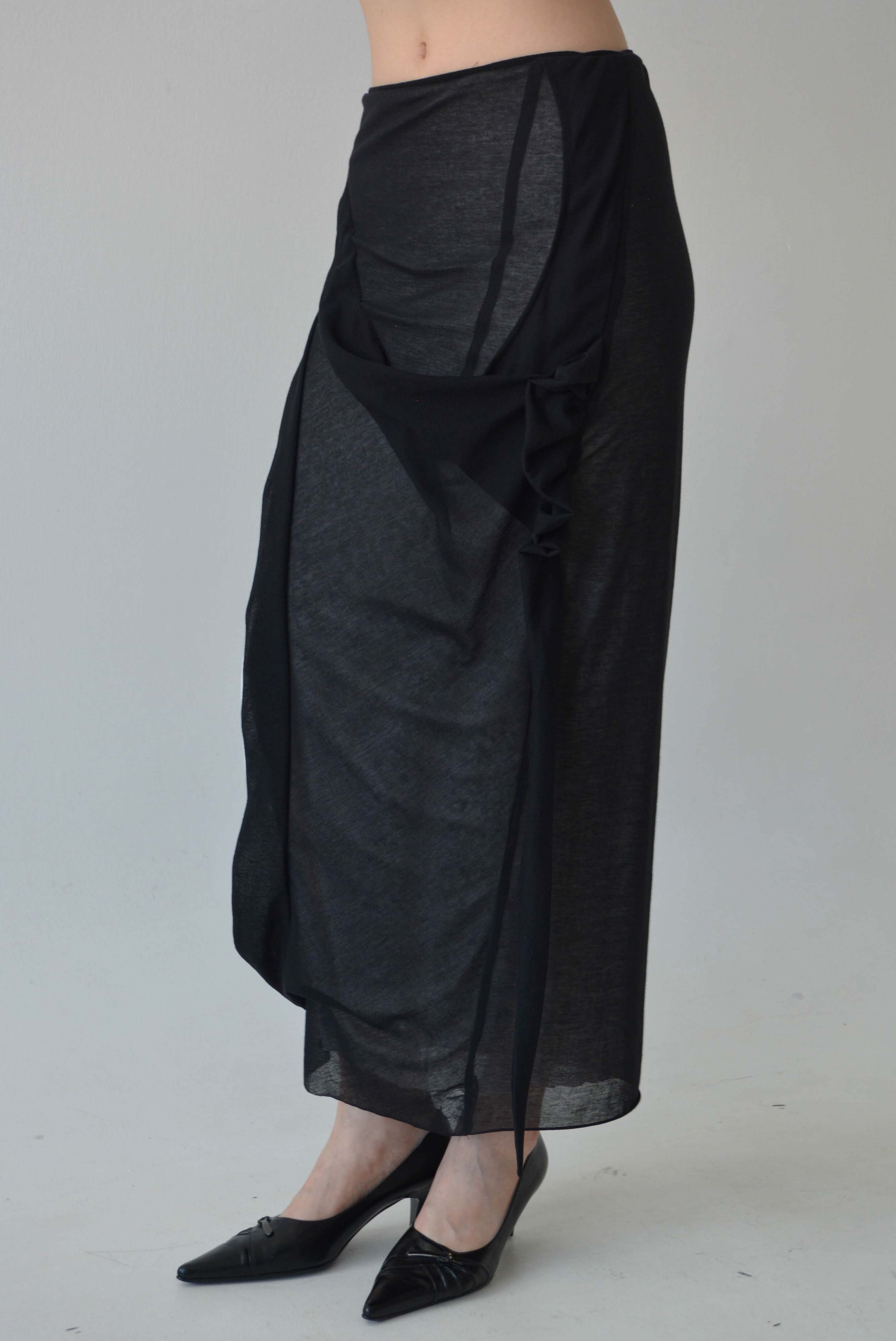 Oracle Long Skirt is a sheer black jersey maxi skirt lined with white jersey with big side out-out and draping details. Maxi length skirt.Low waist fit.