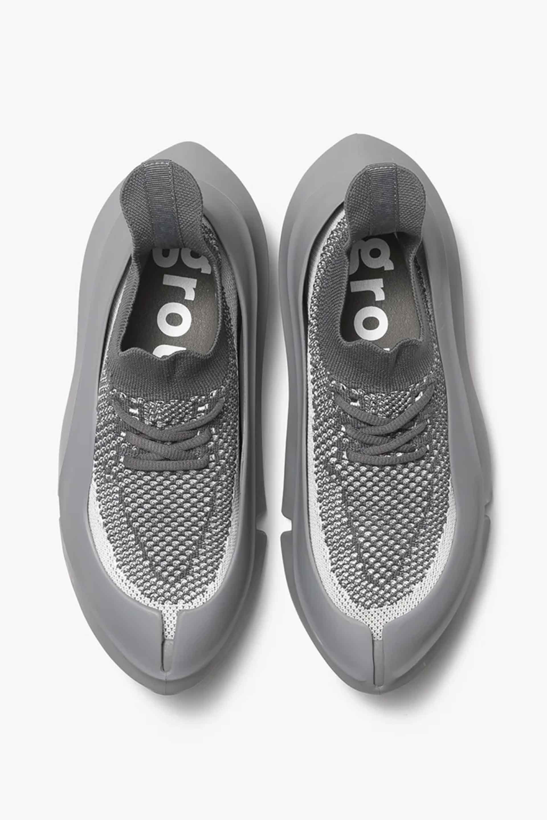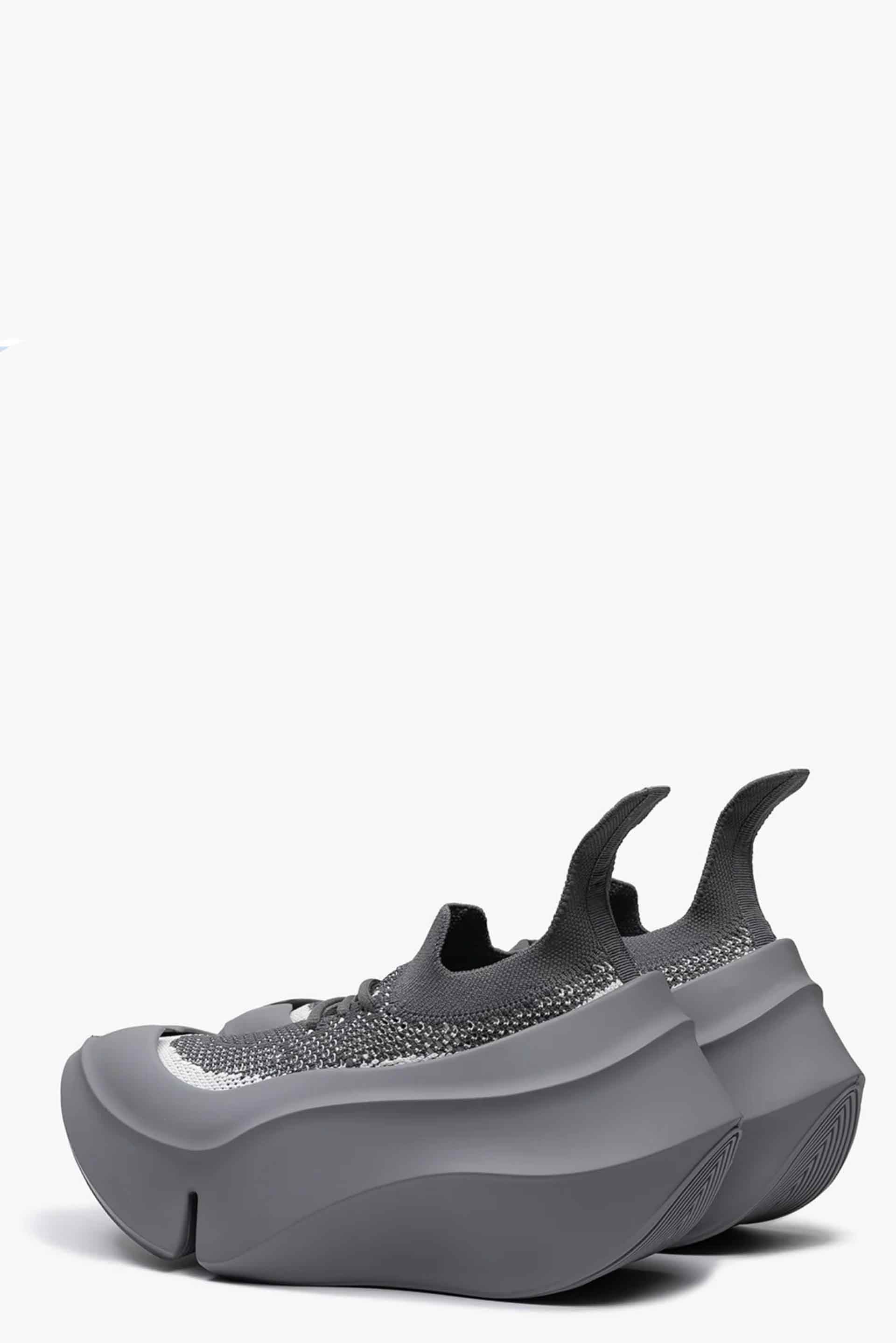 The upper is knit in the image of an orca as well. It follows the curves of the outsole and is extremely long at the heel. The knitted fabric is coarse to give a cool impression.