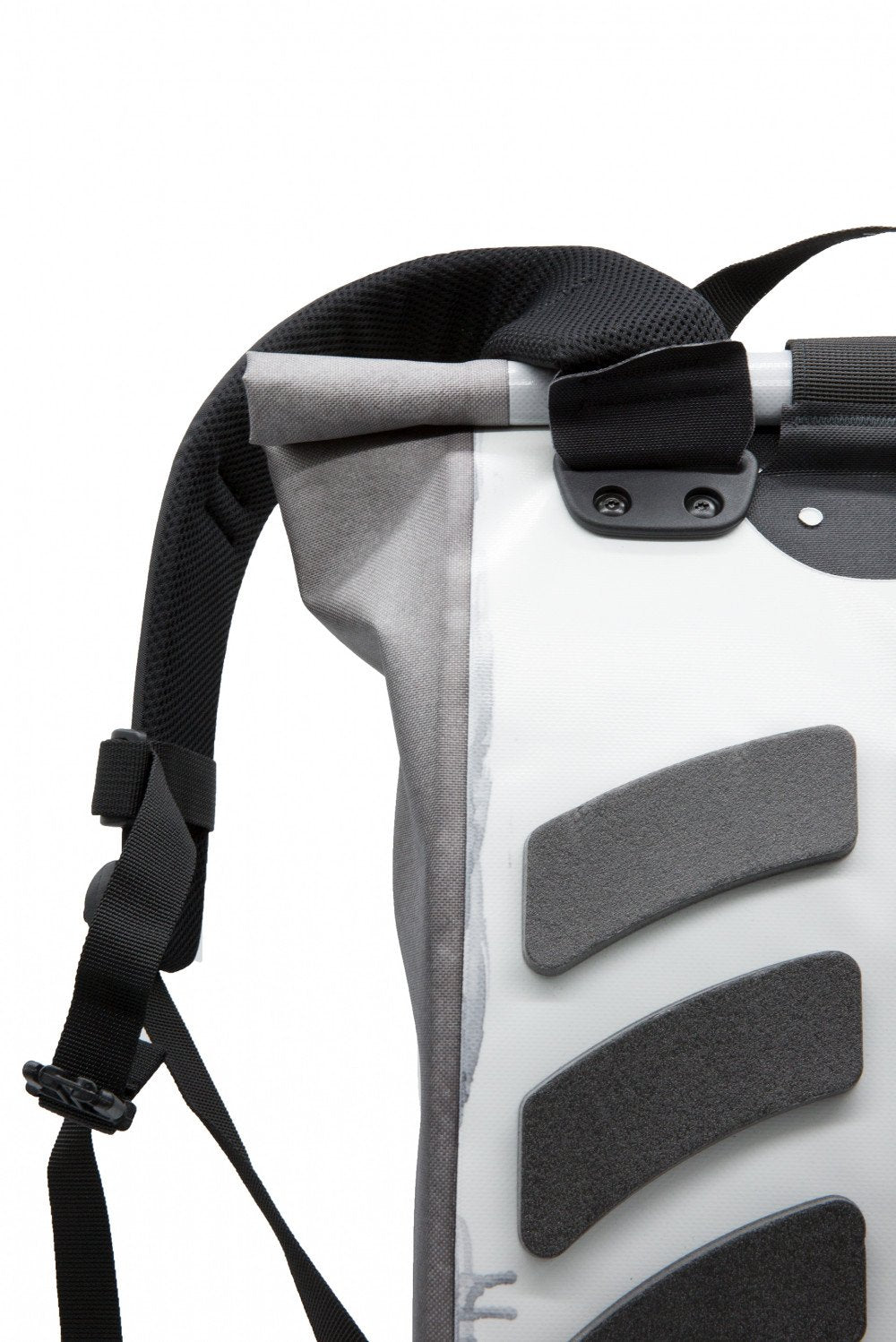 11 by Boris Bidjan Saberi Dark Grey Ortlieb Velocity2 Backpack. Waterproof coated canvas backpack in tones of grey and black. Webbing carry handle at top. Adjustable padded shoulder straps featuring press-release webbing sternum strap. Webbing belt-style strap with press-release fastening. Tonal bonded panel and logo at face. Logo printed in grey at side. Tonal foam pads at back face. Watertight quick seal zip closure and Velcro fastening at fold-over throat. Detachable padded zip laptop pouch with press-stud fastening at interior. Black hardware