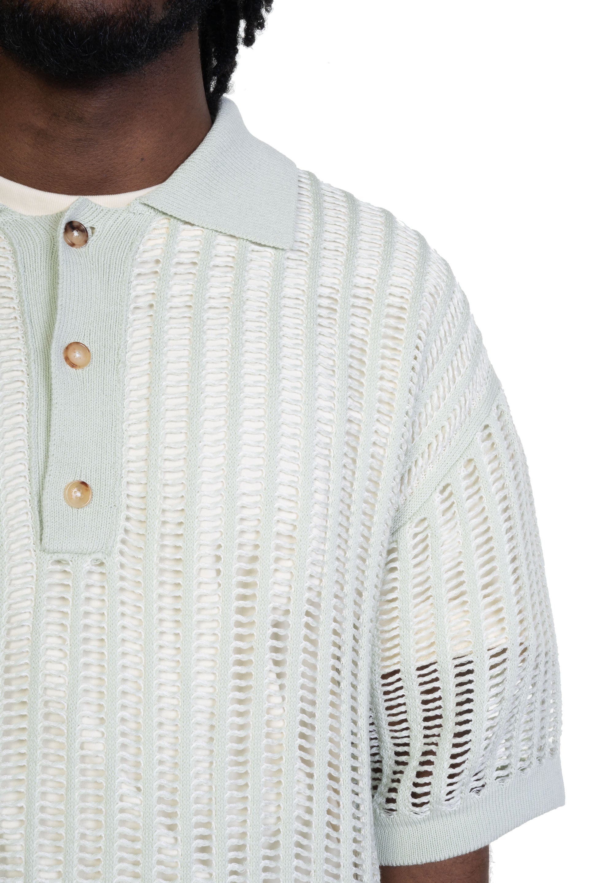 Feng Chen Wang Knitted polo is inspired by traditional Chinese Celadon. Button closure at neck. Short sleeves. Relaxed fit. Oversized.