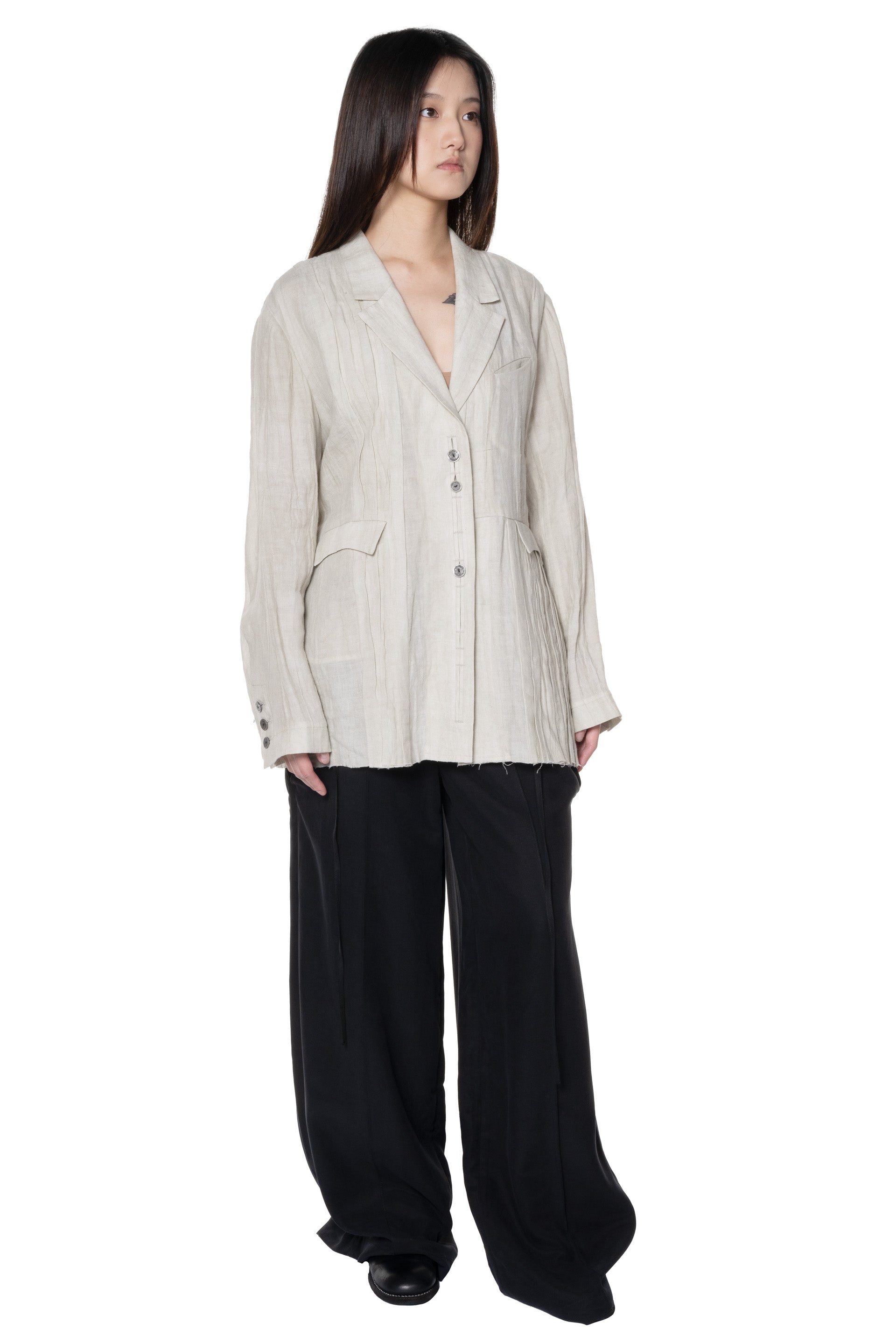 Professor. E Oversized Pleated Blazer Natural Dyed Beige. Forgotten Material blazer. Long sleeves. Button closure at front. Button at cuffs. Pleats throughout. Drawstring closure at side. Two pockets at side. Lined. Oversized fit. One size.
