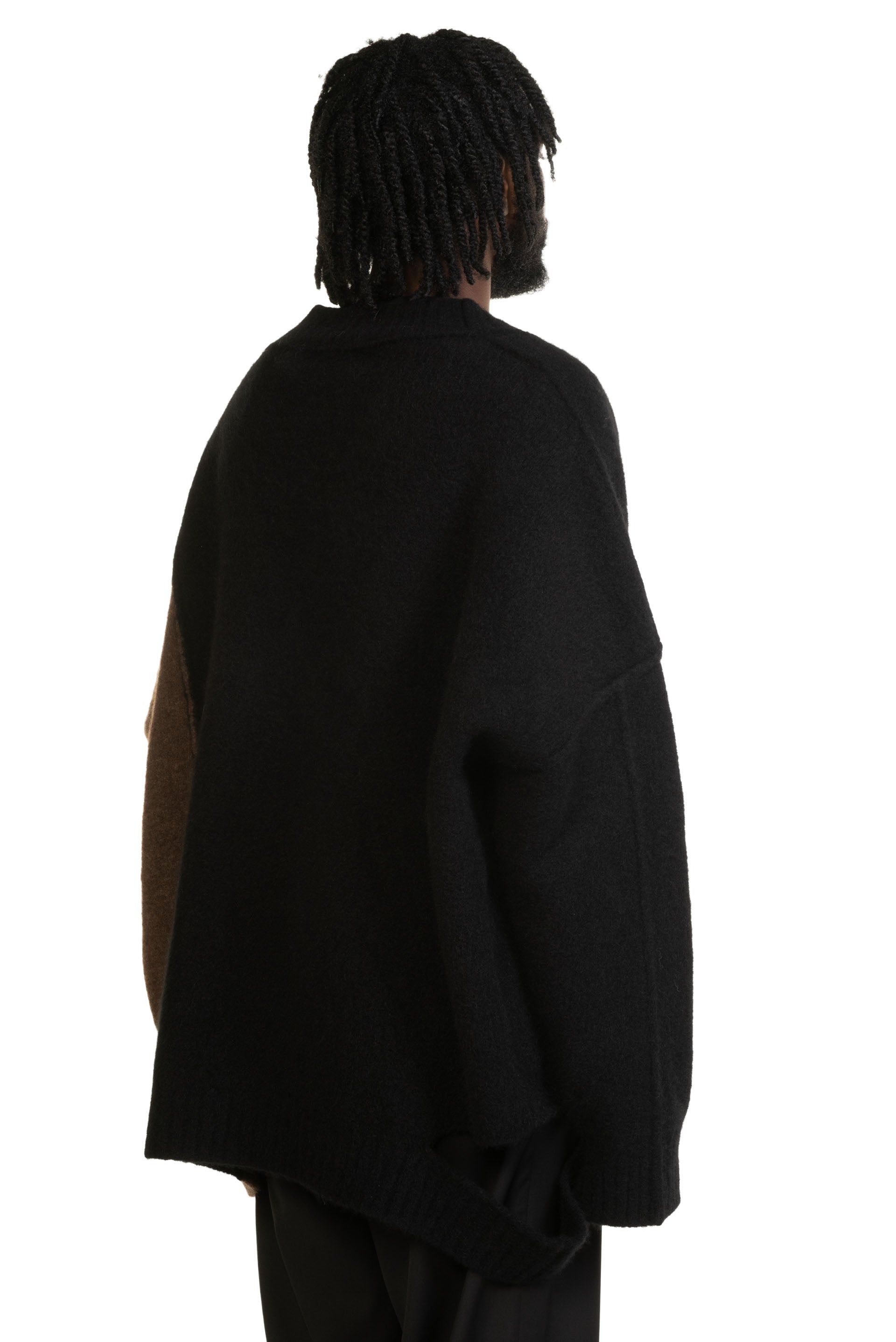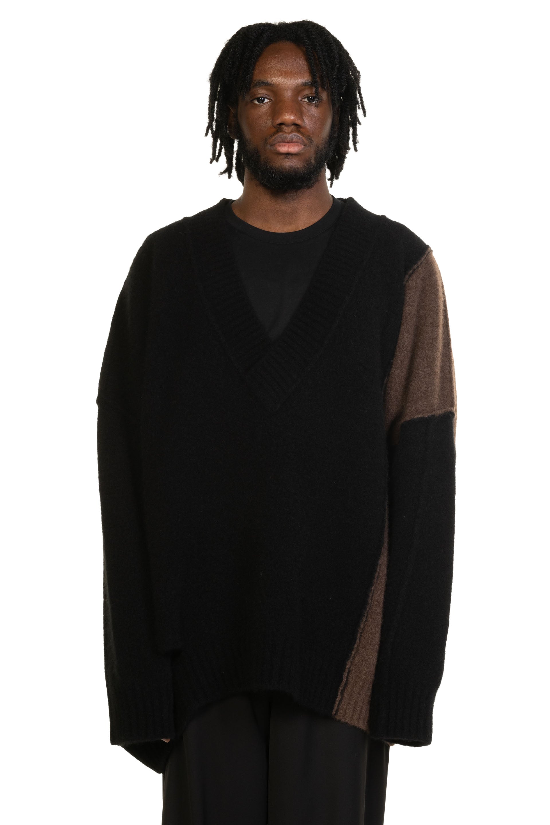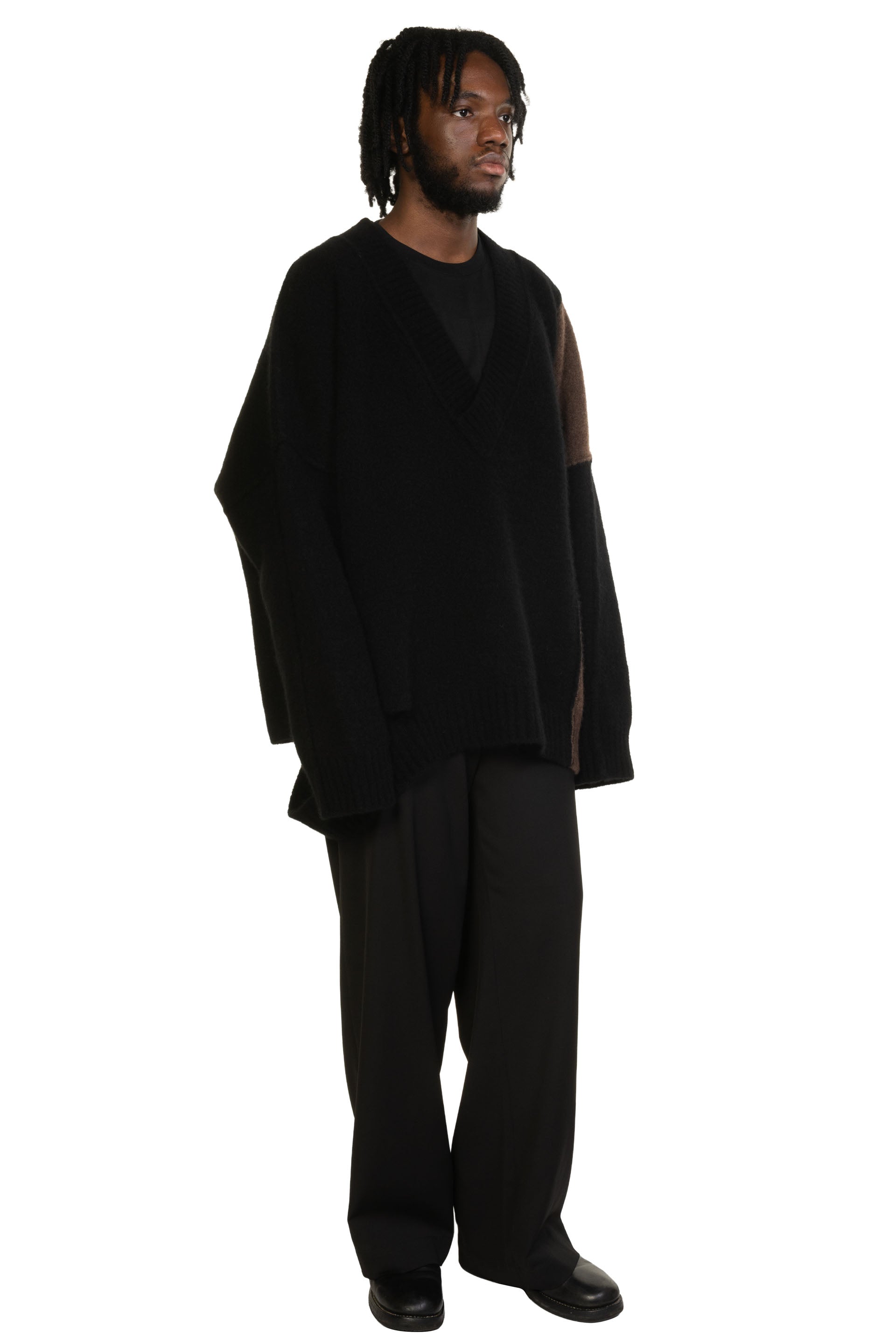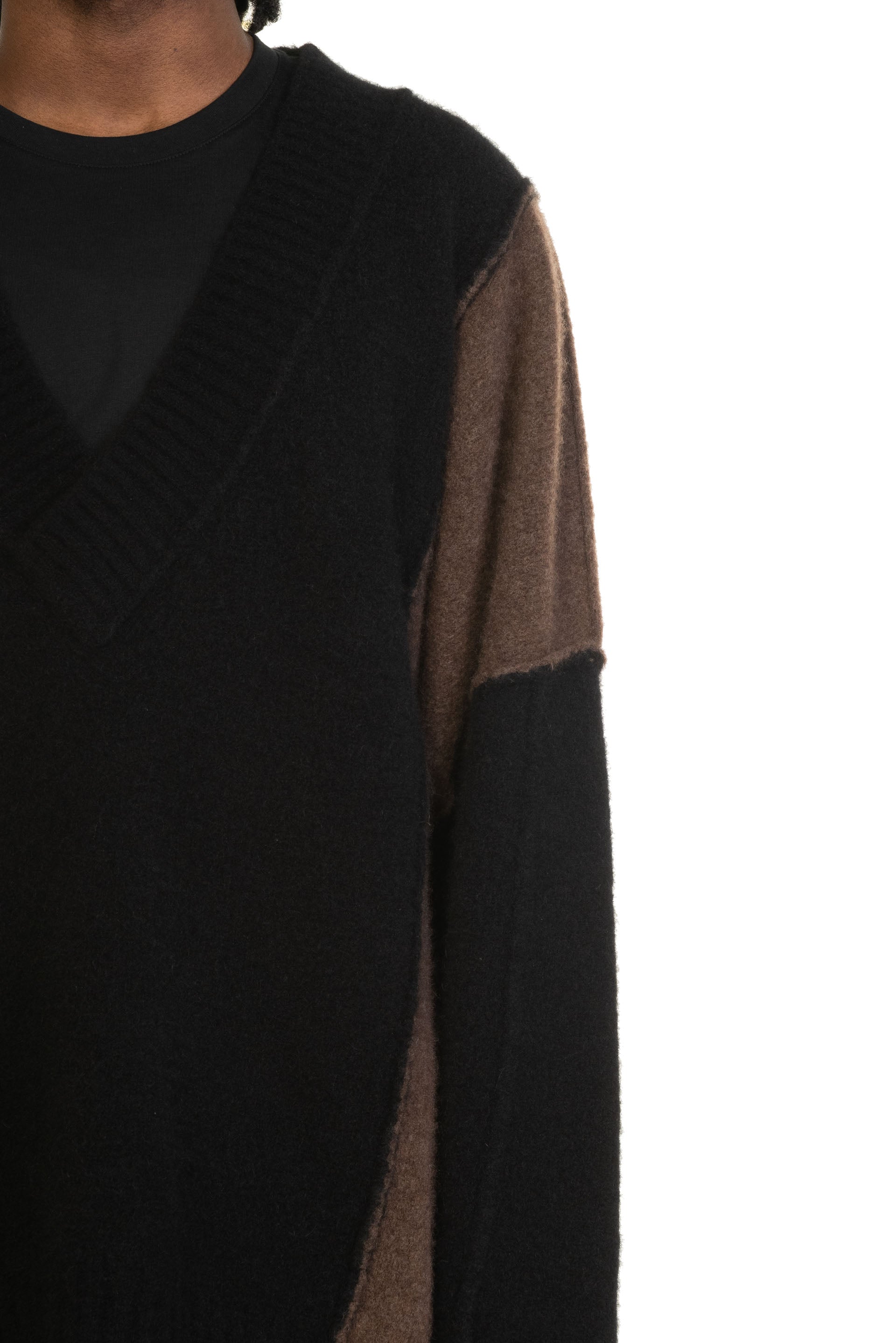 Long sleeve knit yak and merino wool-blend sweater colour-blocked in black. Exposed seams throughout. Rib knit V-neck collar, cuffs, and hem. Dropped shoulders. Cut-outs at side-seam. One Size.