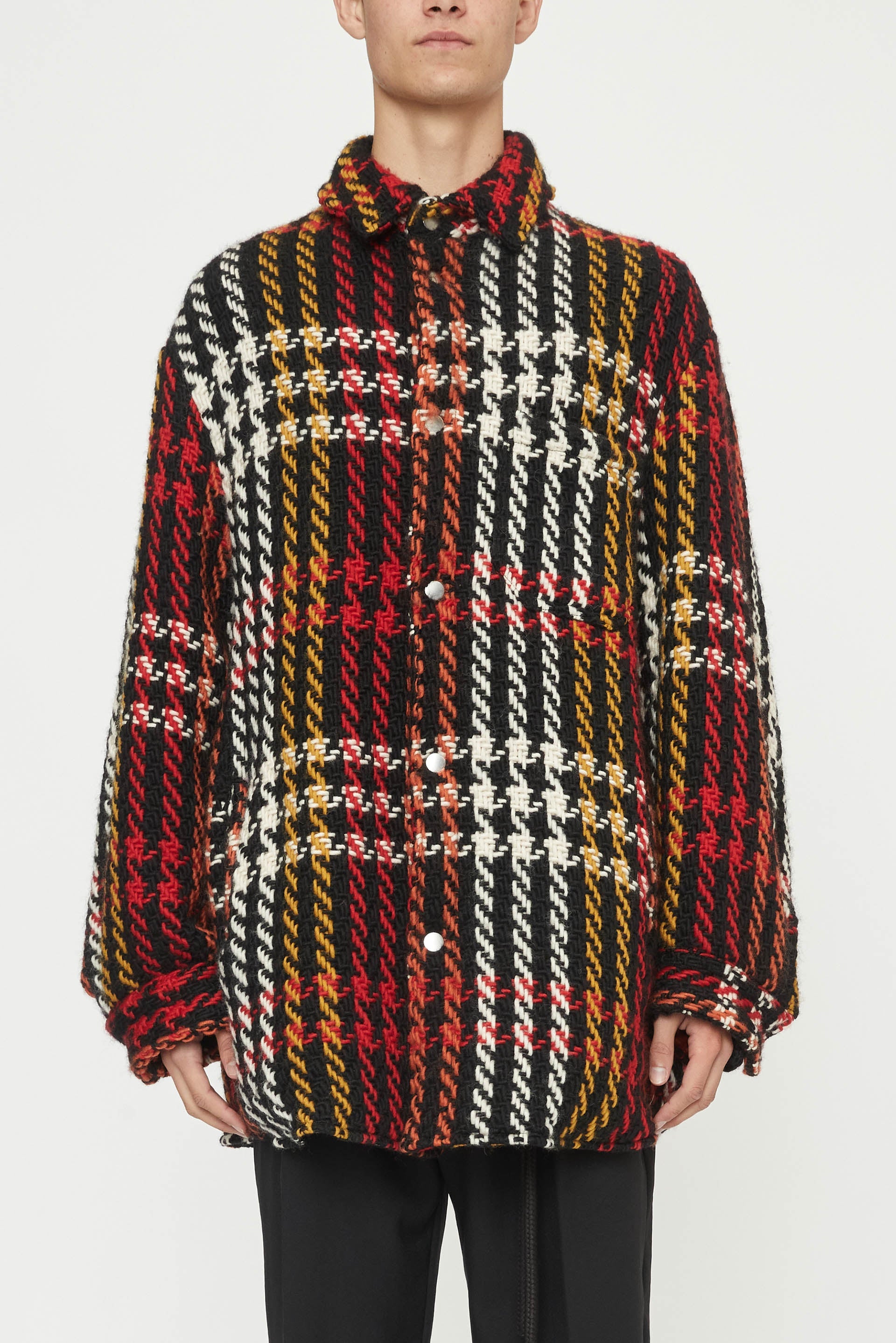 Song for the Mute Jacket. Long sleeves. Button closure at front and cuffs. Thick knit with check details. Two side pockets. One chest pocket.