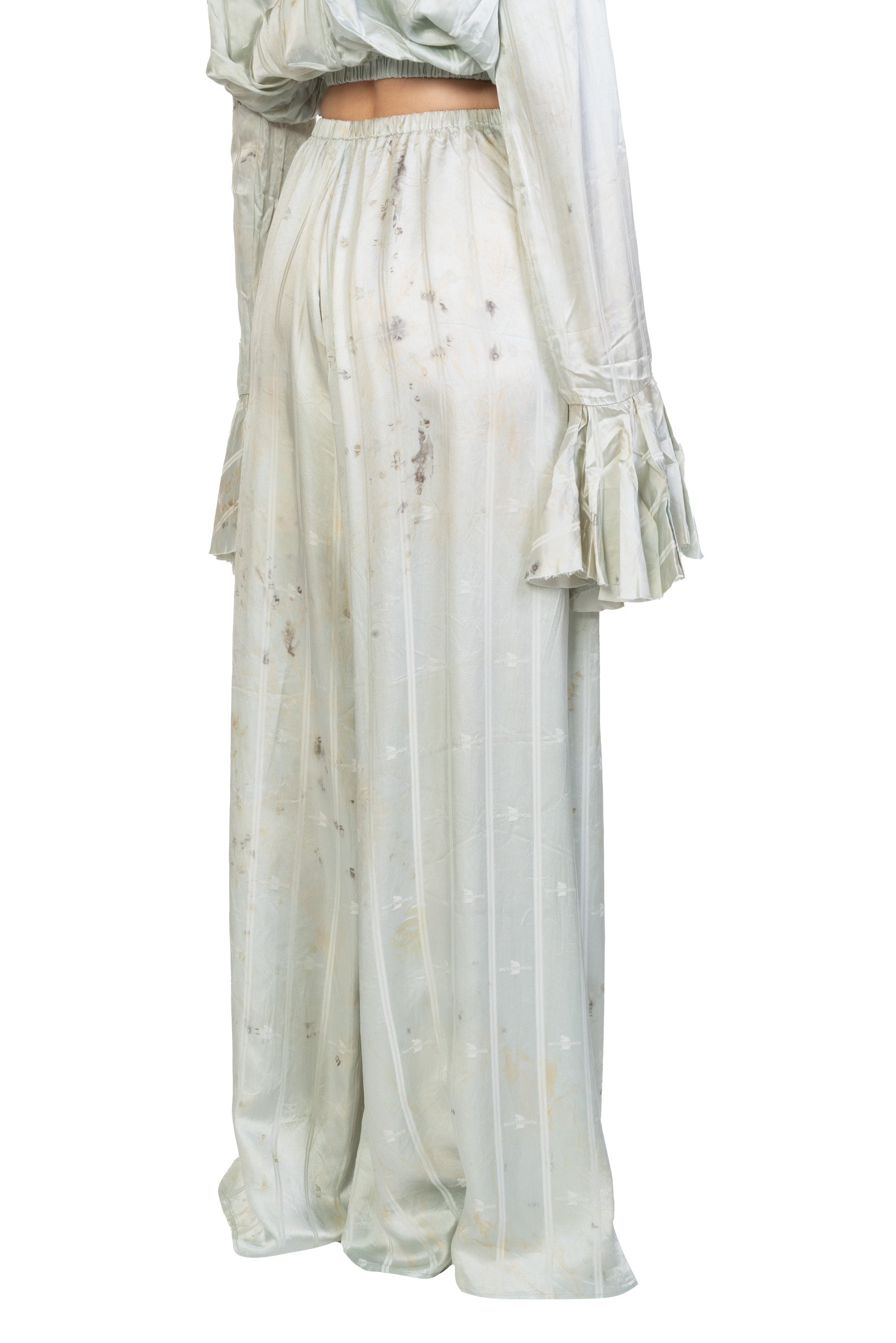 Elastic waist. Two side pockets. Wide fit. Stripe detailing throughout. Dyed silk fabric.