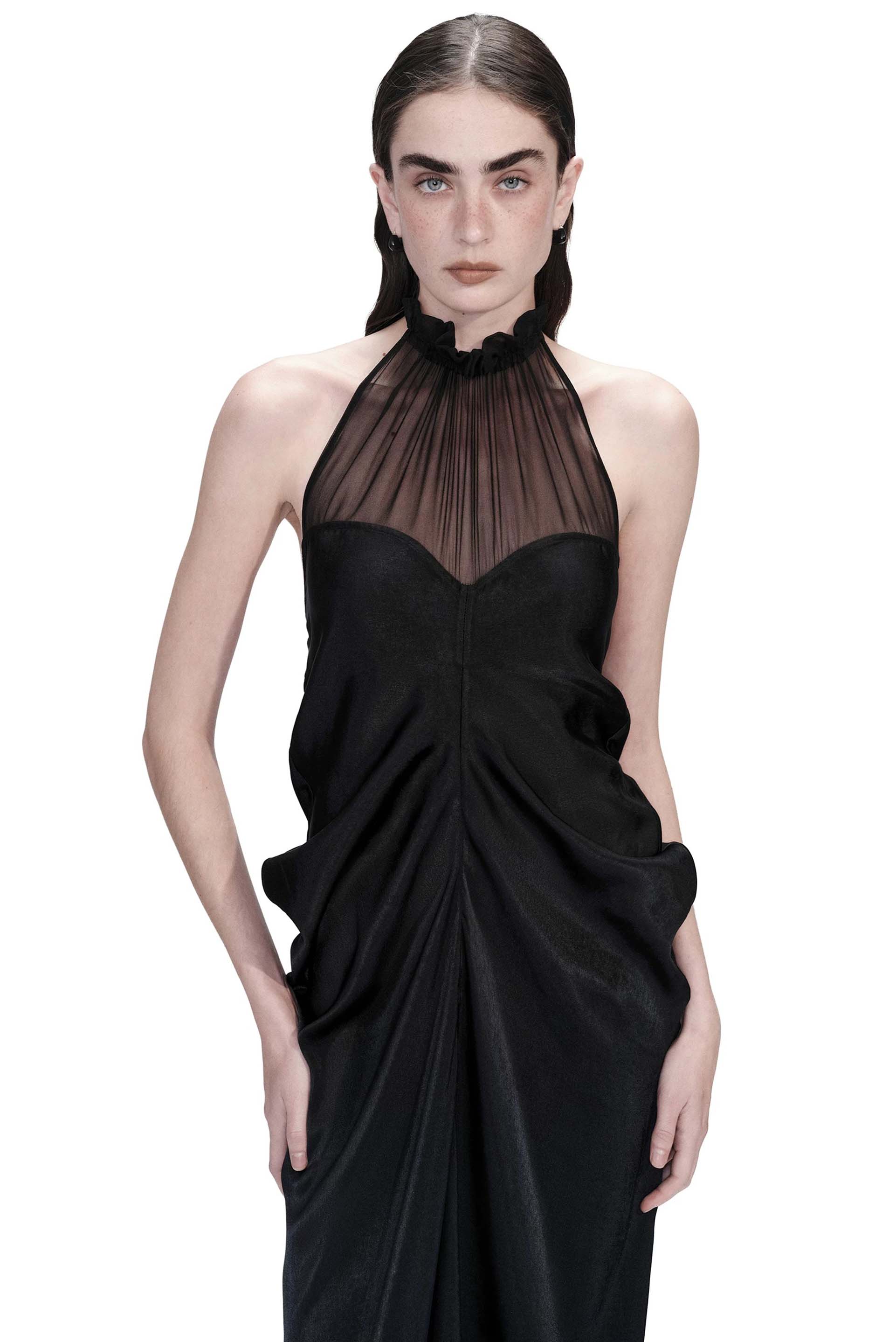 OUDE WAAG strikes a balance between Asian aesthetics and Western cutting. It is at the heart of designer’s philosophy: celebrating the power of women, yet simultaneously critiquing the ongoing objectification and idealisation of the body as you can see in the Oude Waag SS26 Mirror Mirror collection with the Paneled Silk Draped Dress Black.