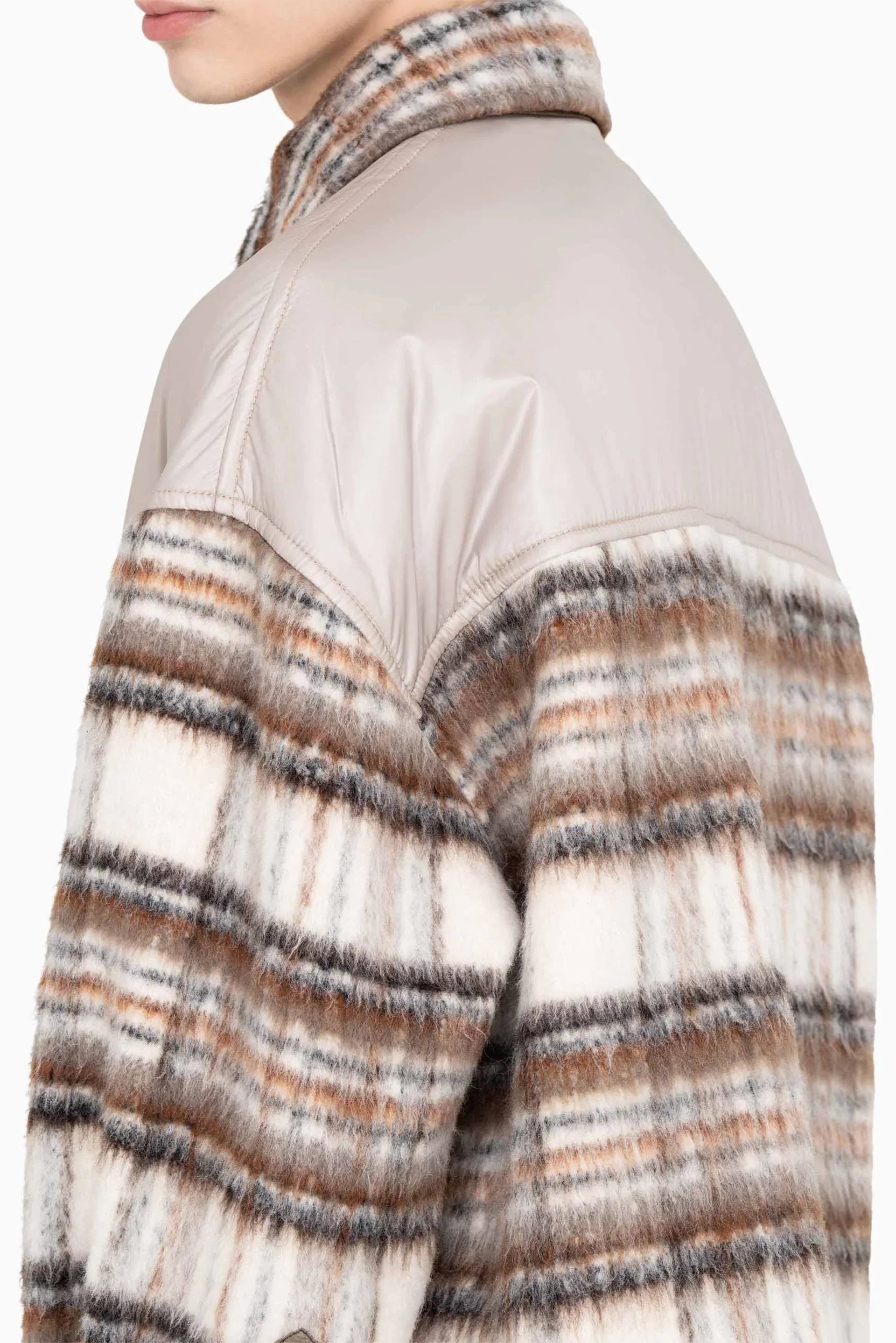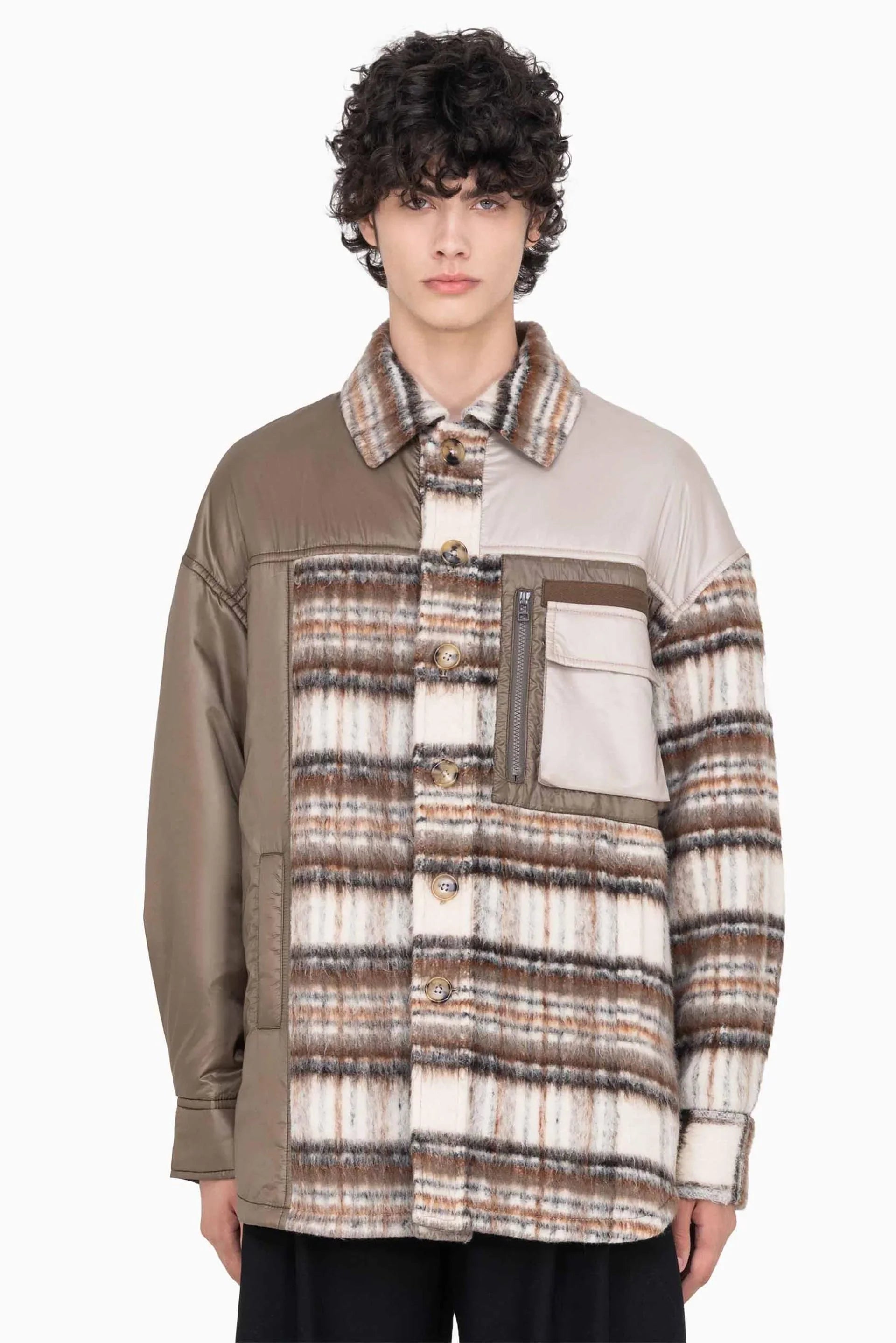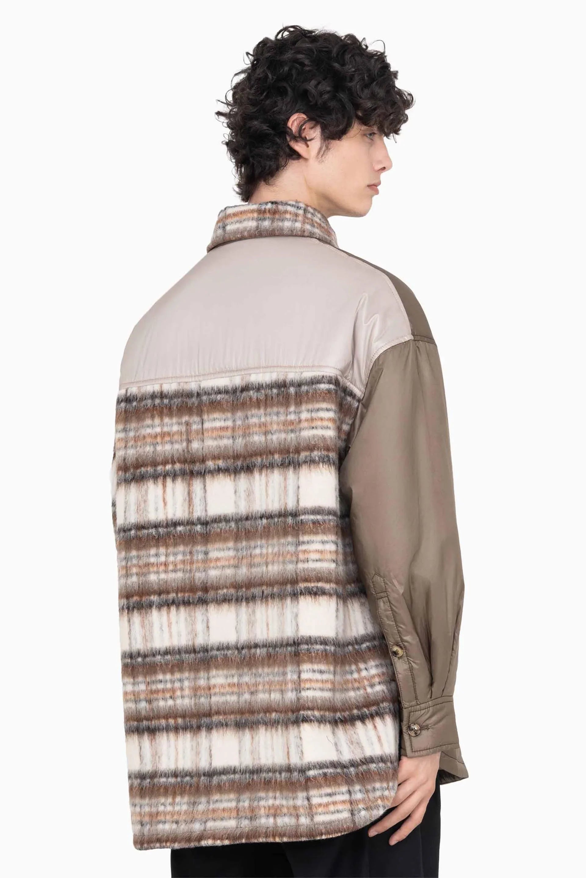 Plaid shirt jacket is made of wool with khaki contrasting layer panels. The shirt features a panel pocket. Buttoned front closure. Khaki contrasting sleeve. Oversized and relaxed fit.