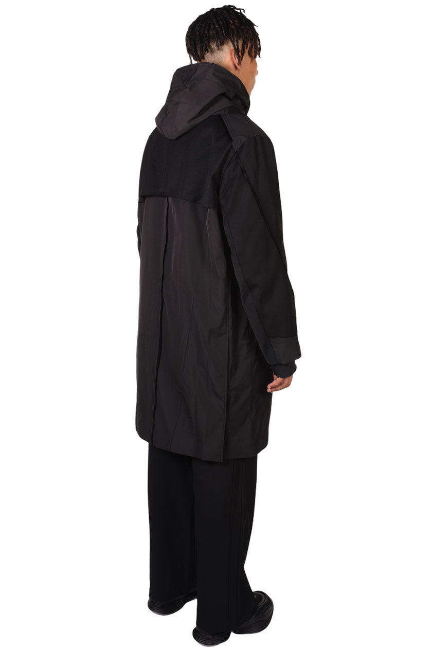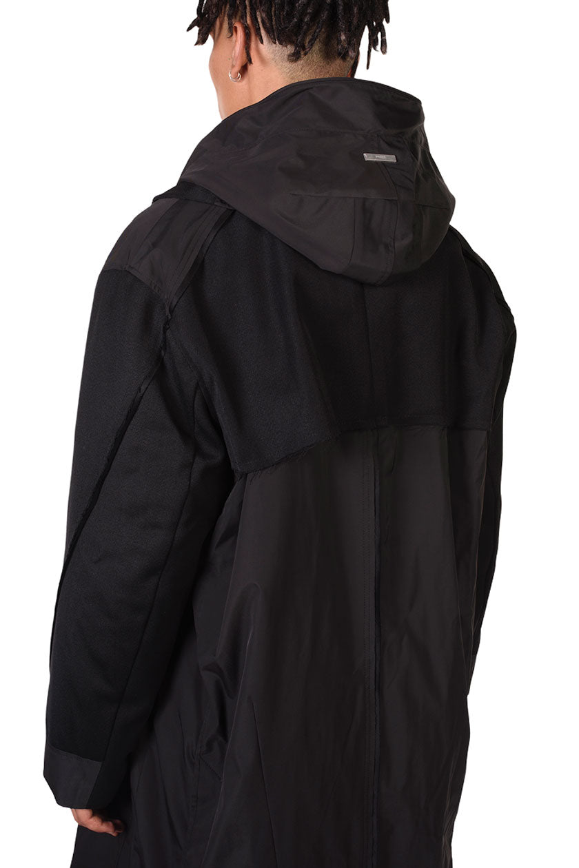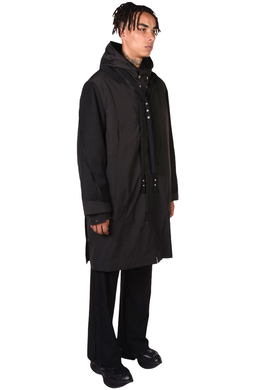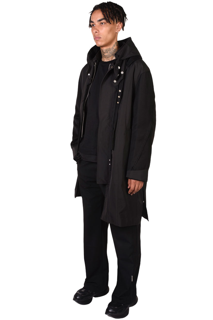 Long sleeve panelled technical canvas coat in black. Detachable hood. Magnetic buttons.