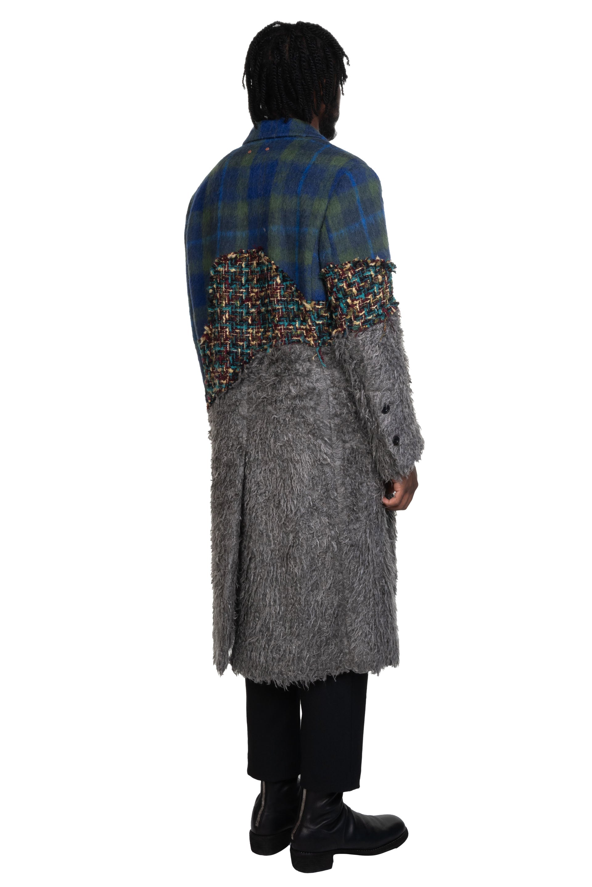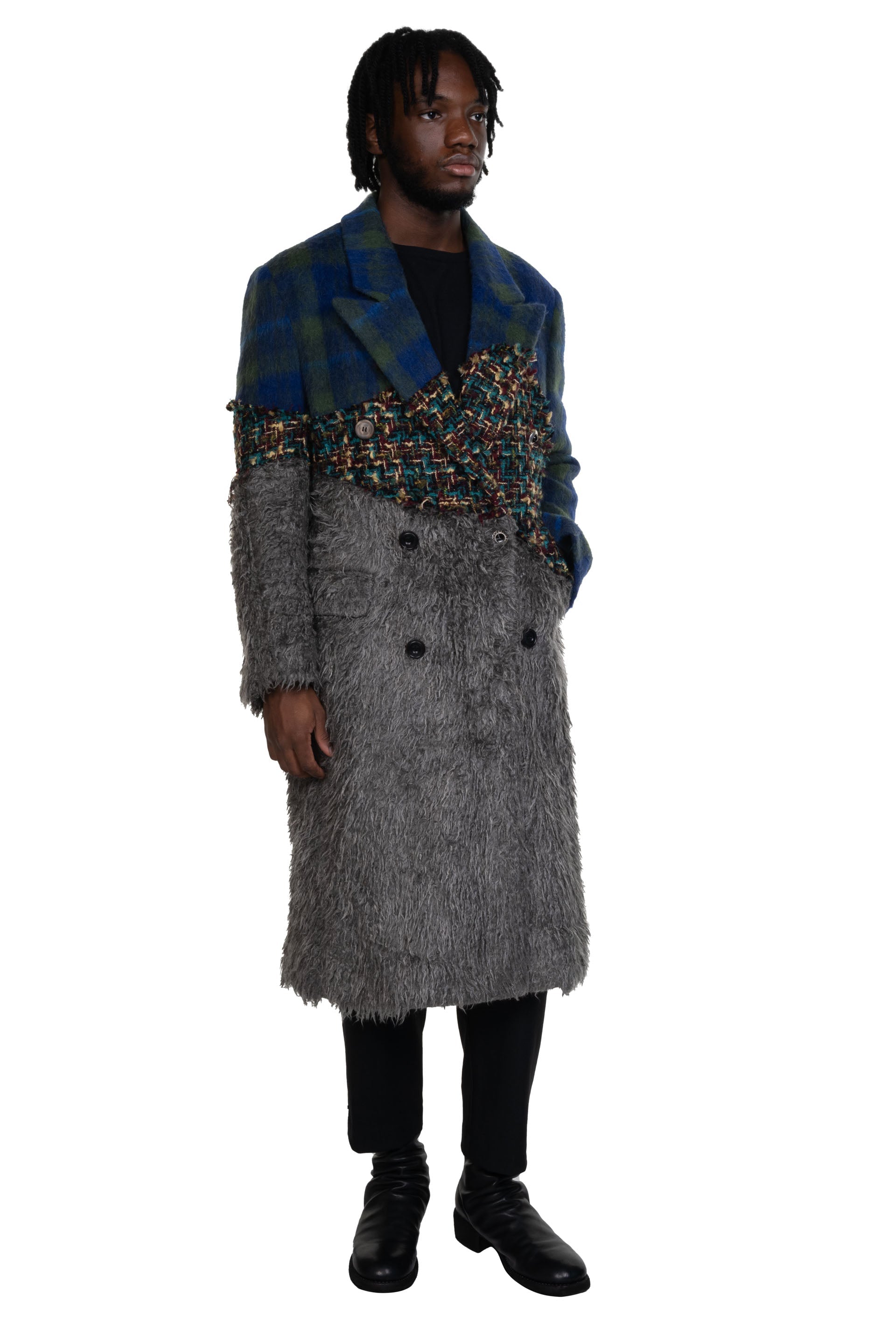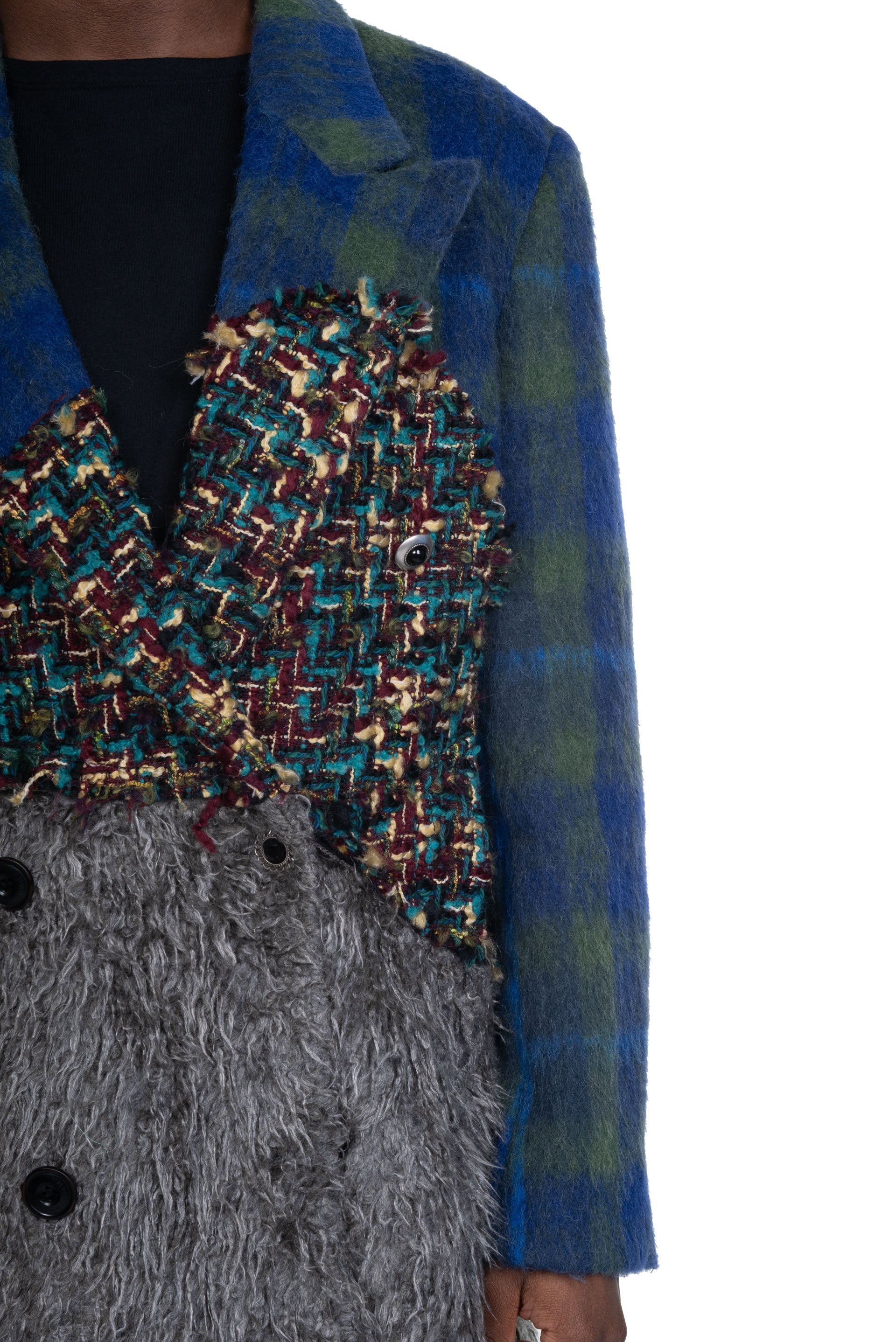 Long sleeves. Double Breasted. Button closure at front. Two side pockets. Inside pocket. Button at cuffs. Multi fabric patchwork throughout. Slightly padded shoulders. Signature details throughout. Regular fit. Lightweight.