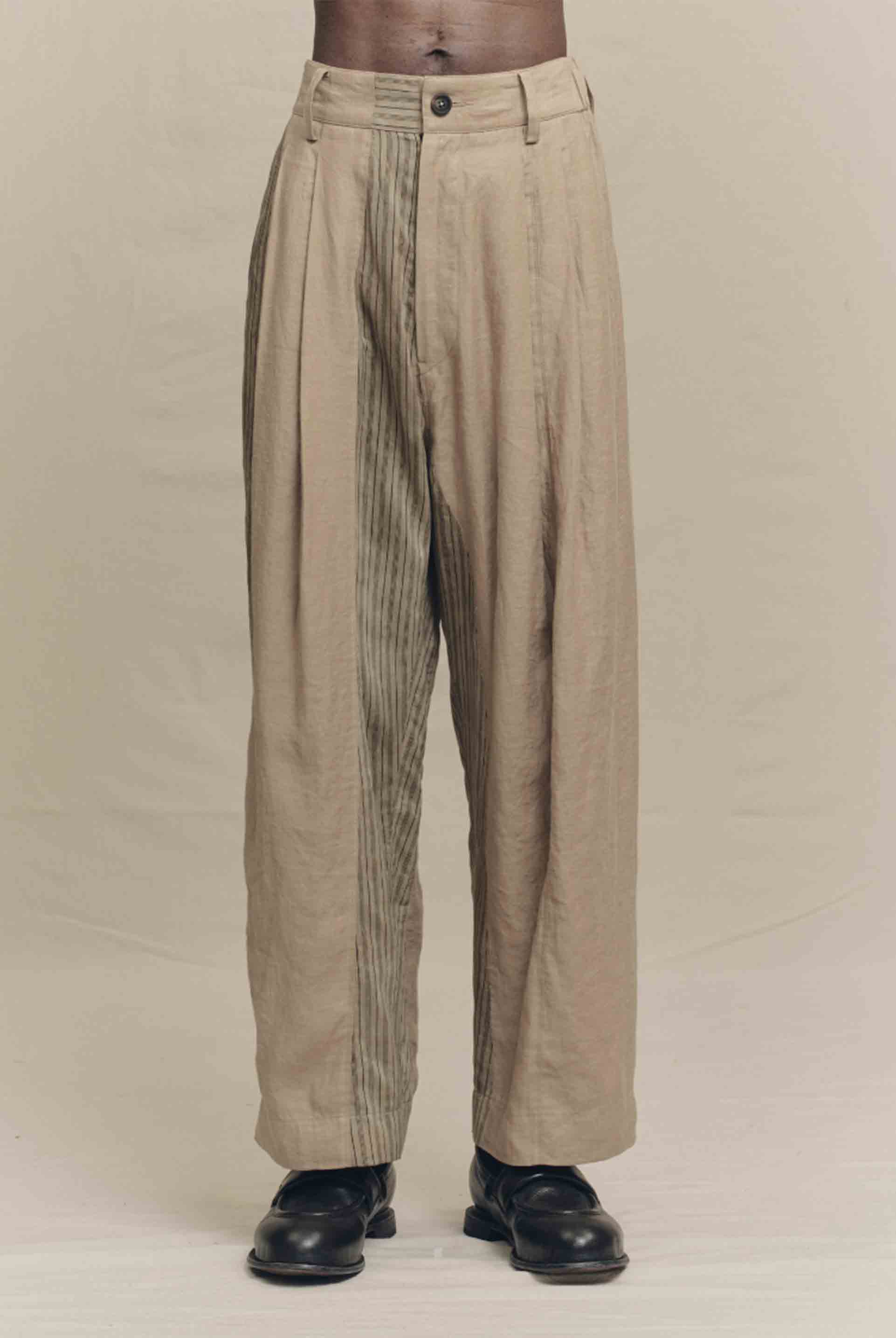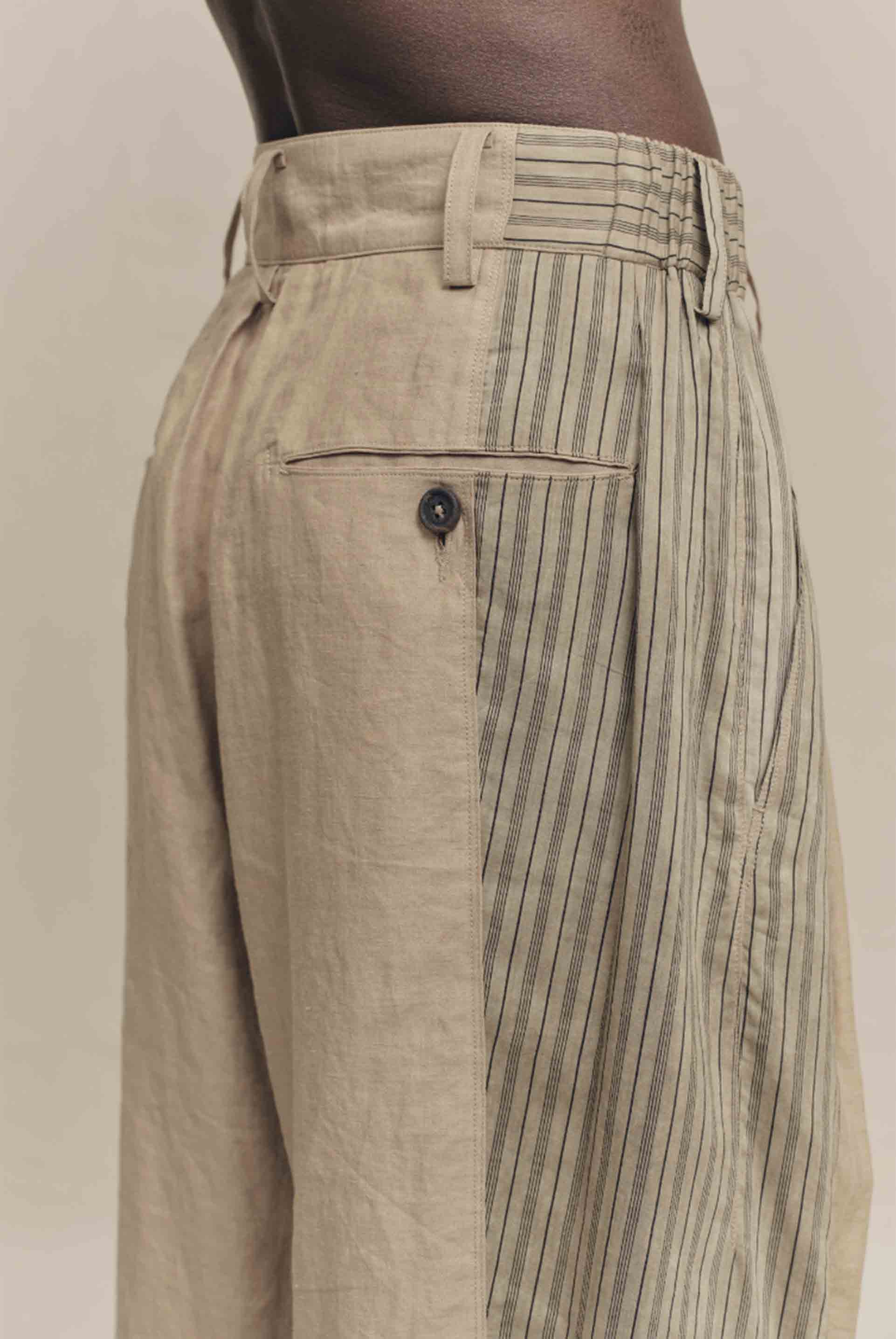 Ziggy Chen patchwork linen trousers in Burlywood. Two side pockets. Two back pockets. Button closure at front. Oversize fit. Pleated at front. Seasonal patchwork throughout with signature lining. Brown burlywood colour in a soft textural linen fabric.