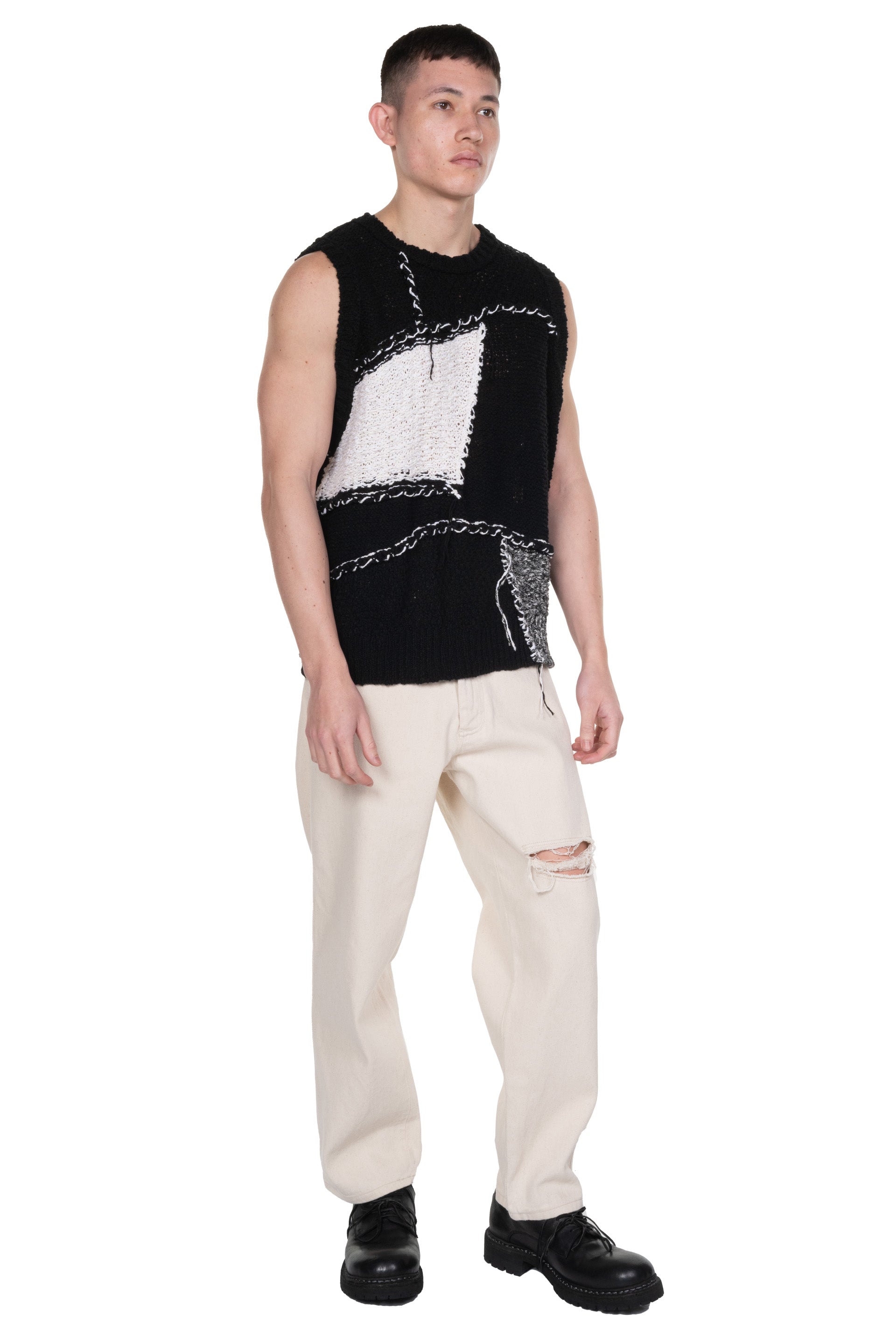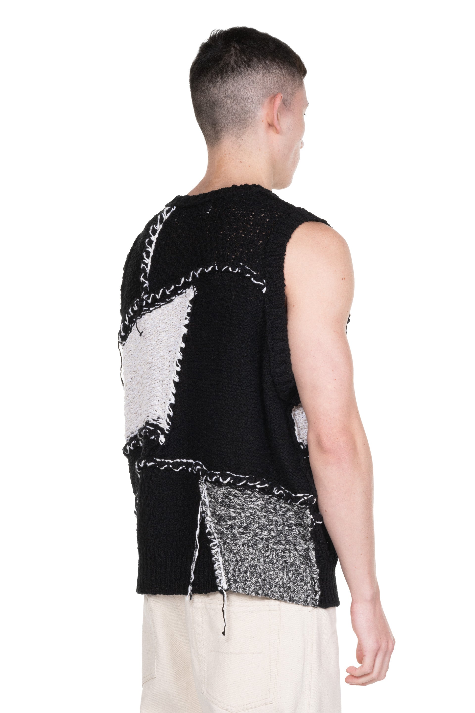 Sleeveless. Round neck. Boxy fit. Thick knit. Patchwork. Signature thread detailing throughout.