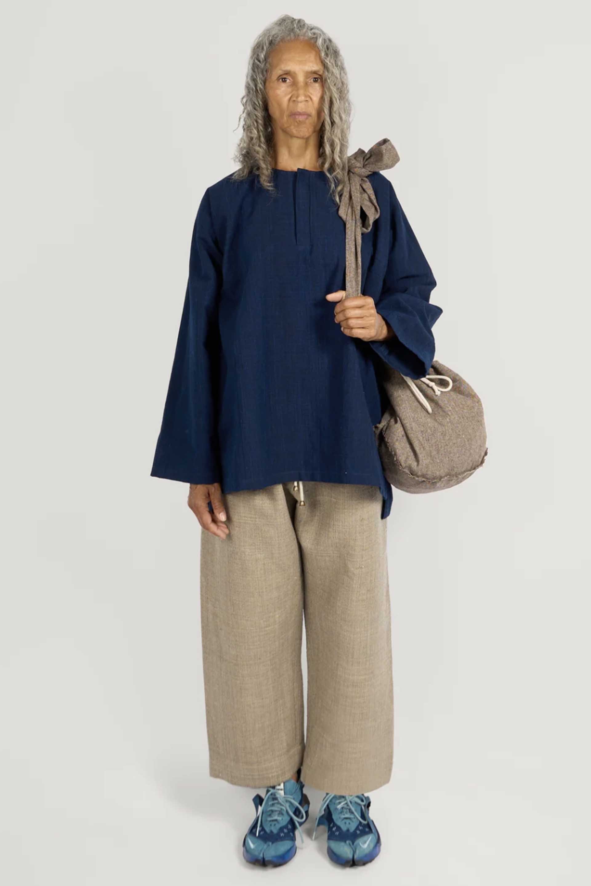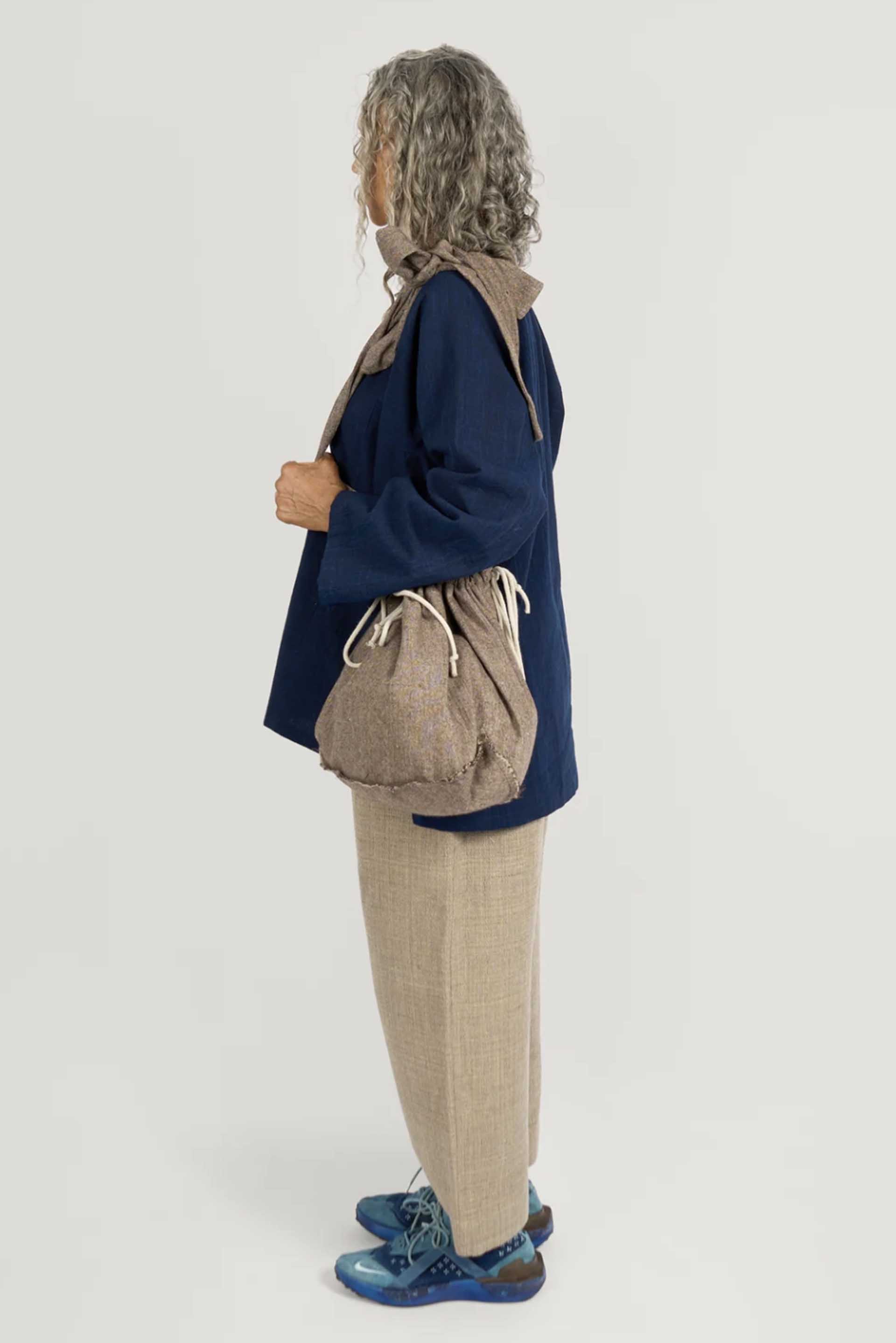 Gathering is dedicated to preserving the art of handmade textiles and tradition. Textiles are sourced across Asia and Africa, woven on traditional looms and antique machinery, grown naturally without pesticides or human intervention, and dyed using elements from the earth, ensuring they are free from any chemicals. Each piece is hand-made featuring meticulous details and natural buttons made from materials like shell and ceramic, making each item unique and rich in character. Gathering is a fresh, timeless and versatile silhouette perfect for layering as seen with the Pear Drop Bag Antique Herringbone Wool.