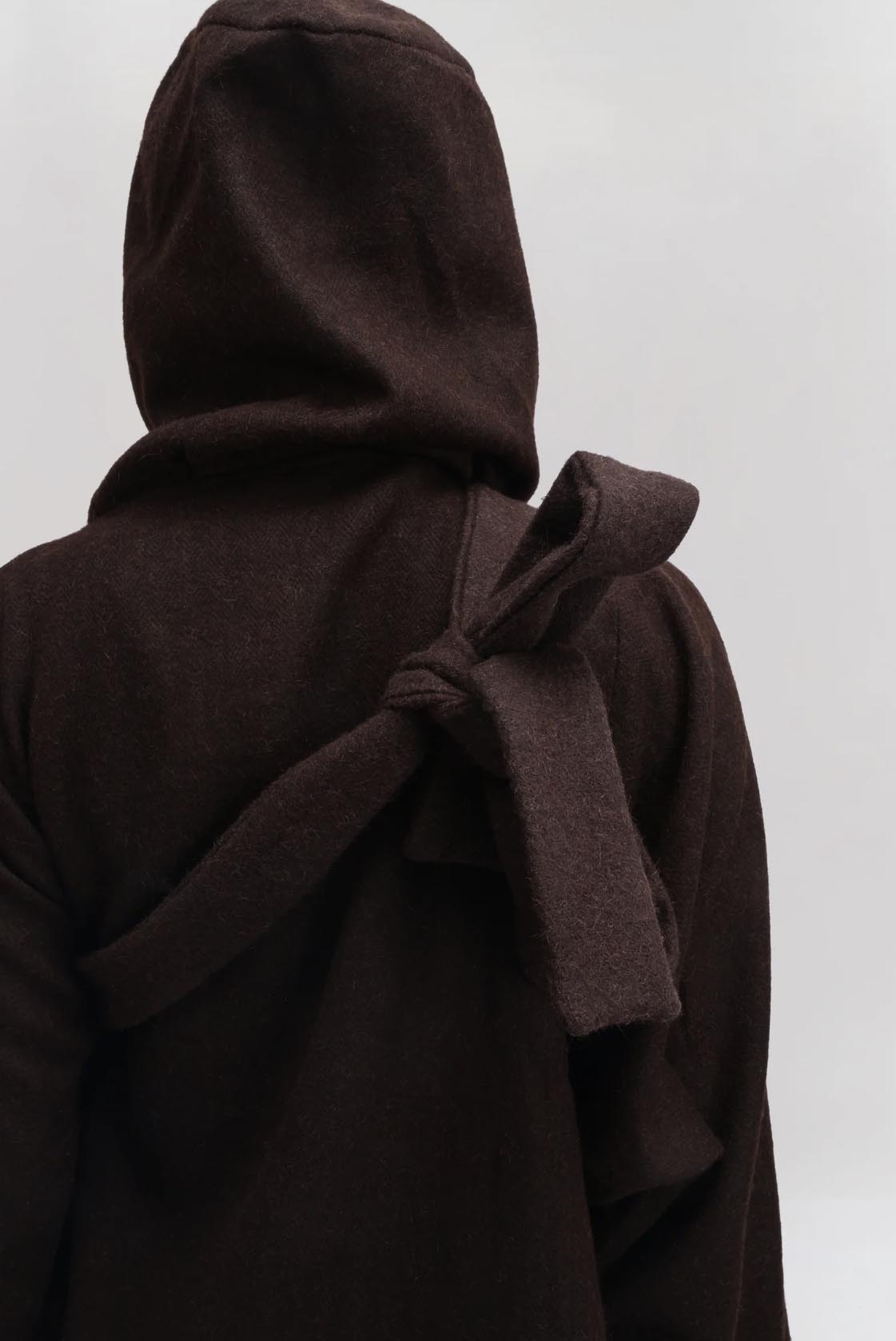 This garment is constructed in a way to compliment all body shapes. The handwoven and hand-felted yak and sheep wool in a warm brown tone. Fully lined with soft cotton for a comfortable finish.