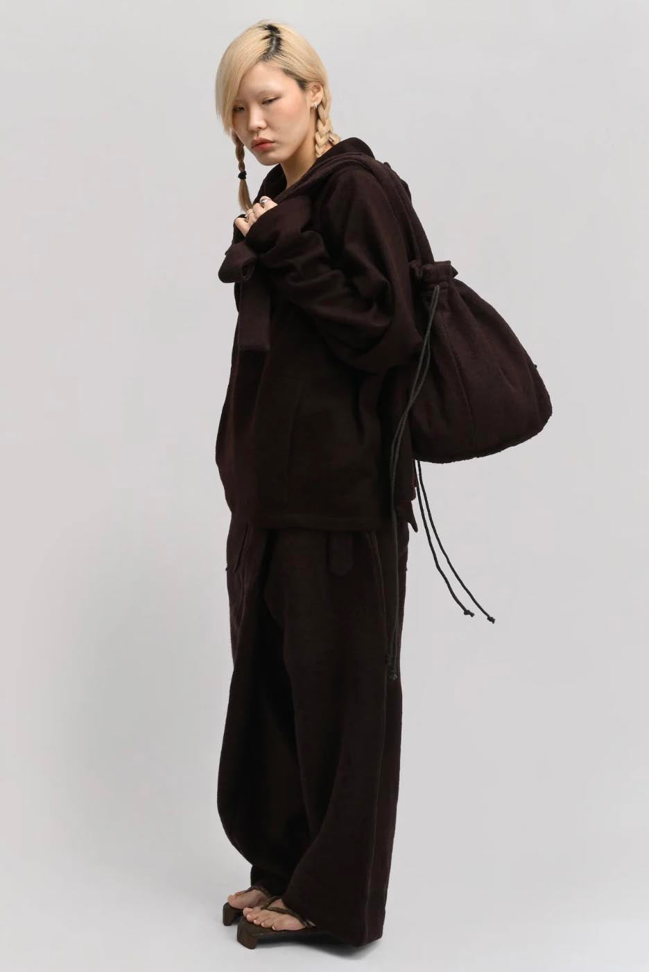 The Peardrop Bag is a unique, pear-shaped sack bag that blends artisanal craftsmanship with practical design. Its adjustable strap allows for versatile wear, while the structured yet supple silhouette makes it ideal for everyday use. The natural texture of the wool adds an earthy, sophisticated touch, perfect for carrying essentials in style.