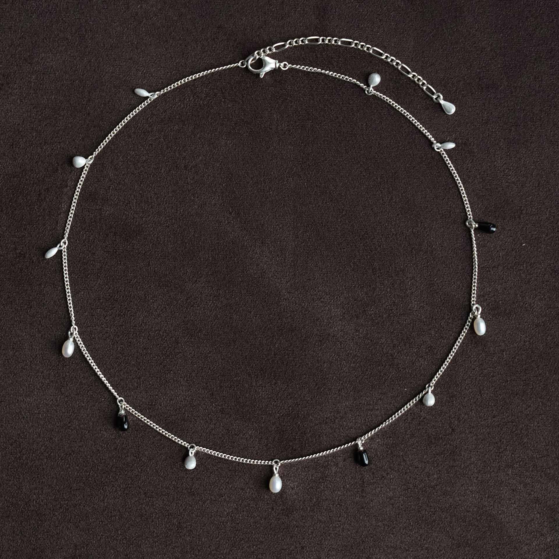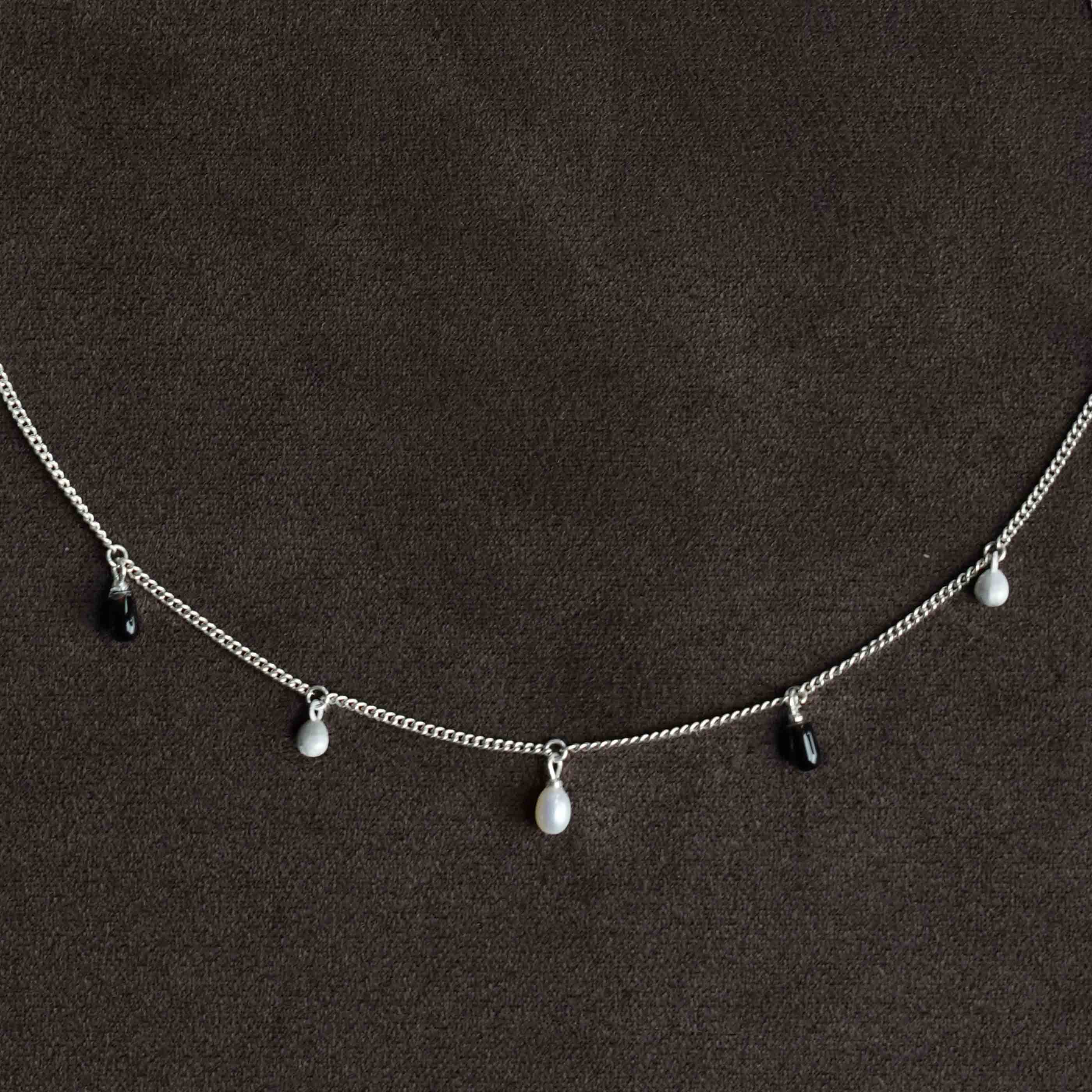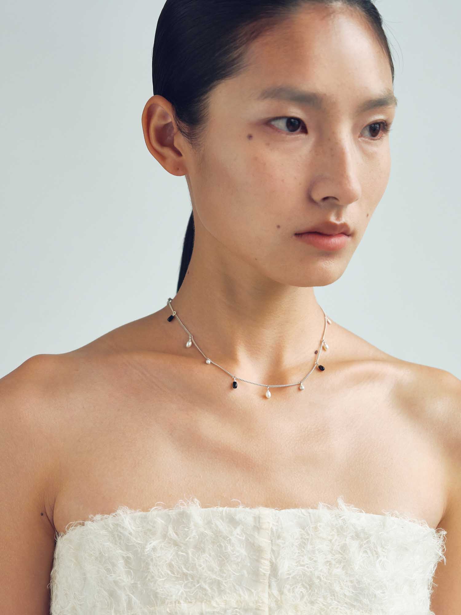 OLIO E ACETO is raw and authentic. It is about the companionship between people, and objects like the matte white surface becoming a blank canvas to be filled by the wearer as seen with the Pearl Black Agate Wind Chime Necklace.