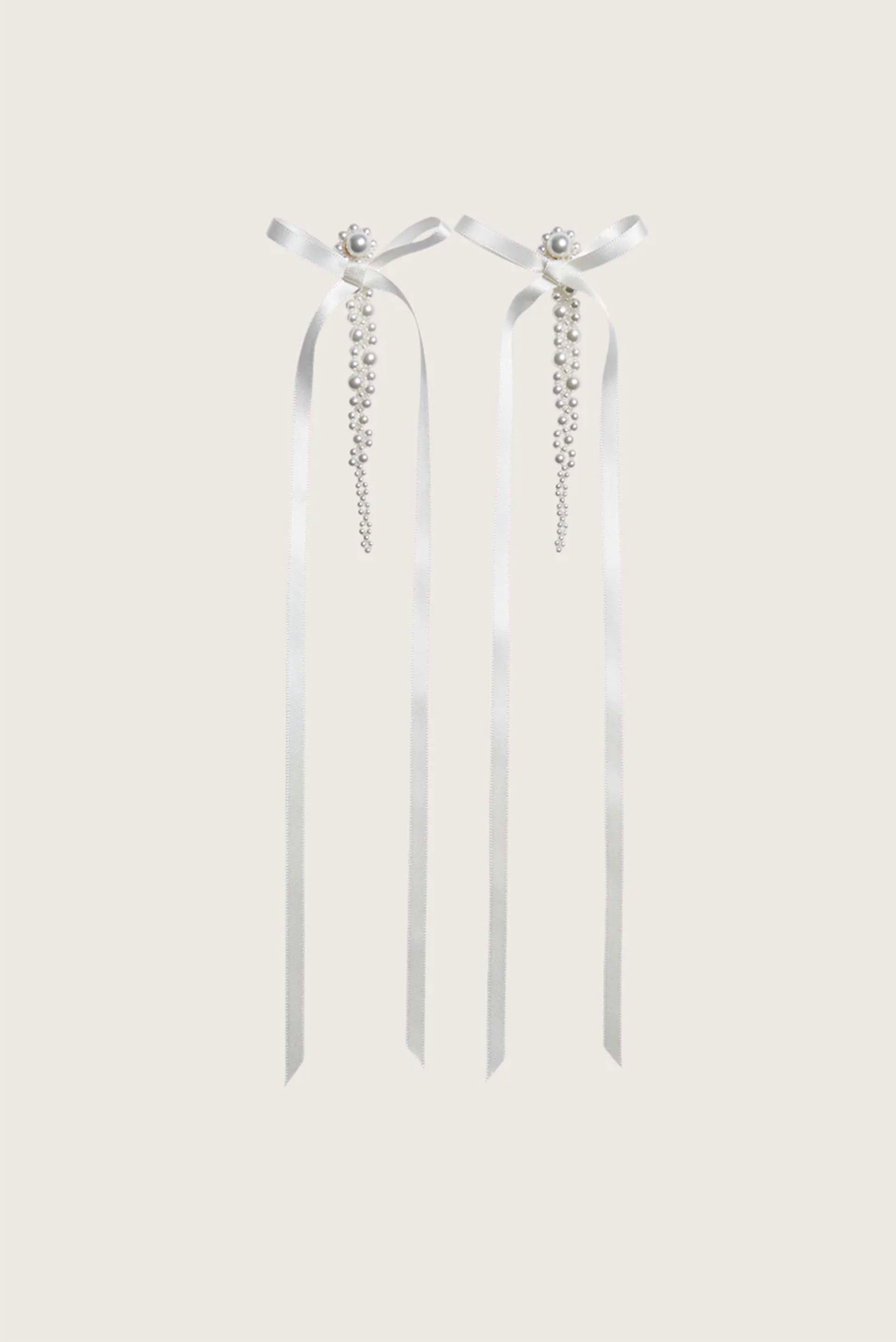 Simone Rocha Petite Bow Detail Drip Earrings. A signature Simone Rocha earring, a cascade of pearls with a satin ribbon bow. It features a post-stud fastening. Faux pearl drop earrings. Ribbon bow detail. Beaded daisy at base. Signature pearl beading