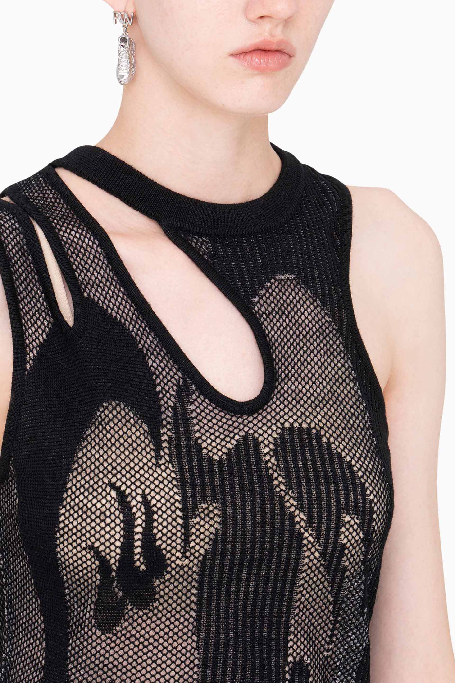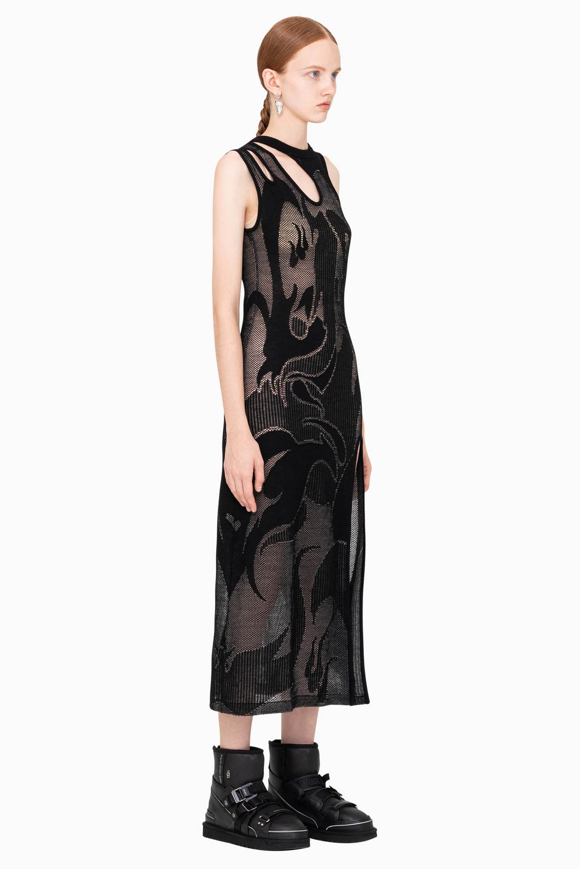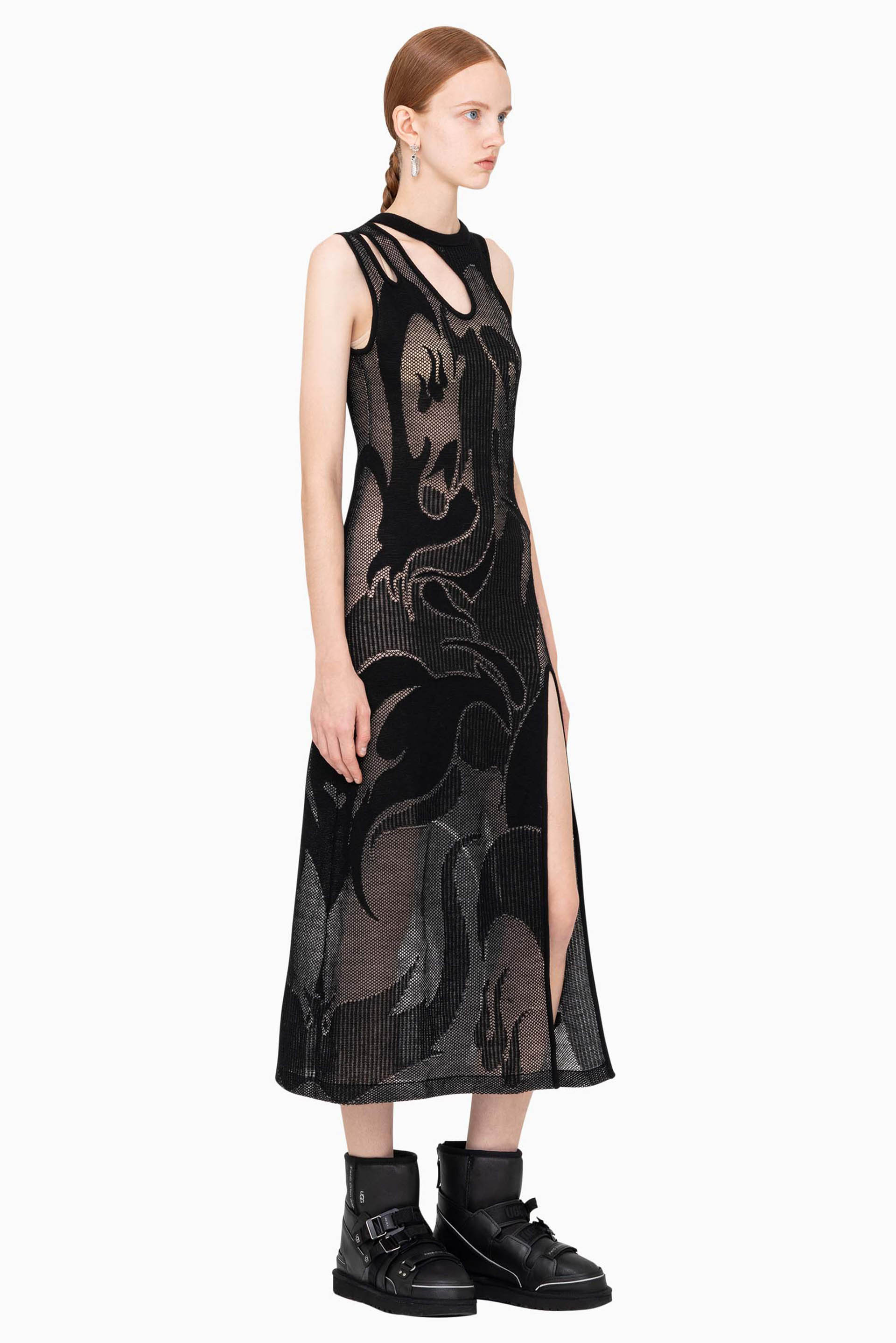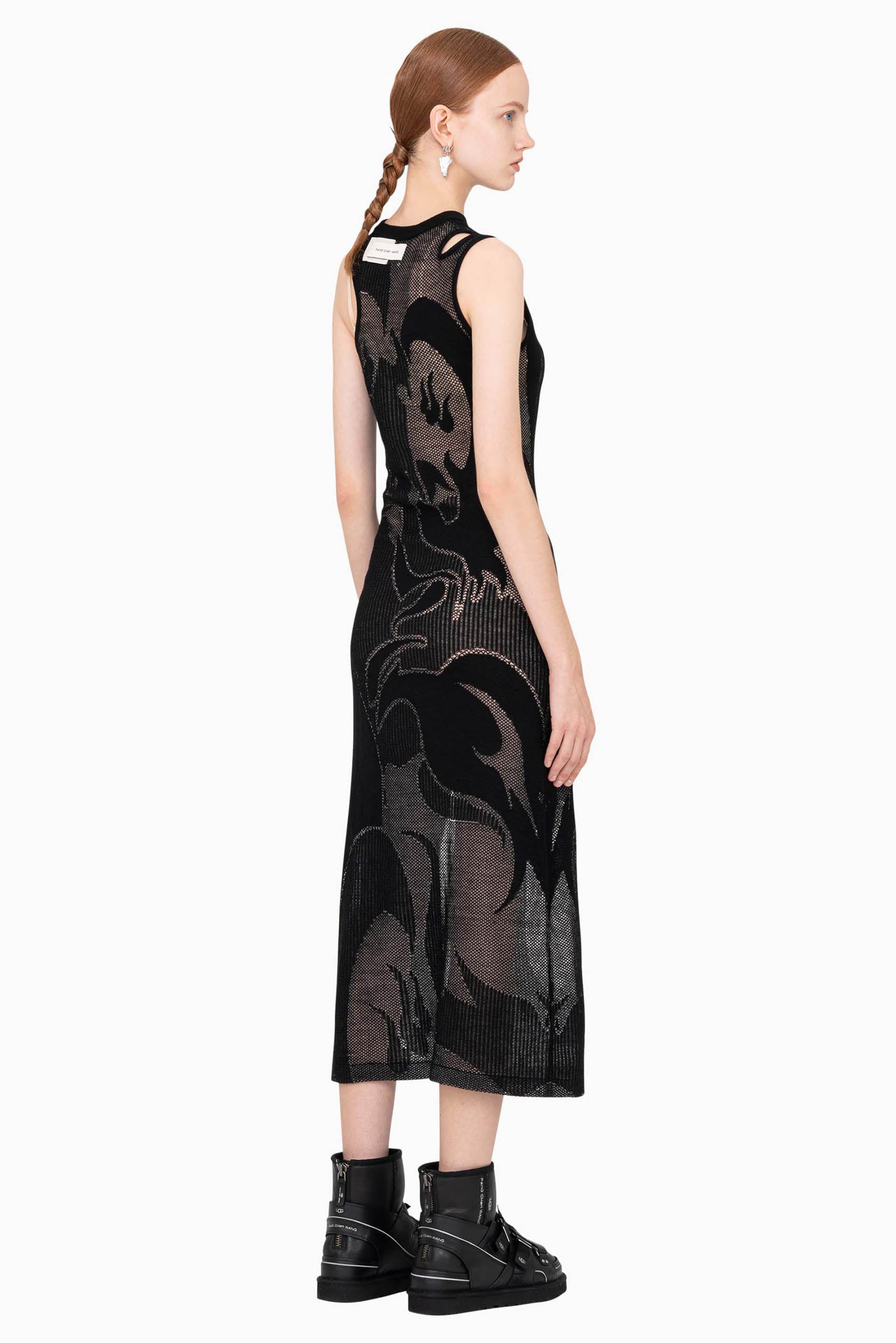 Jacquard knitted midi dress. Slightly sheer. Featuring the signature Phoenix pattern. Cut-out details at neckline and strap. Slit at the midi of the hem.