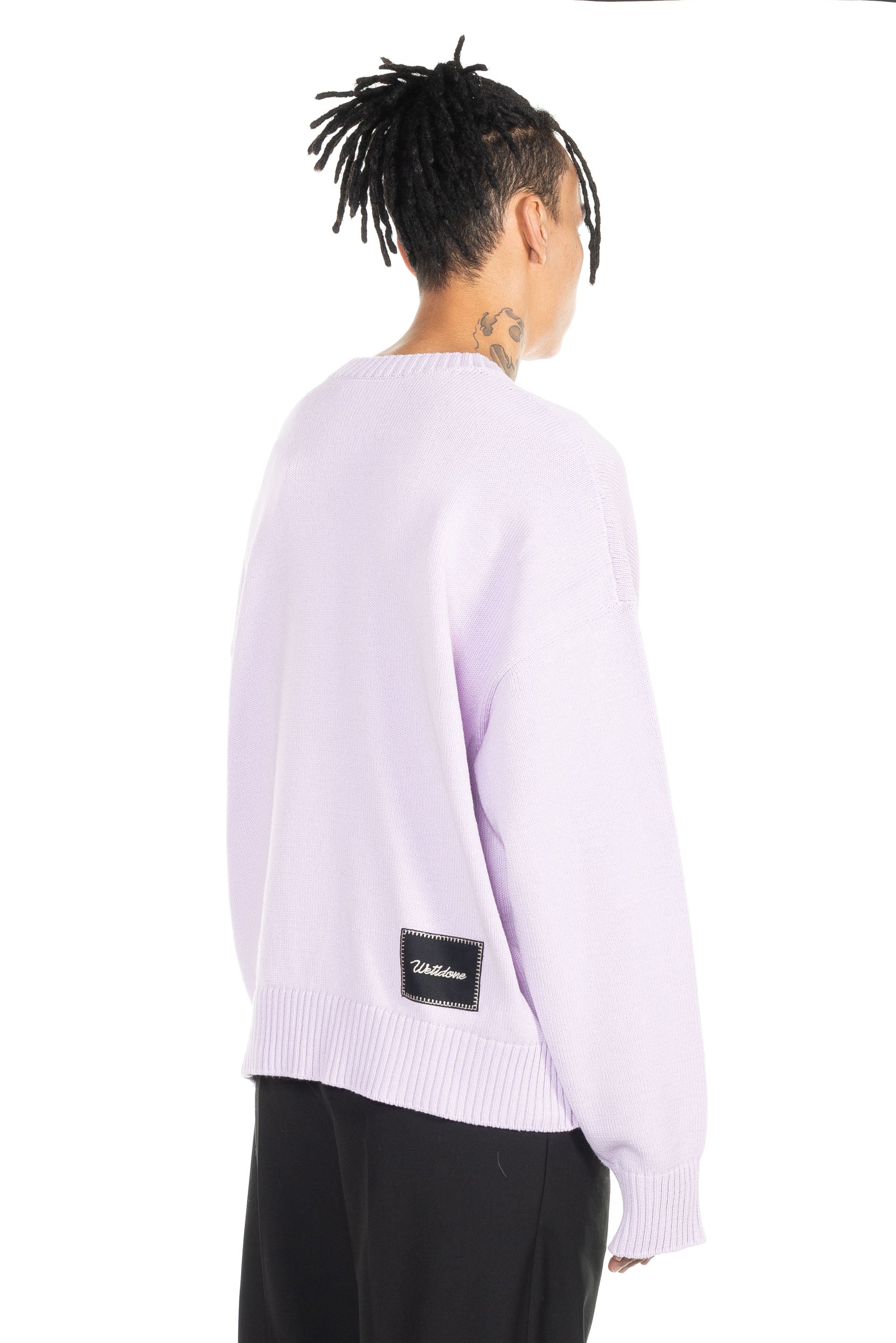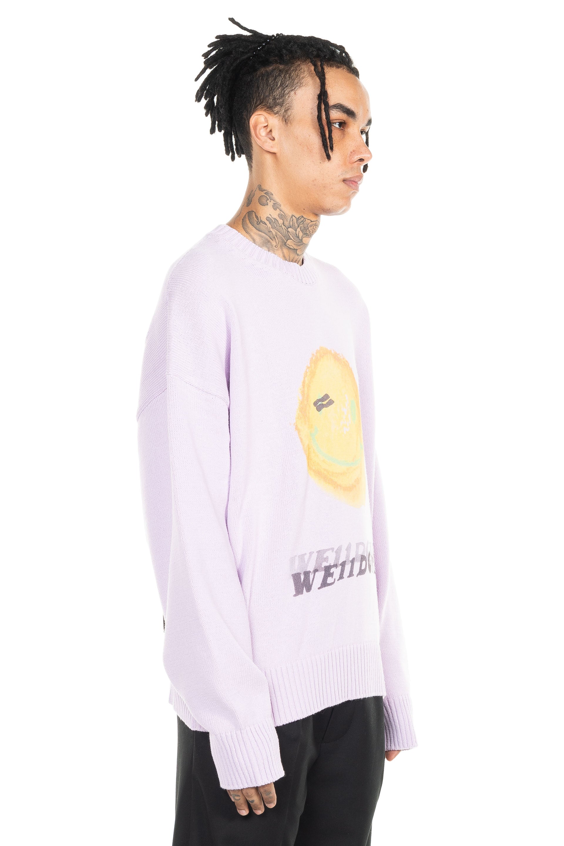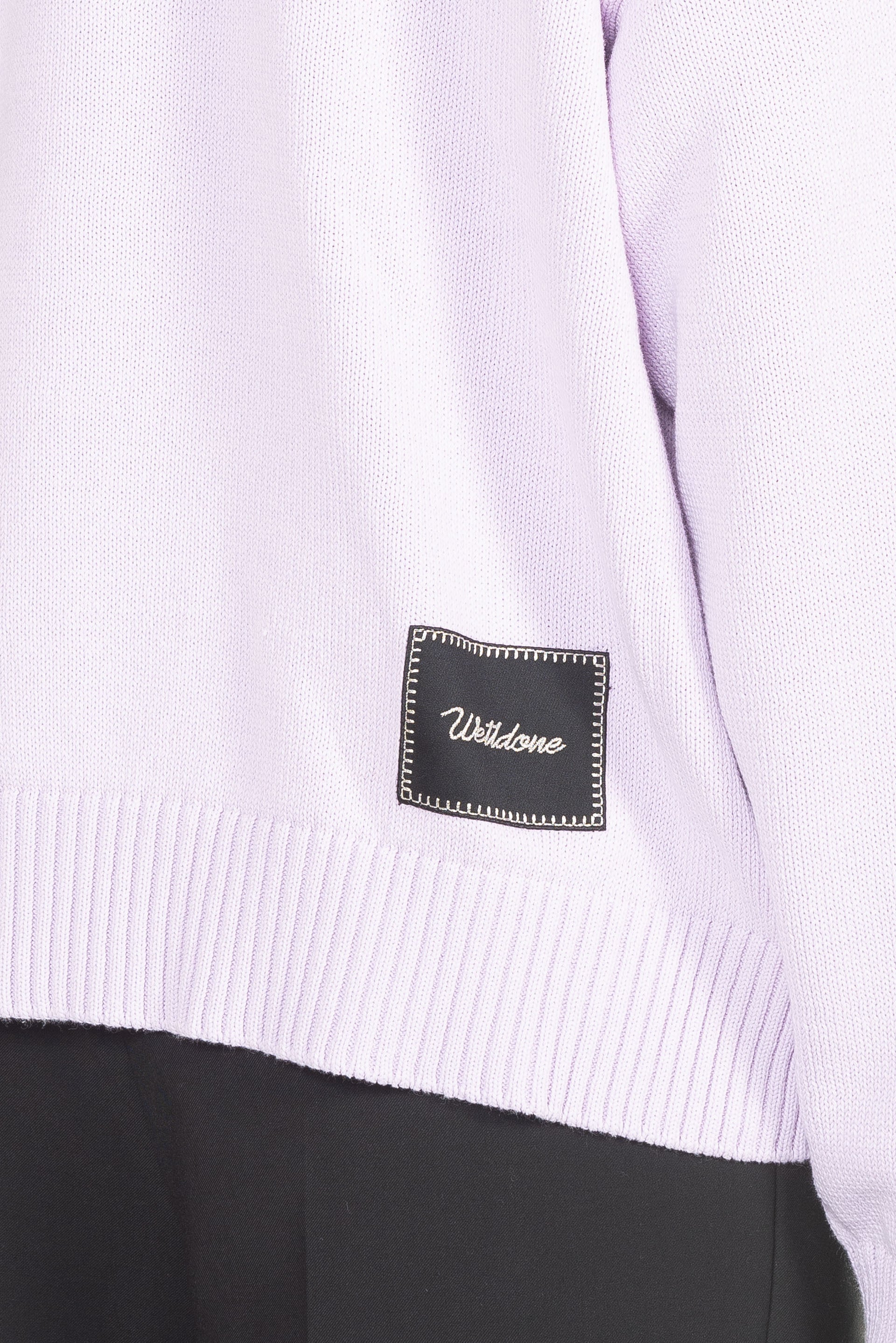 We11done merges late 1990s and early 2000s aesthetics creating a feeling of futurity. Functional, sportive, and sleek, We11done’s versatile designs refine classic elements into contemporary lifestyle pieces as seen with the Purple Knit Smiley Sweater.