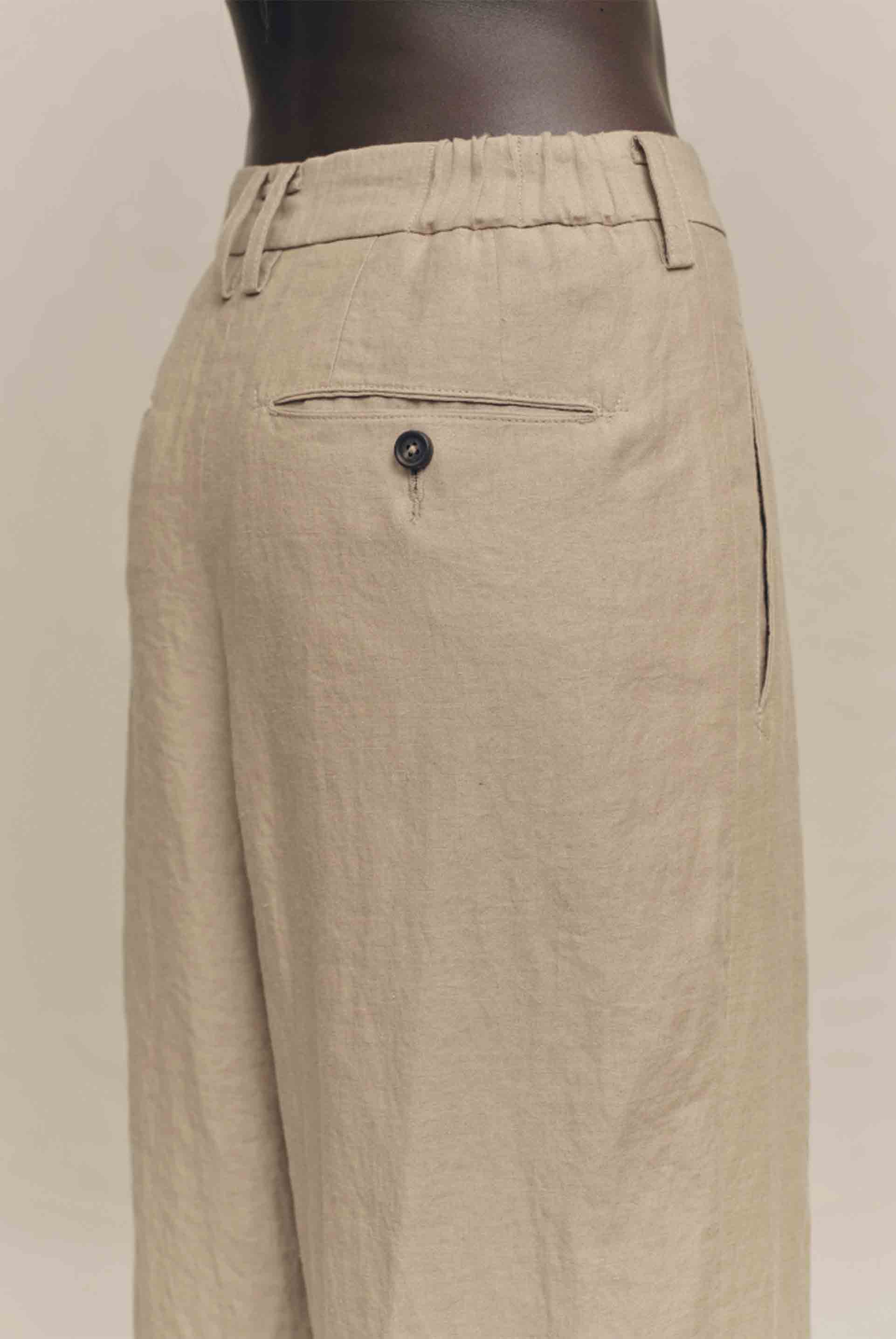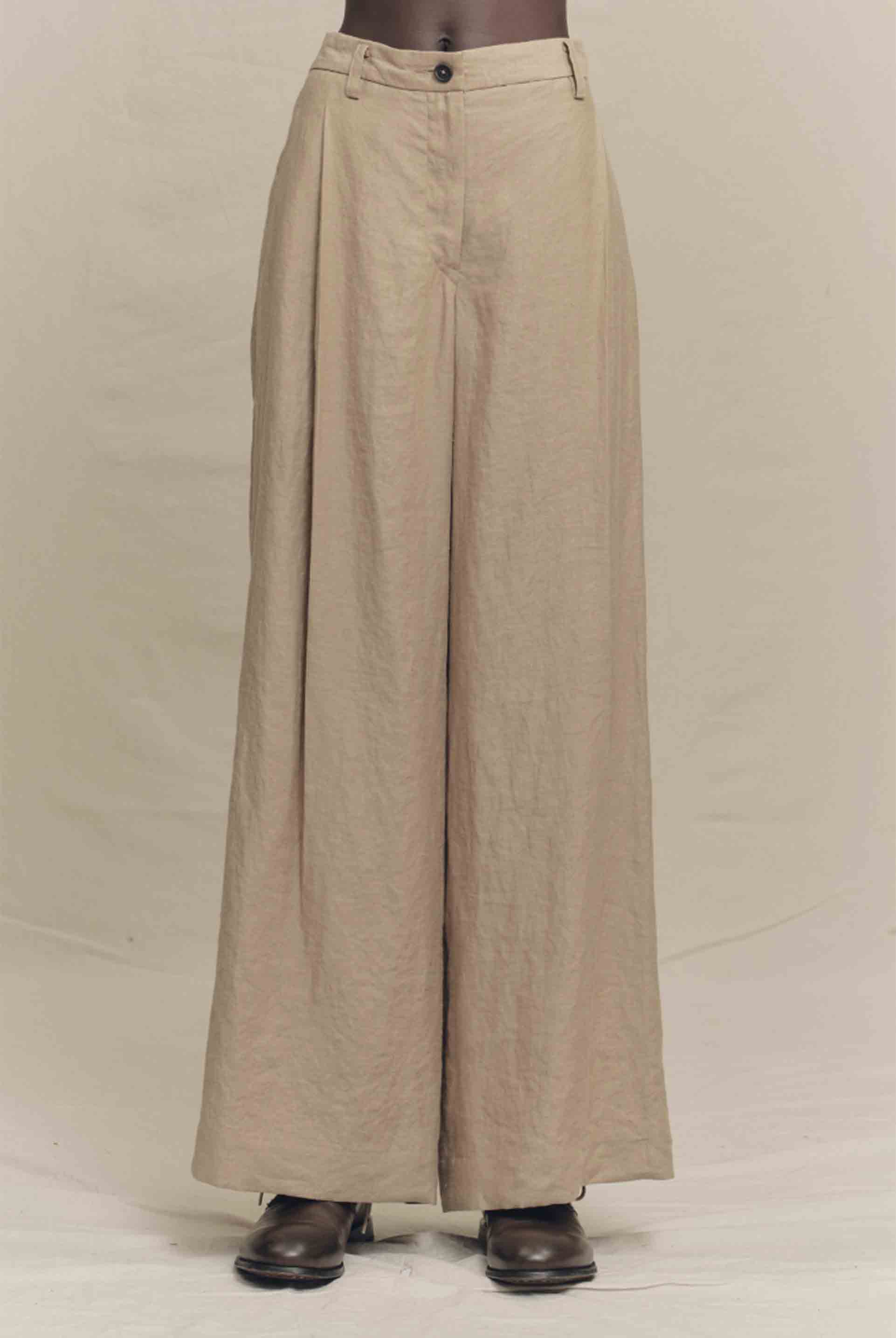 Ziggy Chen linen wide leg trousers. Two side pockets. Two back pockets. Button closure at front. Wide leg. Pleats at front. Brown Burlywood colour in a soft textural linen fabric.