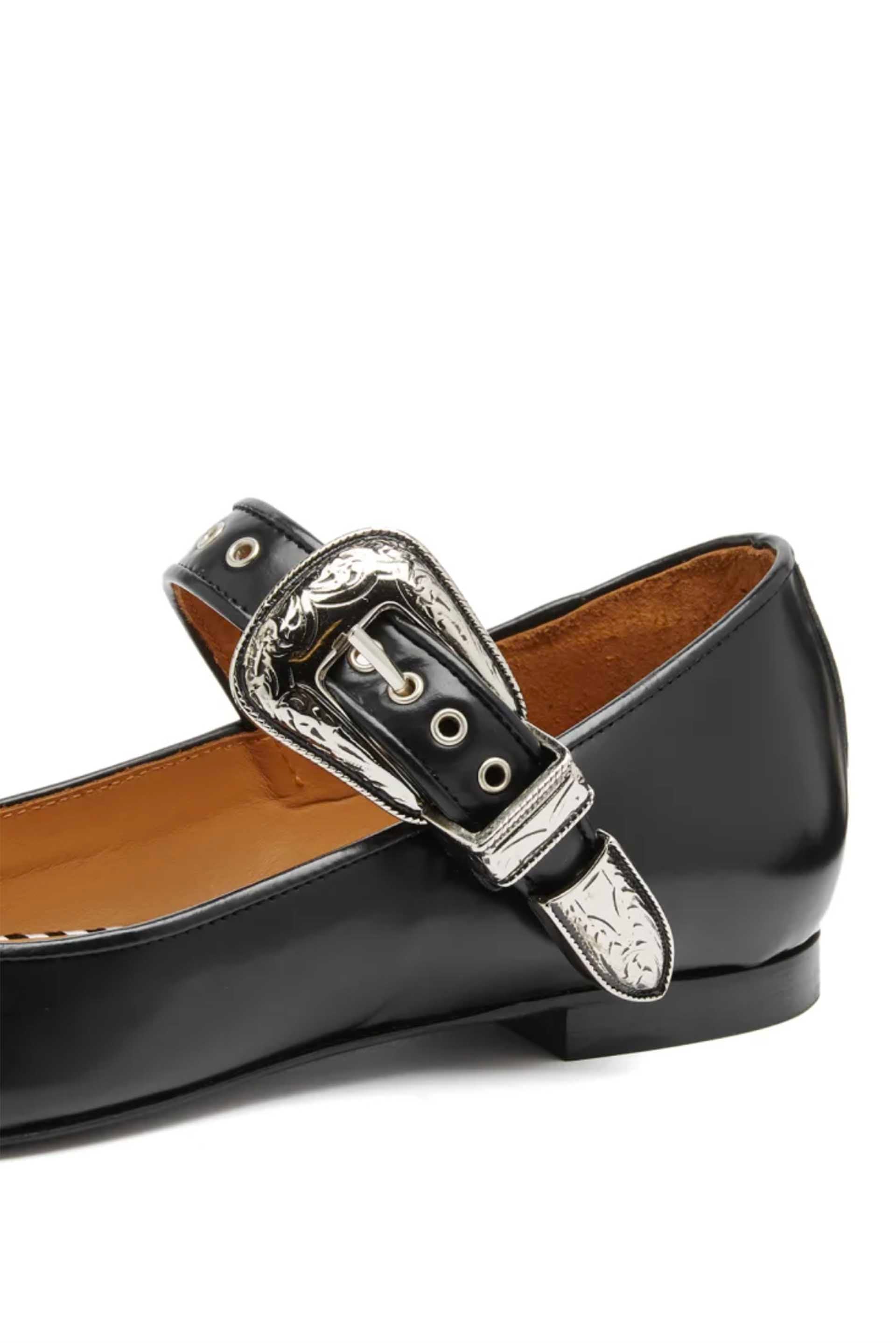 Toga Pulla Black Mary Jane Buckle Ballerina Flats. Polished leather Mary Jane-style ballerina flats in black. Square toe. Adjustable signature buckle strap at top. Eyelets and graphic hardware. Padded leather foot bed. Grained leather and suede lining. Stacked leather heel with rubber injection. Polished leather sole.