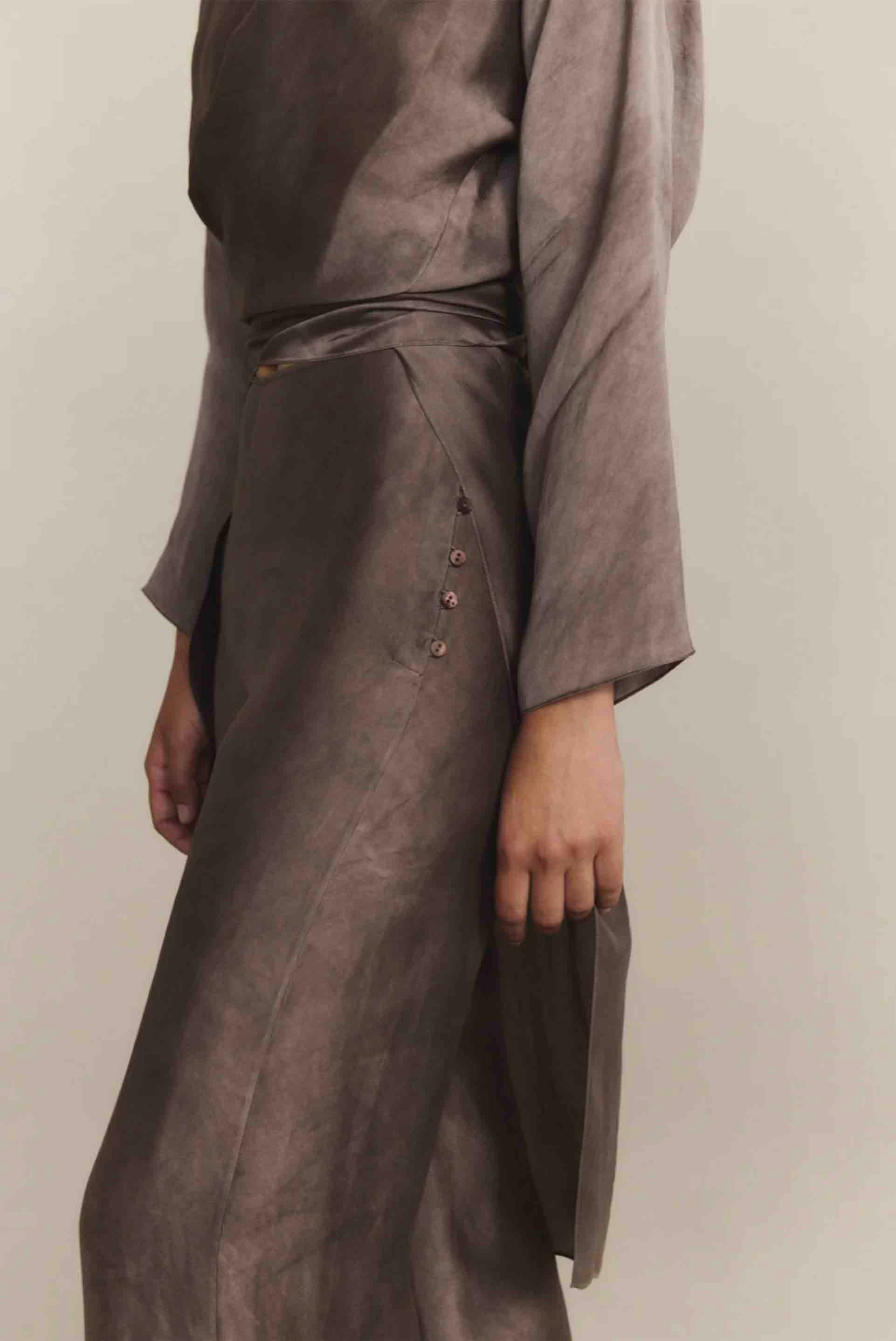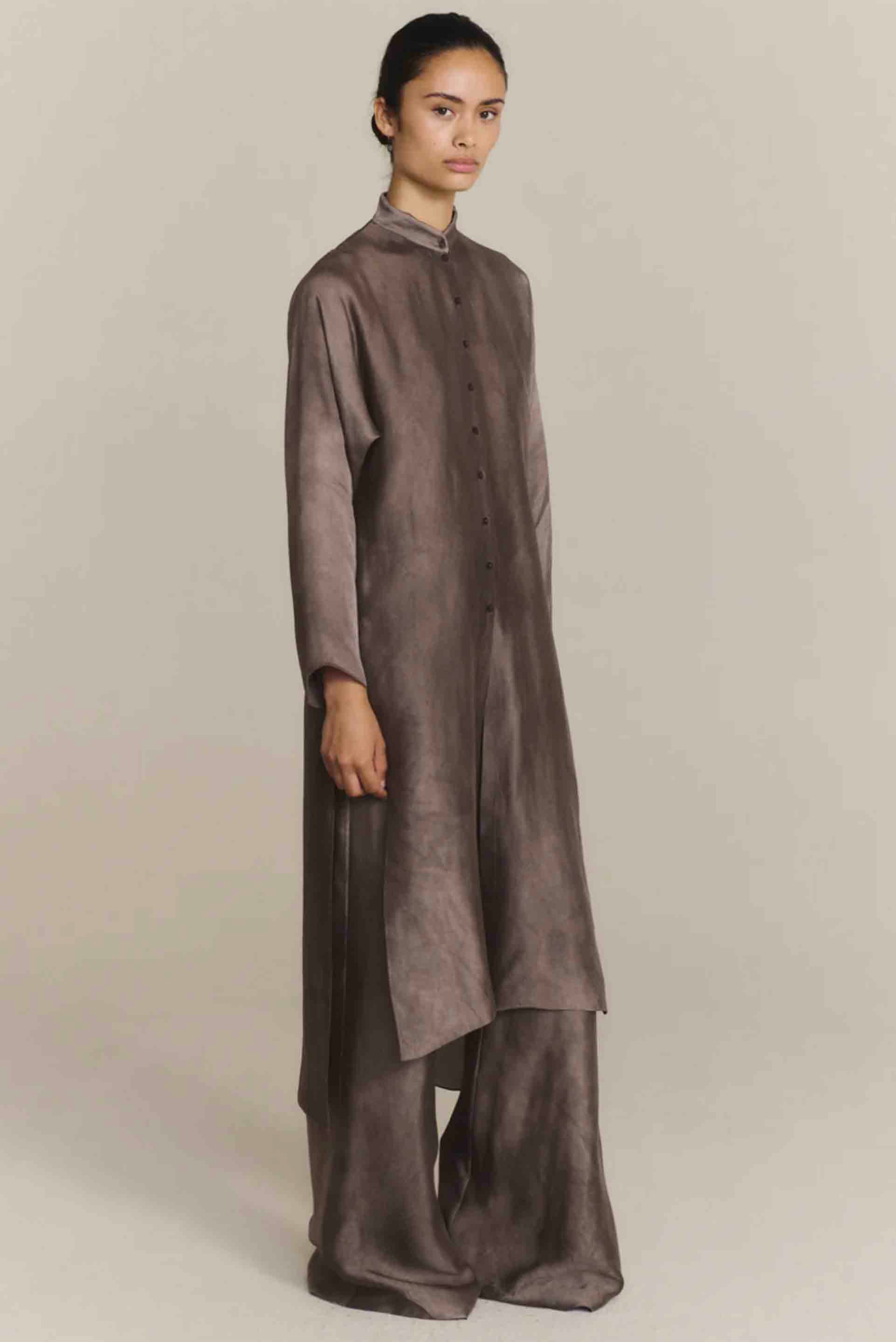 Palazzo trousers crafted from an organza-effect fabric blending viscose and linen, finished with a sophisticated maltinto effect. Detailed with a side closure featuring delicate mother-of-pearl buttons, the Poline trousers combine elegance with lightness.
