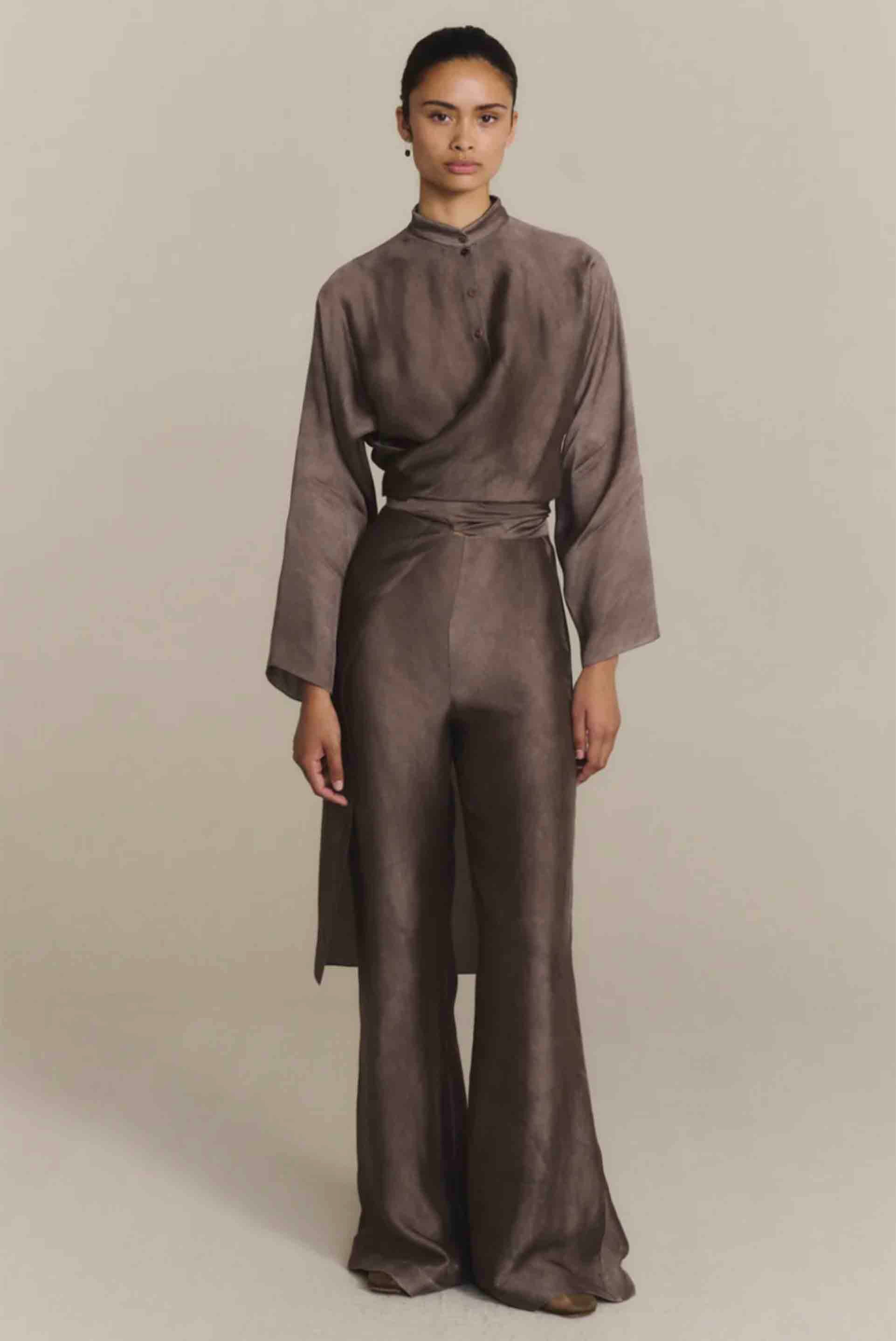 Cortana clothing is characterised by fluid cuts, drapes, and transparency. Cortana’s flowing and feminine silhouettes are bathed in Mediterranean sunshine with natural tones and signature prints as seen with Poline Pants Fade Mauve.