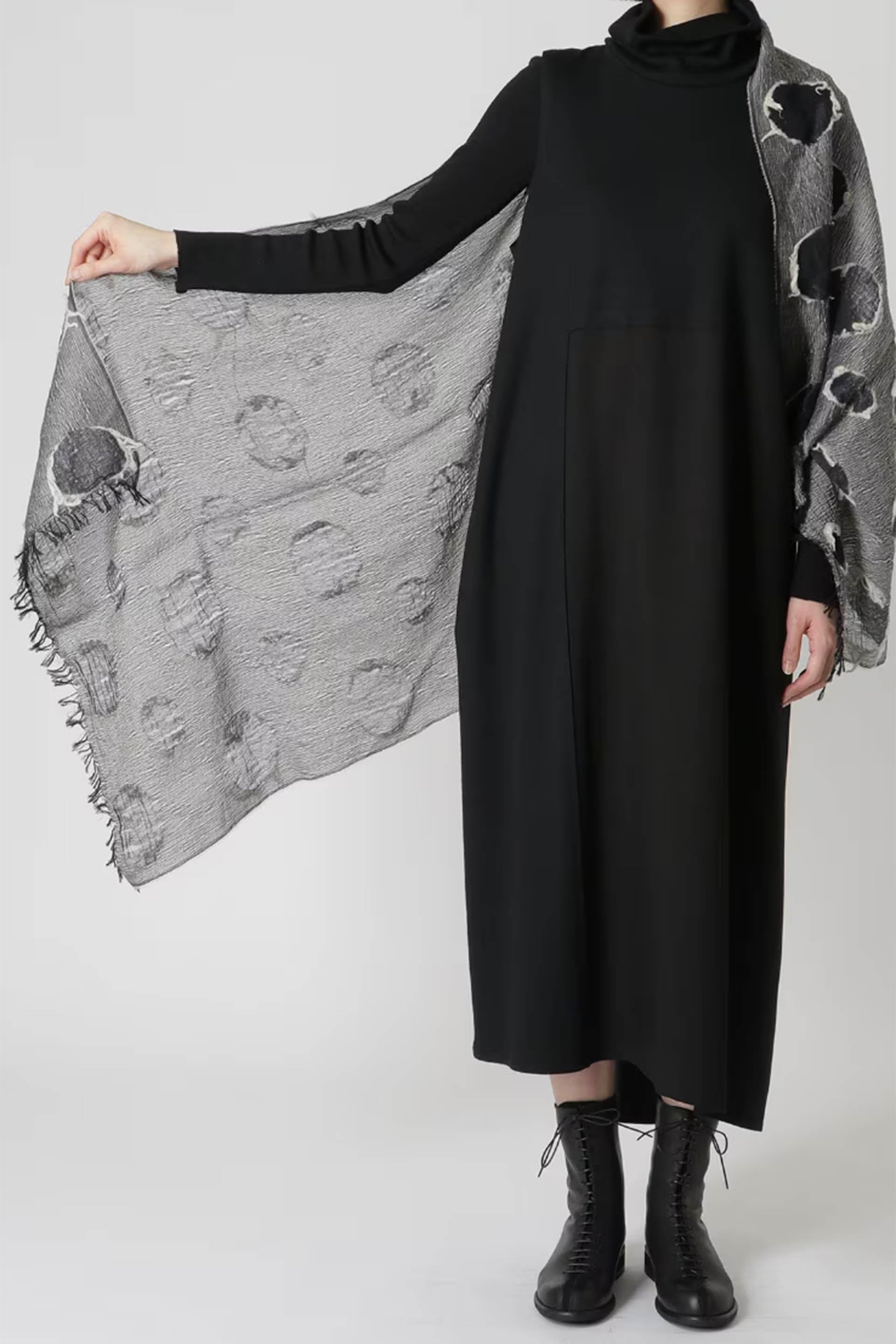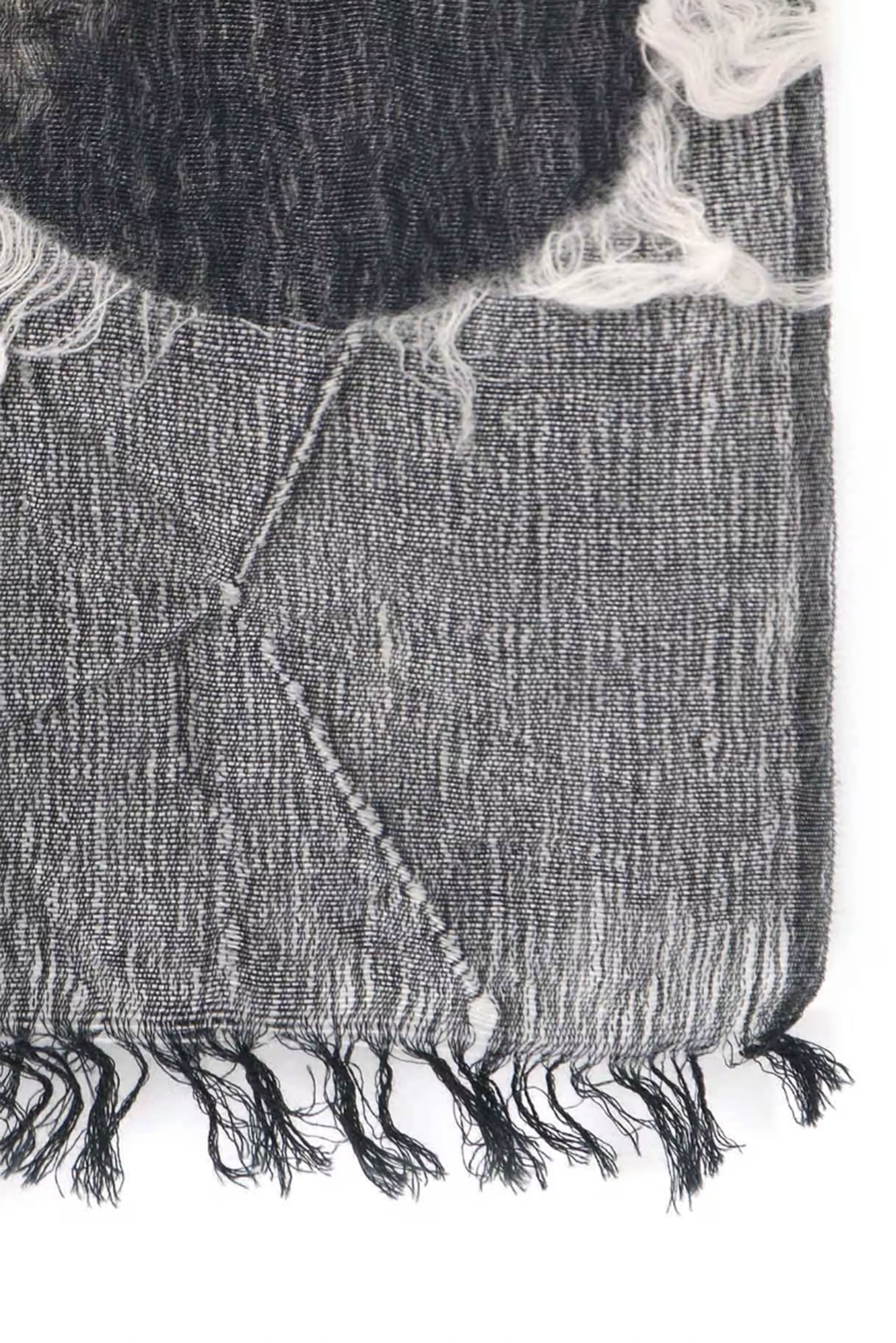 Cut jacquard stole woven with alternating cotton yarns in the warp and nylon and wool yarns in the weft. Large dots stole. The shiny nylon yarn peeks out from the cut area, and full wool yarns round the edges.