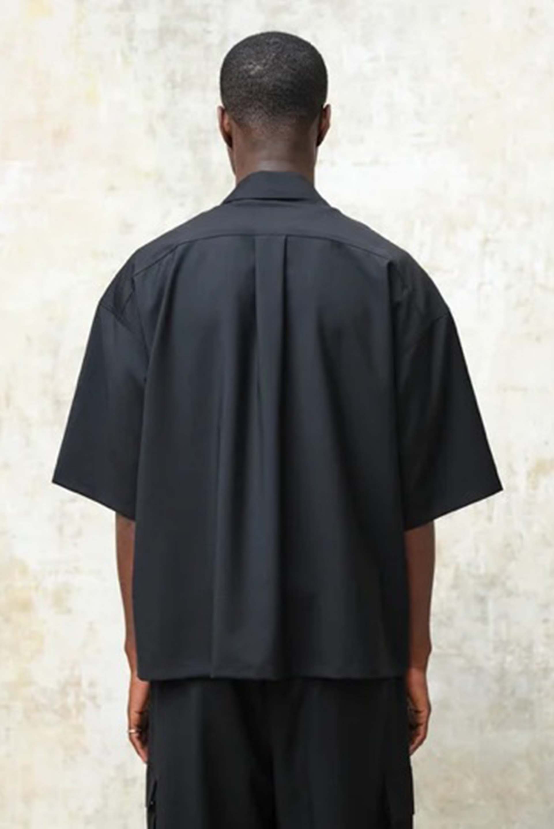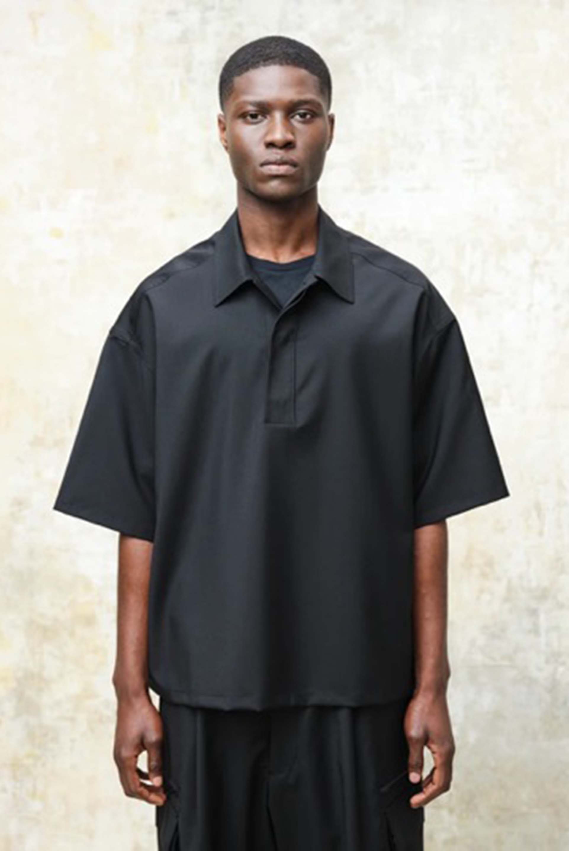 Lownn boxy polo in black. Short sleeves. Dropped shoulder. Signature boxy cut. Pleated at back. Button closure at collar.
